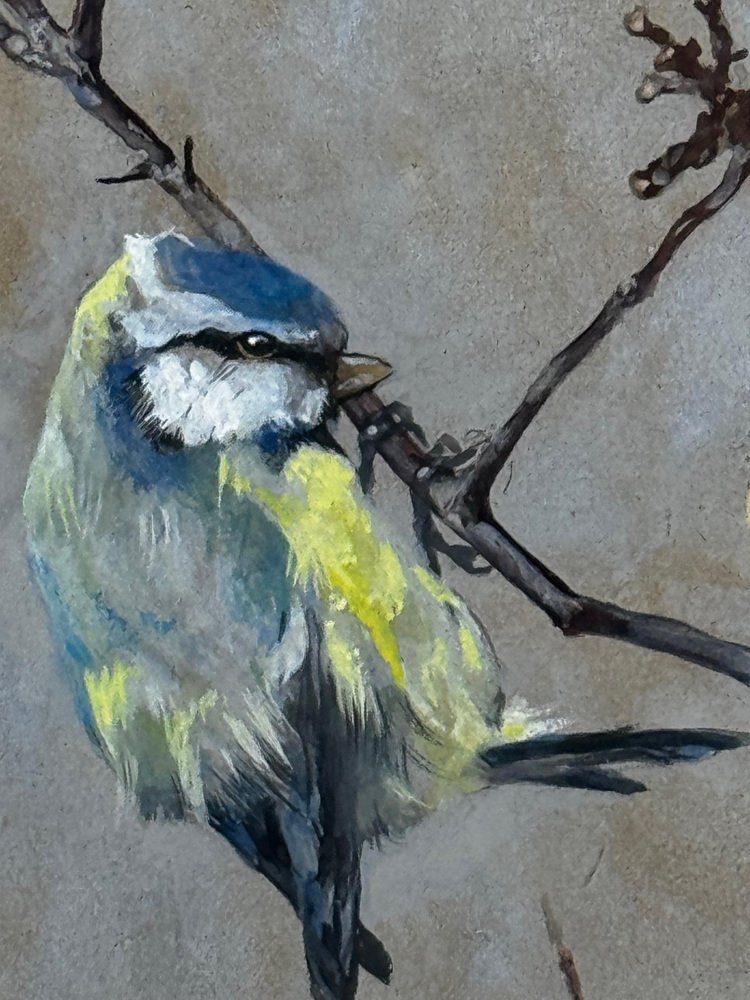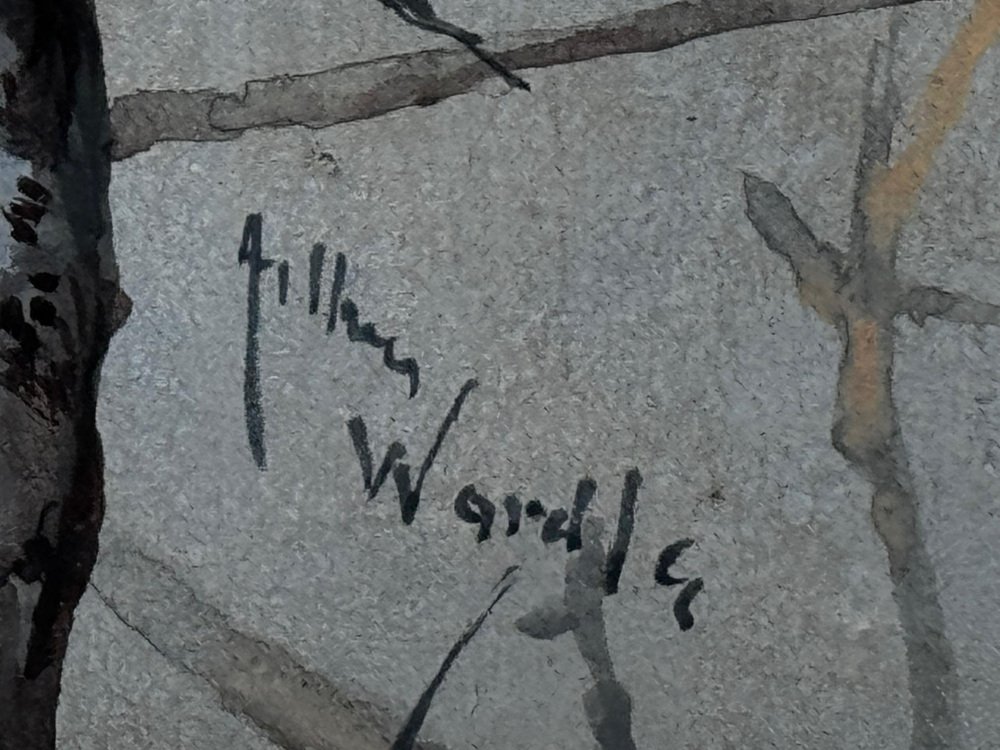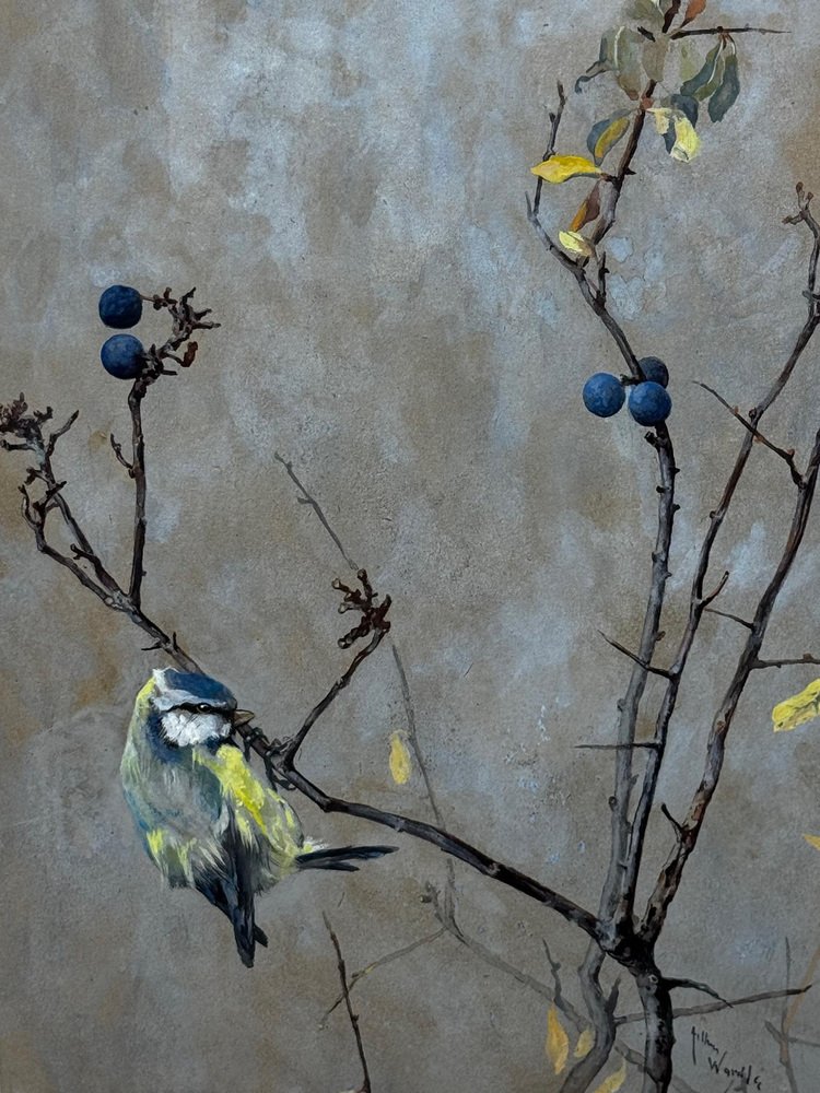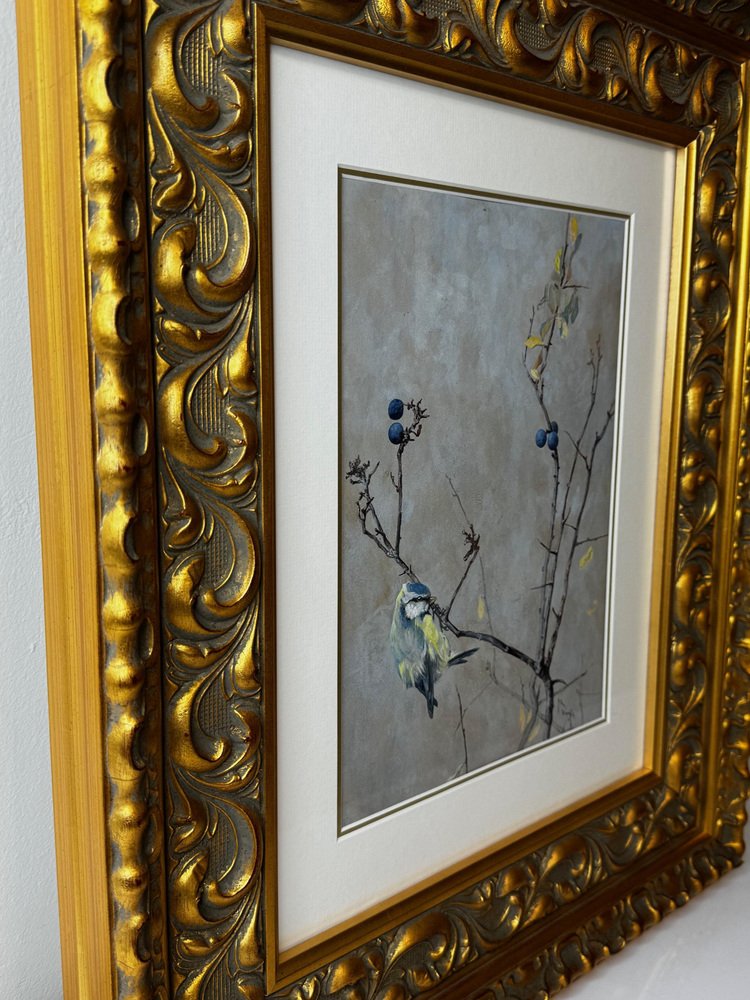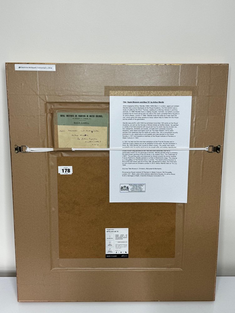 Beginning of 20th Century Victorian British Watercolour Painting Apple Blossom and Blue Tit Bird by Arthur Wardle 1860-1949. Impress your Beginning of 20th Century Victorian British Watercolour Painting Apple Blossom and Blue Tit Bird by Arthur Wardle 1860-1949. Impress your guests & clients in your home or office with this rather pretty fascinating ornithology masterpiece. Subject ornithology study of a beautiful cute Blue tit bird, which has vibrant colour hues of blue & turquoise, grey, white, light yellow, black & brown. The little bird in side profile is perched on an apple blossom tree hanging onto a lower branch, looking towards the right. Which has a few little dark blue coloured berries & some sparse leaves on. Title “Apple Blossom and Blue Tit” by Arthur Wardle. Medium is watercolour & bodycolour on paper, set in a recent white with gold border mount & AR70 protective glass on the front. Signed in the bottom corner by the known listed British artist Arthur Wardle. A fine rare example of his work particularly as this is a bird study. Set in a recent traditional heavy decorative gilt moulded Larson Julh LJE Item No 123360000 frame. Circa of the painting 1900 beginning of the 20th century end of Victorian era. A nice display size with the frame being 55.5 cm wide and 63.5 cm high. Artist biography Arthur Wardle (1860-1949) Born in London, aged just sixteen Wardle had a piece displayed at the Royal Academy. His first exhibit was a study of cattle by the River Thames, leading to a lifelong interest in painting animals. In 1880 Wardle lived in Oakley Square, Camden, but artistic success enabled him to move along with his wife to the more upmarket Alma Square in St John's Wood, London in 1892. Wardle loved this area as it was near the zoo, which gave him easy access to study nature help to make him the finest animal artists of his generation. Wardle was prolific until 1936 he exhibited more than 100 works at the Royal Academy, as well as the Society of British Artists at Suffolk Street. He painted a variety of animal subjects with equal skill but his work may be divided into two categories, domestic and exotic; animals from overseas including leopards, polar bears and tigers such as The Deer-Stealer (1915) were painted from sketches that he made at London Zoo. He is considered equally proficient in oils, watercolours and pastels and was elected to the Pastel Society in 1911 and became a member of the Royal Institute of Painters in Water Colours in 1922. In 1931 he held his first one-man exhibition at the Fine Art Society and in 1935 the Vicar's Gallery put on an exhibition of his work. He also exhibited in Paris. By 1936 Wardle had moved to West London. His career was highly successful and his works continue to be sought after and widely reproduced on postcards, calendars and boxes of chocolates. He remains one of the widely known dog painters of the 19th and 20th centuries. The highest sold price at auction is $510,978 US Dollars for a painting that sold at Christie's in London. Arthur Wardle died on 16 July 1949. Sources see Tate Museum, Christie’s & Bonhams. Provenance Royal Institute Of Painters In Water Colours 195 Piccadilly, London, W.1. Back Label, Artist address label Alma Square, St Johns Wood, N.W 8. Highly sought after due to the collectible nature of the ornithology subject matter. with new hanging thread on the back ready for immediate home wall display. We only select & sell paintings based upon subject, quality & significance. Dimensions in centimetres of the frame High (63.5 cm) Wide (55.5 cm) Depth thickness of frame (5 cm) less