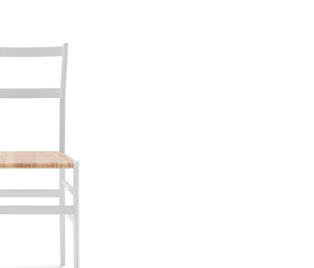 Gio Ponti Frassino Tinto Bianco Aswood Superleggera Chair For Cassina Der seit 1957 hergestellte Holzstuhl 699 Superleggera ist die seltene Kombination aus dem innovativen Streben des Architekten und den bahnbrechenden Experimenten des in Meda ansässigen Unternehmens und wurde zu einer unbestreitbaren Ikone und einem Meisterwerk der Modernität und extremen handwerklichen Eleganz. Ein Stuhl, für dessen Perfektionierung Gio Ponti Jahre brauchte, indem er den dreieckigen Querschnitt der Beine auf nur 18 Millimeter reduzierte, um das tatsächliche Mindestgewicht von nur 1.700 Gramm zu erreichen. STRUKTUR Struktur aus massiver Esche. BÄNKE mit dreieckigem Rohr von nur 18 Millimetern und einem Mindestgewicht von 1.700 Gramm. SITZ Gepolstert oder aus Rattan. Der 699 Superleggera, der seit 1957 im Cassina-Katalog zu finden ist, stellt die perfekte Verbindung zwischen der kreativen Vorstellungskraft des Architekten Gio Ponti und der hohen Fertigungsqualität von Cassina dar. Er ist eine unbestrittene Ikone, die sowohl zeitgemäß ist als auch der traditionellen Handwerkskunst Tribut zollt. Superleggera beweist die konstruktiven Fähigkeiten der Handwerker von MedaMade: Die Herausforderung, einen besonders leichten Stuhl zu bauen, wurde gemeistert, indem die Beine des Superleggera einen Querschnitt von nur achtzehn Millimetern haben und das Ganze nur 1.700 Gramm wiegt! Während das Gestell die Leichtigkeit und Biegsamkeit des Eschenholzes ausnutzt, ist die Sitzfläche aus Buche gefertigt, die eine engere Maserung aufweist und stärker ist. Die Holzteile werden maschinell hergestellt und von Hand bearbeitet, wobei der Leim mit einem Pinsel aufgetragen und der Überschuss abgewischt wird und die Sitzfläche von Hand geflochten wird. Auf diese Weise verbinden sich handwerkliches Können und industrielle Innovation zu einem "Spitzenobjekt", das von der Tradition der Stuhlherstellung in Chiavari in Ligurien, Norditalien, geprägt ist. Der Superleggera ist sowohl in der klassischen Version als auch mit farbigen Beinen und mit gepolstertem Sitz erhältlich. Wichtige Informationen zu den Produktabbildungen: Bitte beachten Sie, dass einige der Bilder andere Farben und Variationen des Modells zeigen, diese Bilder dienen nur dazu, Einrichtungsvorschläge zu präsentieren. Der Artikel, der verkauft wird, ist auf dem ersten Bild zu sehen.
