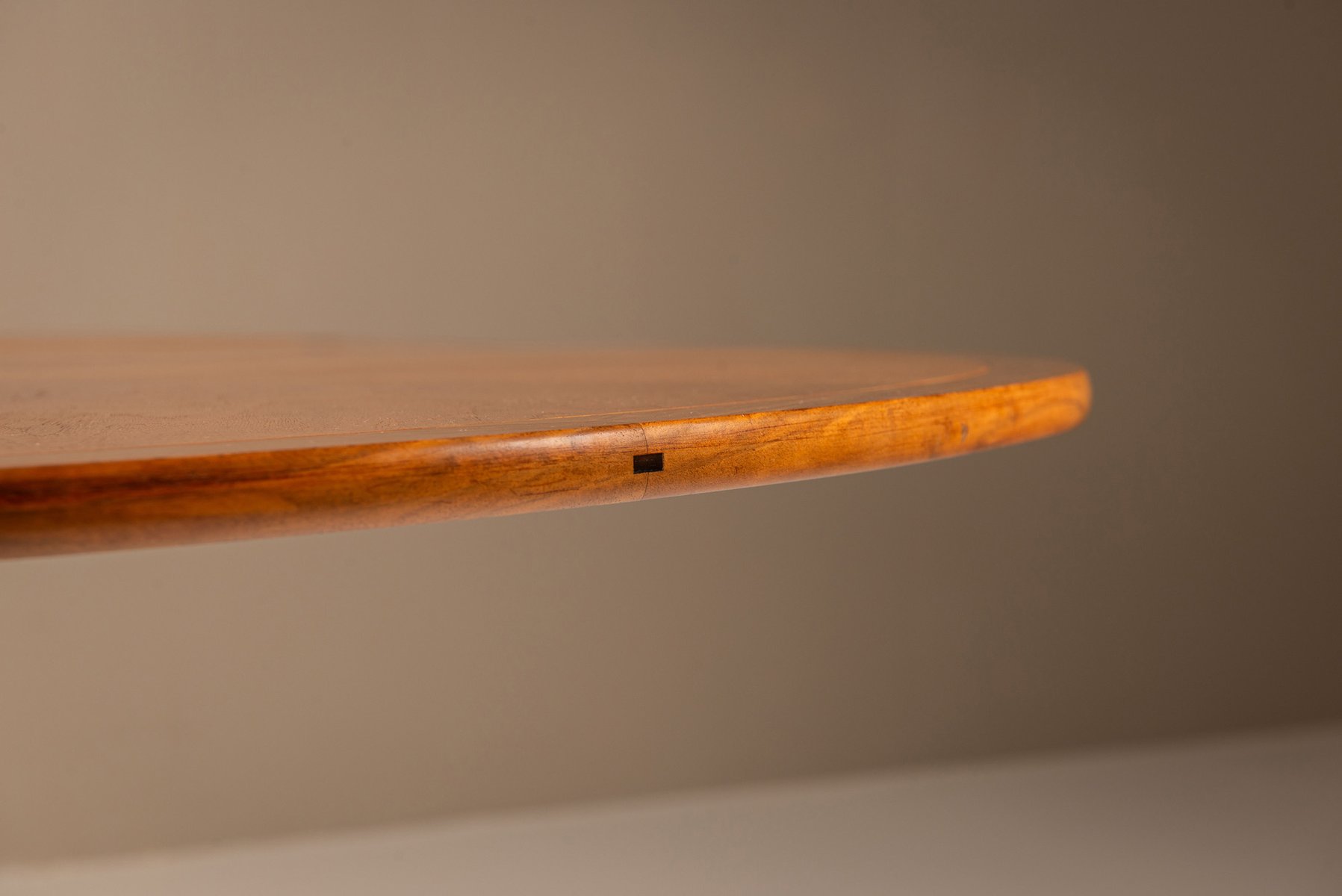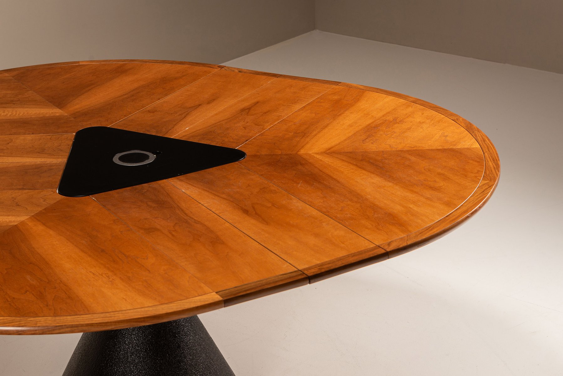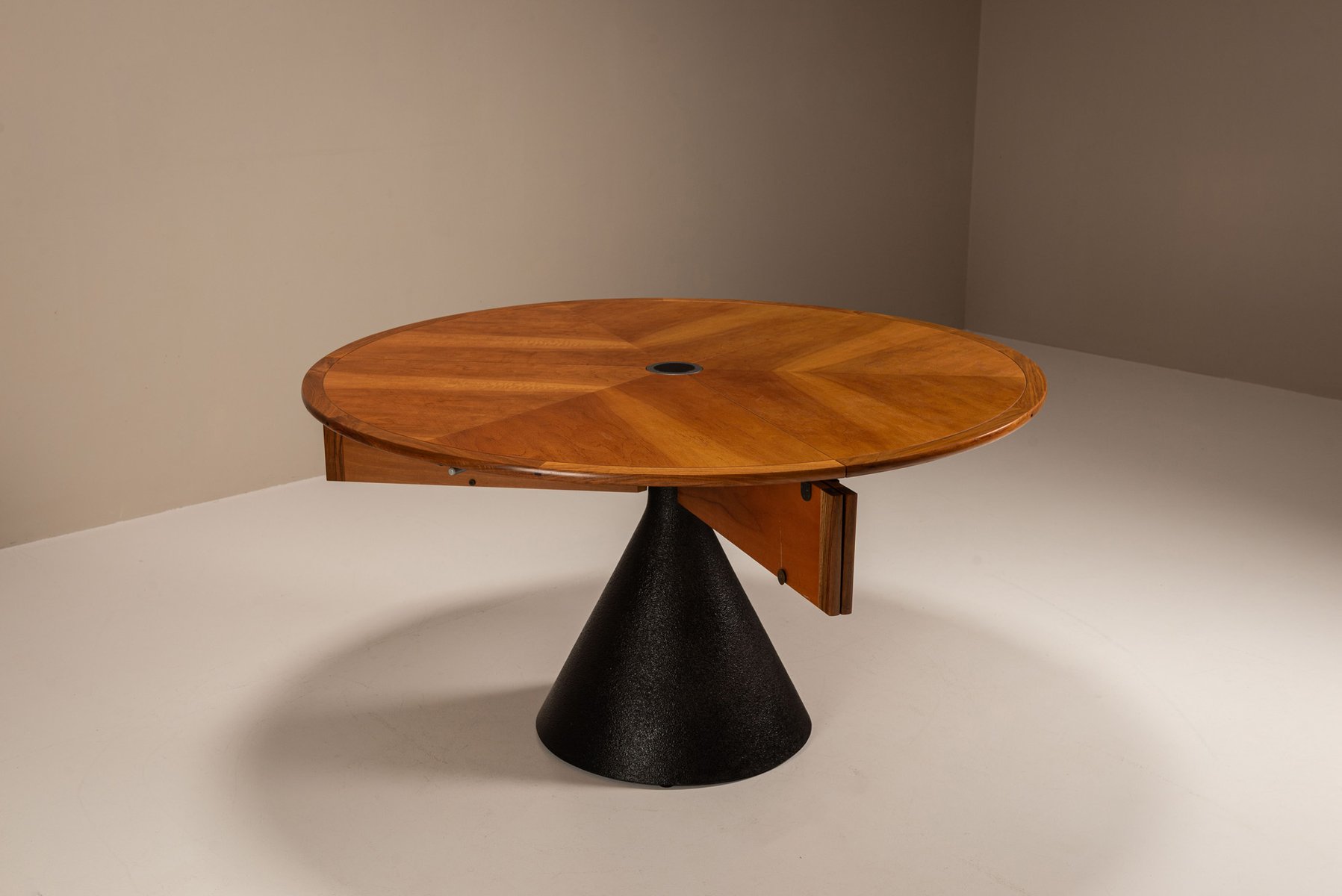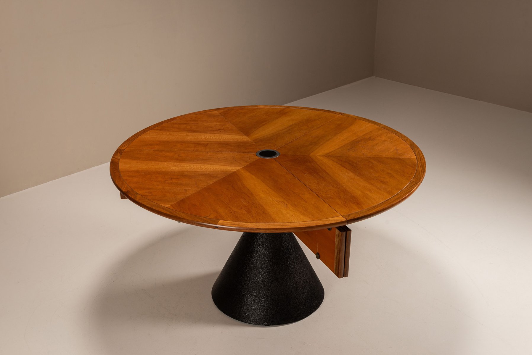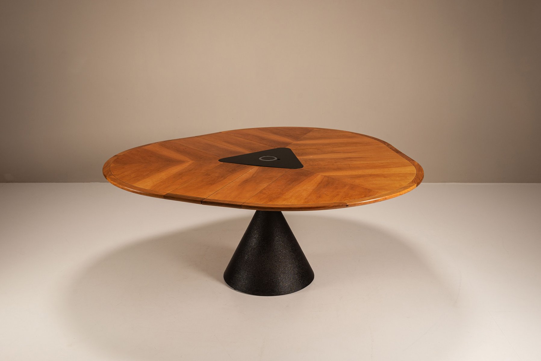 Im Mittelpunkt des Entwurfs steht eine dreiteilige, drehbare Platte aus Kirschbaumfurnier, die von einer zentralen Achse ausgeht. Mit einer sanften, technisch ausgefeilten Bewegung öffnet sich die Tischplatte in einer fächerartigen Geste und gibt drei innere Blätter frei. Diese schwenken nach oben und vollenden die Verwandlung von einem kompakten runden Tisch in ein organisches, abgerundetes Dreieck, das bequem Platz für sechs bis neun Personen bietet.