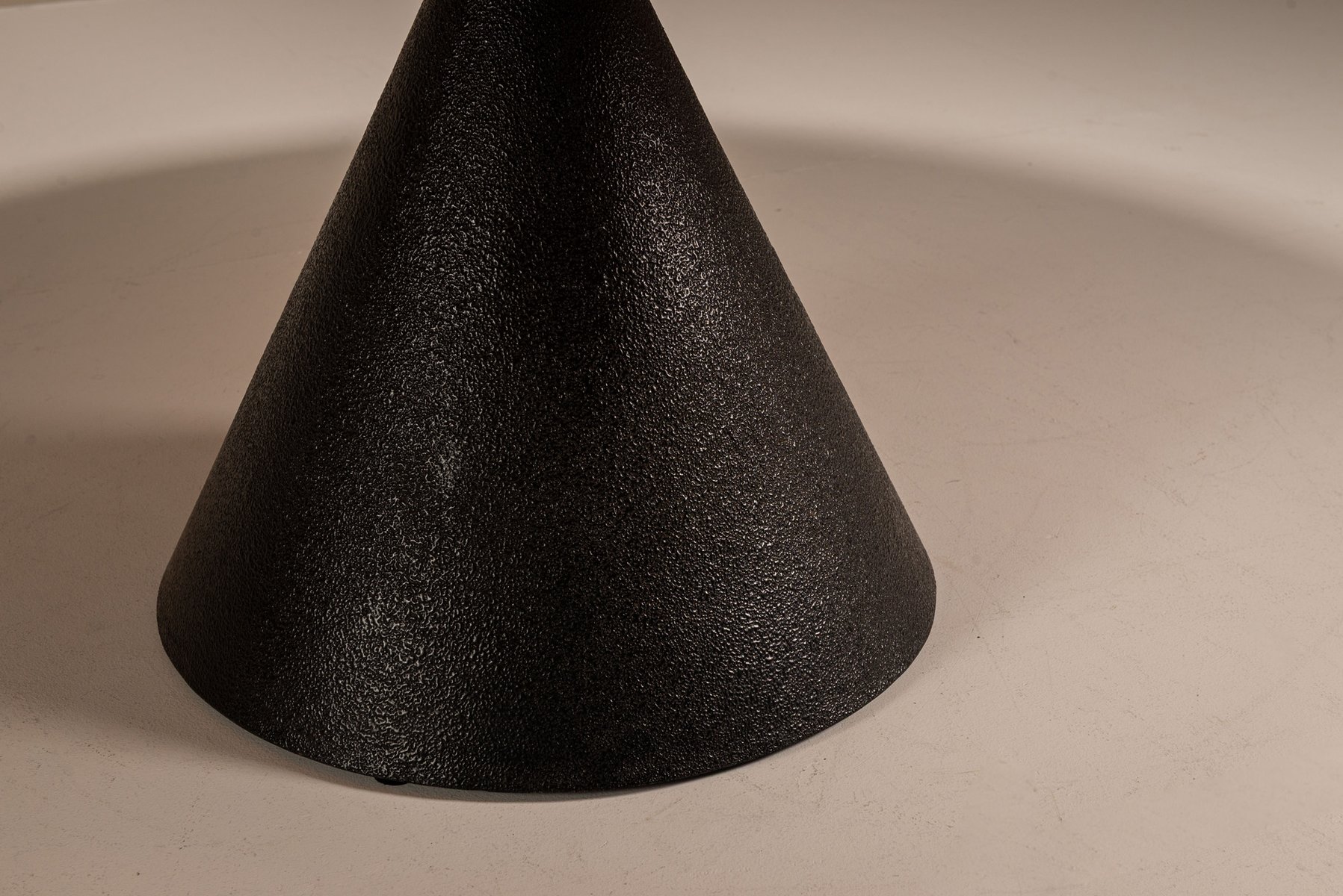 The mechanical core is housed in a central triangular insert, detailed with a circular finger recess that allows precise engagement with the mechanism. Beneath, a steel textured black lacquered cone base anchors the composition and introduces sculptural contrast.