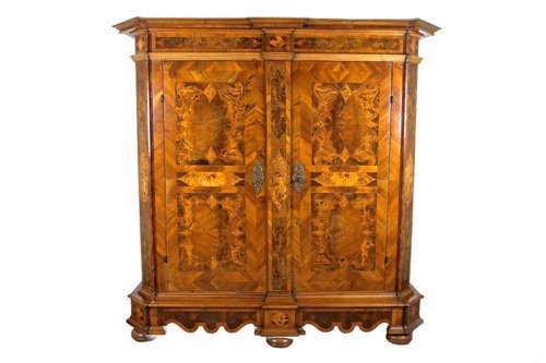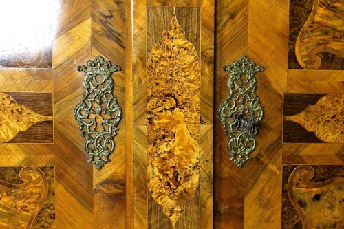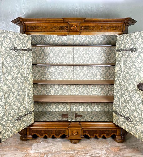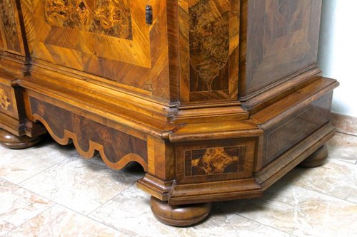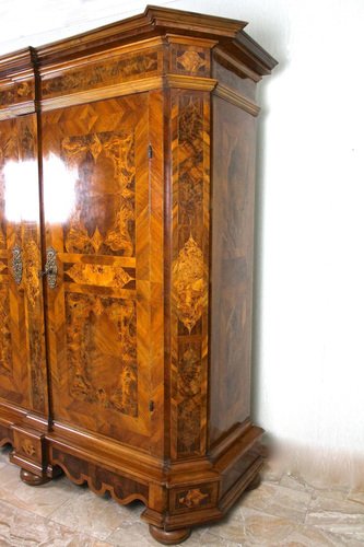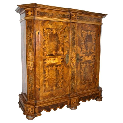 Remarkable 18th century nutwood baroque cabinet out of Austria around 1770. This absolutely artfully handcrafted baroque cabinet was part of the inventory of a private castle - more precisely of the chapel. The elaborate set veneer works create amazing looking patterns - a true masterpiece of baroque furniture. Beside the gorgeous inlayed frame works (made of nutwood, burl walnut, poplar, maple and fruitwood) which can be found all over this over 250 year old baroque cabinet, the extraordinary designed base is a real highlight and absolutely matchless. The large front doors can be wide opened and still keep the original, fully functional massive hand forged lock - additionally adorned by incredible chased ornamentations. Also the locking mechanisms for the left wing of the double door is still the original one. This valuable 18th century baroque cabinet provides much storage space, divided into five large compartments. A traditional hand polished shellac finish and artfully open worked brass applications complete the incredible look and make this rare baroque cabinet an eye-catching piece of baroque furniture - furthermore a real smart investment for the future. A one of a kind 18th century baroque cabinet coming in great old restored condition.