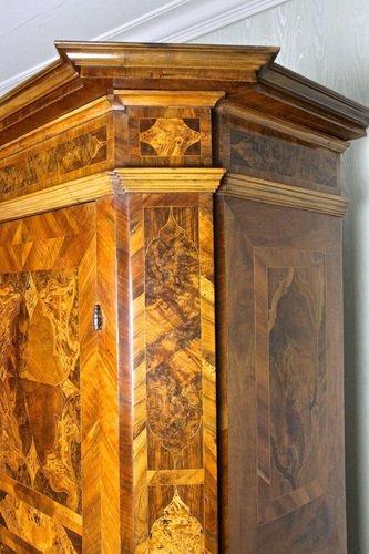 Bemerkenswerter Barockschrank aus Nussbaumholz aus Österreich, um 1770. Dieser absolut kunstvoll handgefertigte Barockschrank war Teil des Inventars eines privaten Schlosses – genauer gesagt der Kapelle. Die aufwendigen Furnierarbeiten bilden beeindruckende Muster – ein wahres Meisterwerk der Barockmöbelkunst. Neben den prächtigen Intarsienarbeiten (aus Nussbaum, Walnussmaser, Pappel, Ahorn und Obstbaumholz), die sich über den gesamten über 250 Jahre alten Barockschrank erstrecken, ist der außergewöhnlich gestaltete Sockel ein echtes Highlight und absolut unvergleichlich. Die großen Fronttüren lassen sich weit öffnen und verfügen noch immer über das originale, voll funktionsfähige, massive, handgeschmiedete Schloss, das zusätzlich mit unglaublichen Zierverzierungen verziert ist. Auch die Schließmechanismen für den linken Flügel der Doppeltür sind noch original. Dieser wertvolle Barockschrank aus dem 18. Jahrhundert bietet viel Stauraum, der in fünf große Fächer unterteilt ist. Eine traditionelle, handpolierte Schellackoberfläche und kunstvoll durchbrochene Messingapplikationen vervollständigen das unglaubliche Aussehen und machen diesen seltenen Barockschrank zu einem auffälligen Barockmöbelstück – darüber hinaus zu einer wirklich klugen Investition für die Zukunft. Ein einzigartiger Barockschrank aus dem 18. Jahrhundert in einem großartigen, restaurierten Zustand.