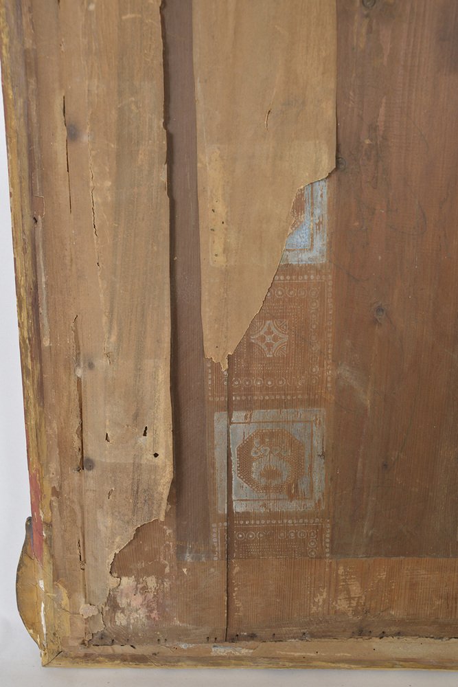 Auf der Rückseite befindet sich ein starker Draht zum Aufhängen und ein Hinweis auf ein antikes Papierinlett mit zeitgenössischer Werbung aus Brüssel. Der Rahmen ist stellenweise beschädigt, was den Charakter des Stücks meiner Meinung nach nur noch verstärkt. Das Stück ist sehr stabil und weist eine ehrliche Patina auf.