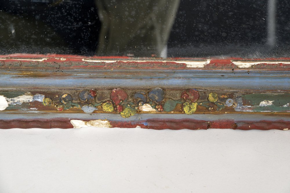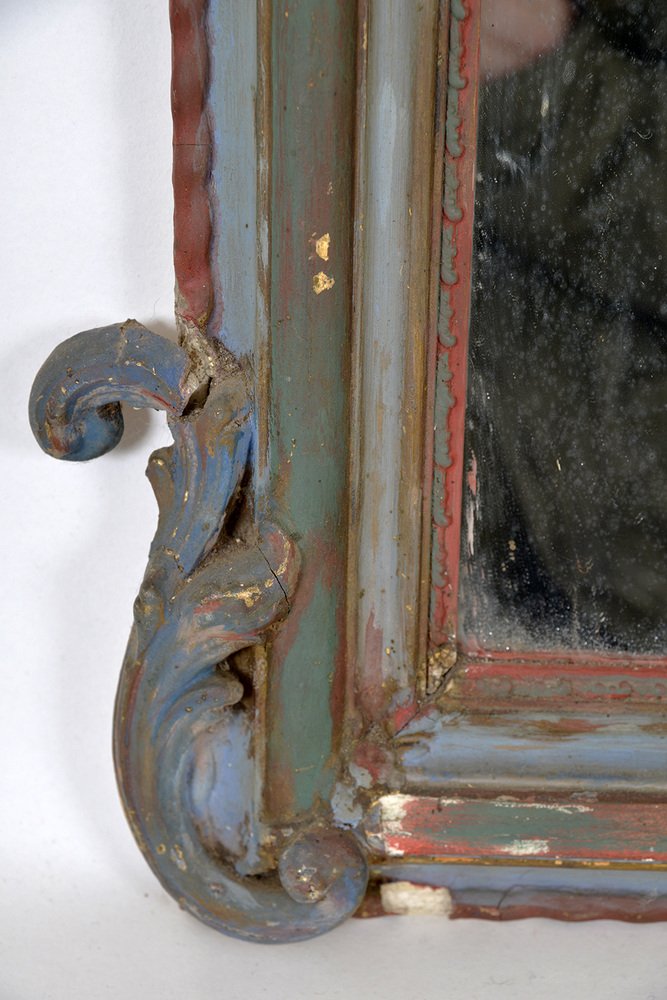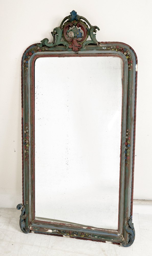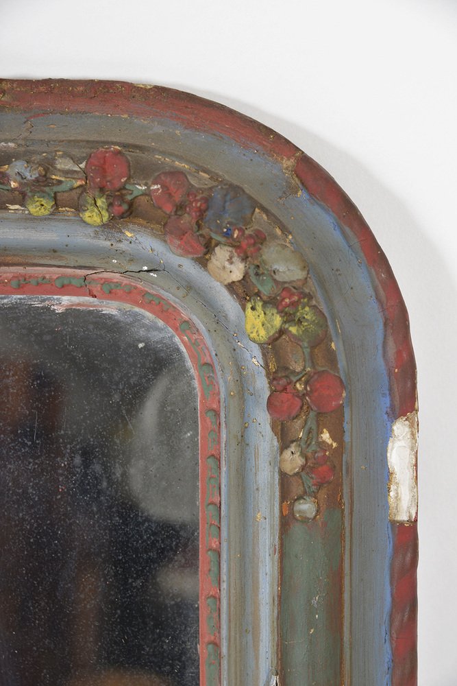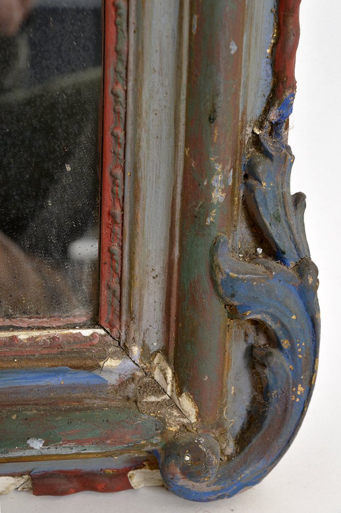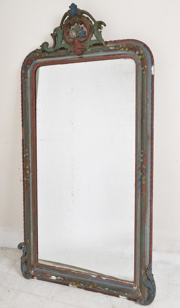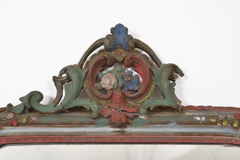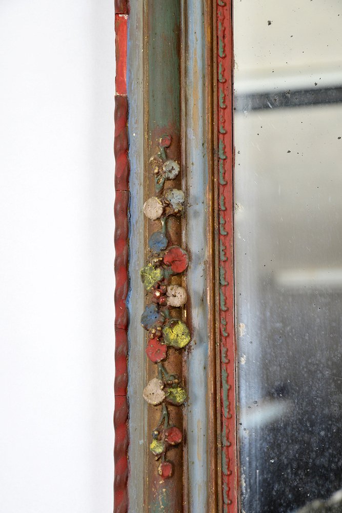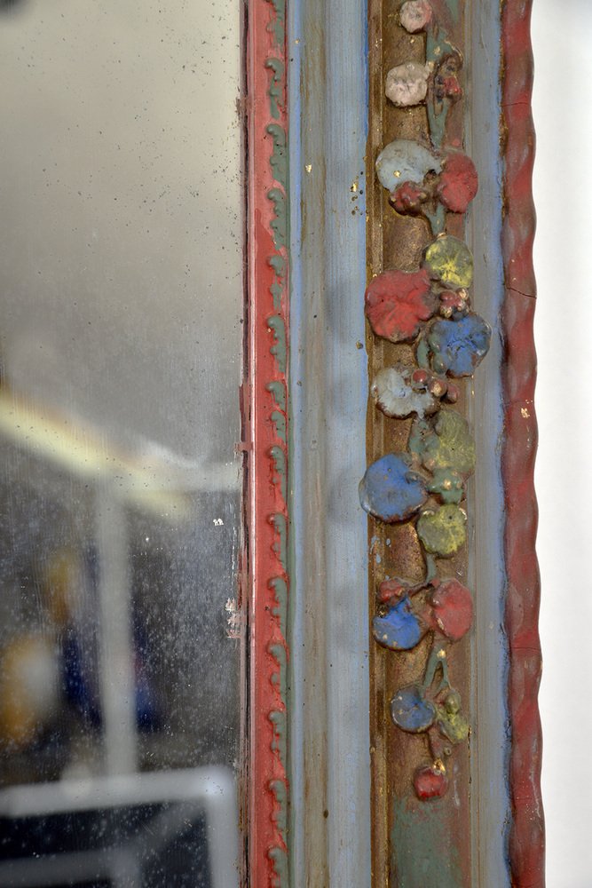 der Rahmen ist mit einer schönen, gemalten Gipsdekoration aus zarten Blumen, Fleur-de-lis, Akanthusblattverzierungen und einer Seilkante verziert. Die gedämpften Grün-, Grau-, Gelb-, Blau- und Rottöne dieses Spiegels ermöglichen es ihm, sich in alle Arten von Dekorationen einzufügen - ein großes Schmuckstück und ein seltener dekorativer Fund.