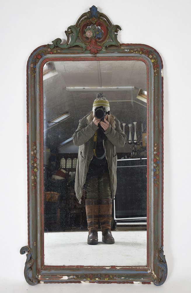 lovely painted plaster decoration comprising of delicate flowers, Fleur-de-lis, scrolling acanthus leaf embellishments and rope edge. The greens, greys, yellows, blues and red muted tones of this mirror enable it to fit in with all kinds of décor - a large statement piece and a rare decorative find.