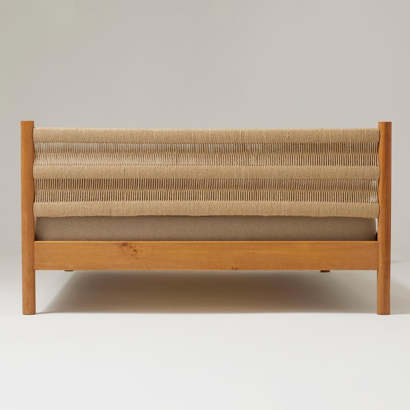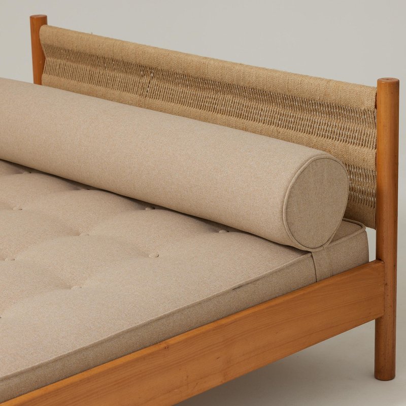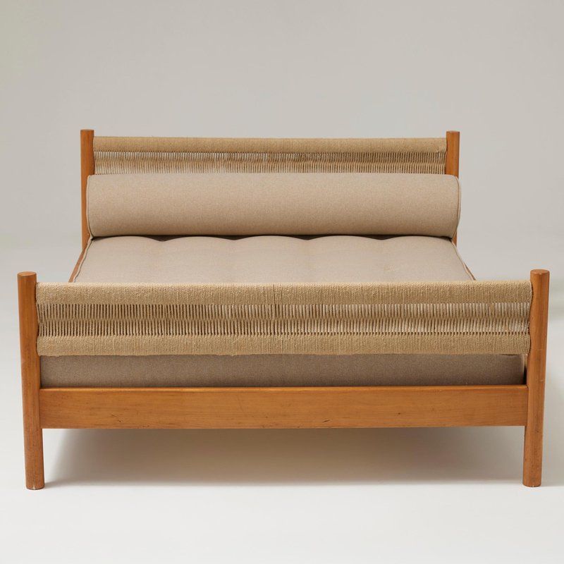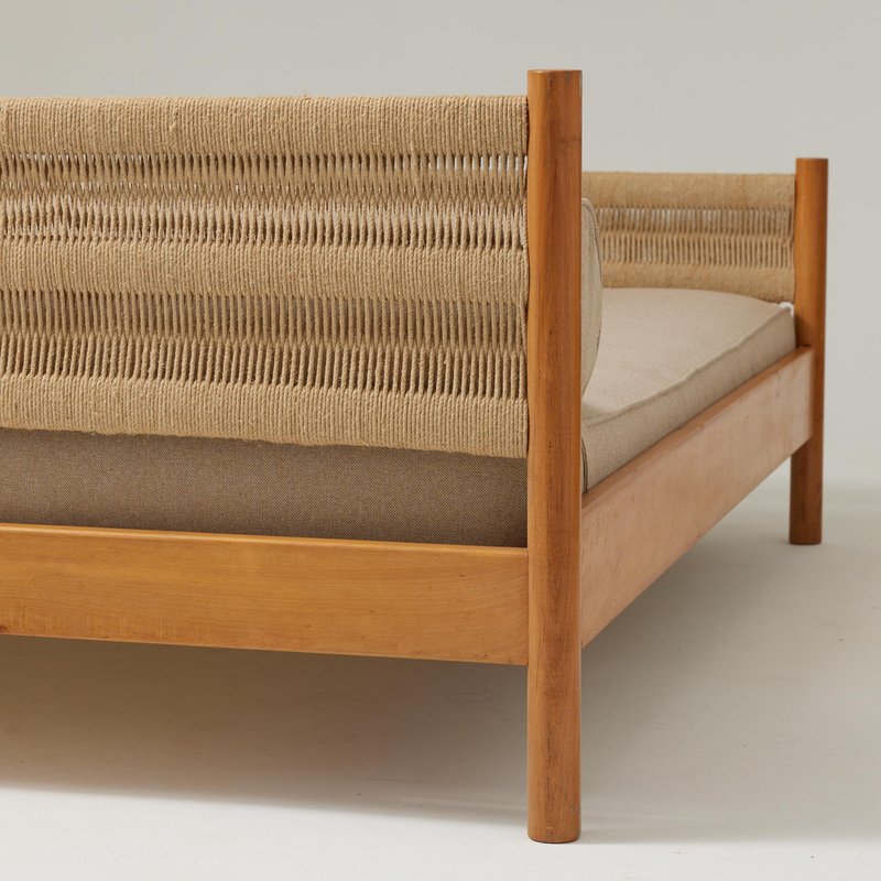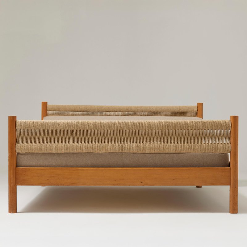 Bett, entworfen von Charlotte Perriand für Meribel, um 1960. Hergestellt in Frankreich. Kiefernholz und Seil In gutem Originalzustand mit geringen alters- und gebrauchsbedingten Abnutzungserscheinungen, die eine schöne Patina erhalten haben. Charlotte Perriand (1903-1999). Sie wurde 1903 in Paris geboren und besuchte von 1920 bis 1925 die École de l'Union centrale des Arts décoratifs. Charlotte Perriand entwirft Möbel aus eloxiertem Aluminium und verchromtem Stahl, die sie 1927 auf dem Salon d'Automne in Paris ausstellt. Nachdem sie Le Corbusier kennengelernt hatte, arbeitete Charlotte Perriand bis 1937 mit ihm und Pierre Jeanneret zusammen. Die von den dreien entworfenen revolutionären Stahlrohrmöbel und Systemmöbel wurden als Équipement de l'habitation (Wohnungseinrichtung) auf dem Salon d'Automne 1929 vorgestellt und fanden großen Anklang. 1930 wurde in Paris die Union Des Artistes Modernes (UAM) gegründet, eine Gruppe, die sich als Gegenbewegung zu den etablierten Organisationen wie dem Salon d'Automne verstand und auch für Art Déco und Modernismus eintrat. 1931 stellte Charlotte Perriand dort ihre eigenen Werke als Einzelausstellung vor. 1937 entwirft Charlotte Perriand gemeinsam mit Pierre Jeanneret eine Berghütte aus Aluminiumblech, die sie auf der Exposition Internationale des Arts et Techniques dans la Vie Moderne ausstellt, und später entwickeln sie Pläne für Fertighäuser aus Aluminium. 1940 wurde Charlotte Perriand Designberaterin des japanischen Handelsministeriums. Sie lebte bis 1946 in Japan und von da an zeigen die Entwürfe von Charlotte Perriand Anklänge an das japanische Formgefühl, wie der Stuhl Synthèse des Arts von 1953 zeigt.