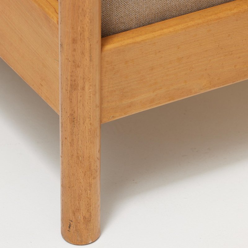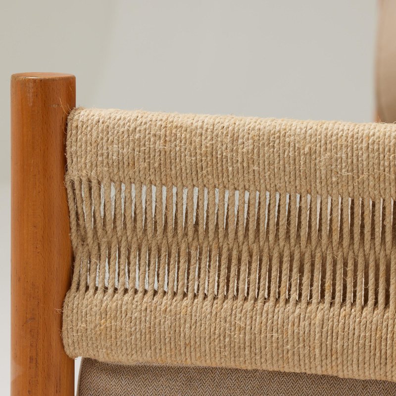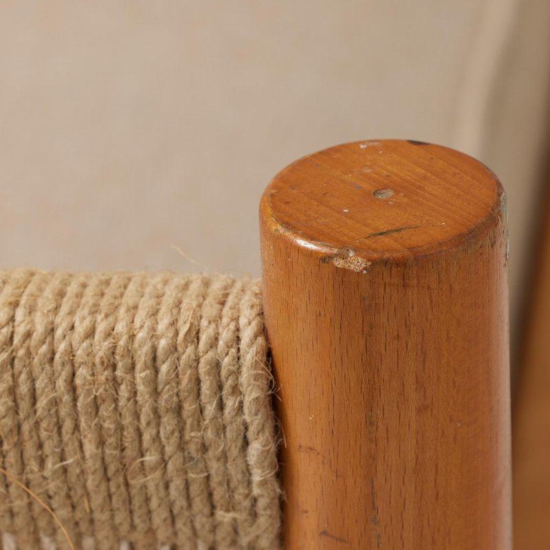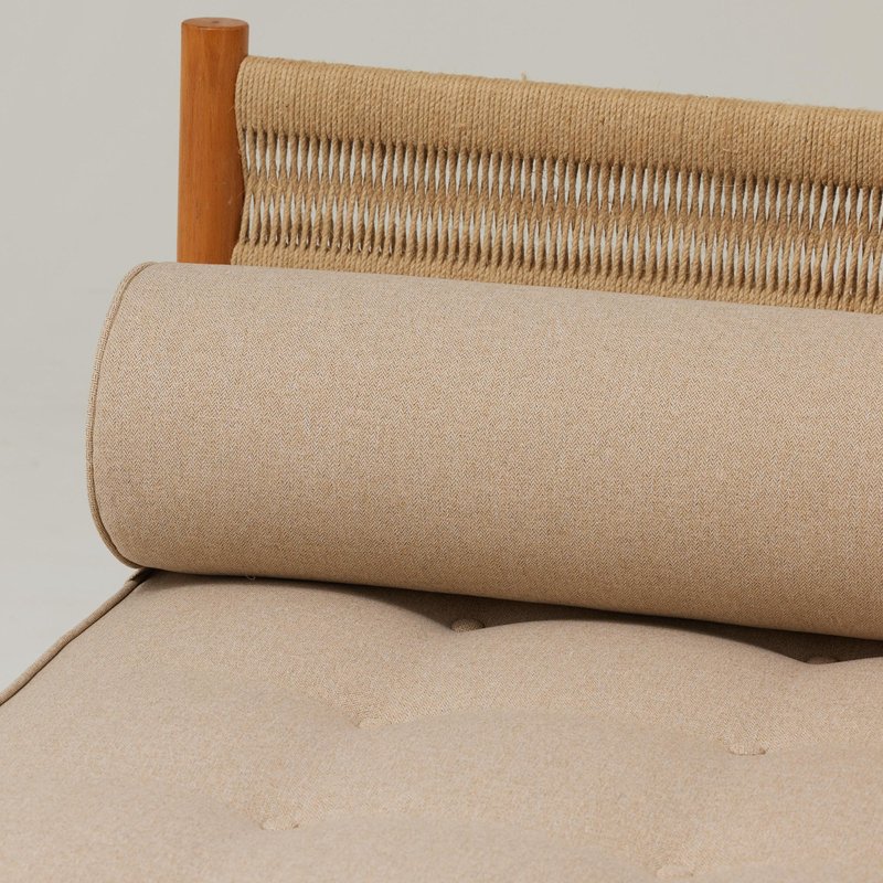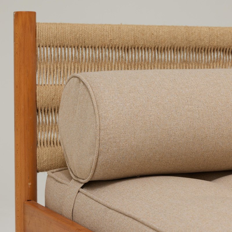 Bett, entworfen von Charlotte Perriand für Meribel, um 1960. Hergestellt in Frankreich. Kiefernholz und Seil In gutem Originalzustand mit geringen alters- und gebrauchsbedingten Abnutzungserscheinungen, die eine schöne Patina erhalten haben. Charlotte Perriand (1903-1999). Sie wurde 1903 in Paris geboren und besuchte von 1920 bis 1925 die École de l'Union centrale des Arts décoratifs. Charlotte Perriand entwirft Möbel aus eloxiertem Aluminium und verchromtem Stahl, die sie 1927 auf dem Salon d'Automne in Paris ausstellt. Nachdem sie Le Corbusier kennengelernt hatte, arbeitete Charlotte Perriand bis 1937 mit ihm und Pierre Jeanneret zusammen. Die von den dreien entworfenen revolutionären Stahlrohrmöbel und Systemmöbel wurden als Équipement de l'habitation (Wohnungseinrichtung) auf dem Salon d'Automne 1929 vorgestellt und fanden großen Anklang. 1930 wurde in Paris die Union Des Artistes Modernes (UAM) gegründet, eine Gruppe, die sich als Gegenbewegung zu den etablierten Organisationen wie dem Salon d'Automne verstand und auch für Art Déco und Modernismus eintrat. 1931 stellte Charlotte Perriand dort ihre eigenen Werke als Einzelausstellung vor. 1937 entwirft Charlotte Perriand gemeinsam mit Pierre Jeanneret eine Berghütte aus Aluminiumblech, die sie auf der Exposition Internationale des Arts et Techniques dans la Vie Moderne ausstellt, und später entwickeln sie Pläne für Fertighäuser aus Aluminium. 1940 wurde Charlotte Perriand Designberaterin des japanischen Handelsministeriums. Sie lebte bis 1946 in Japan und von da an zeigen die Entwürfe von Charlotte Perriand Anklänge an das japanische Formgefühl, wie der Stuhl Synthèse des Arts von 1953 zeigt.