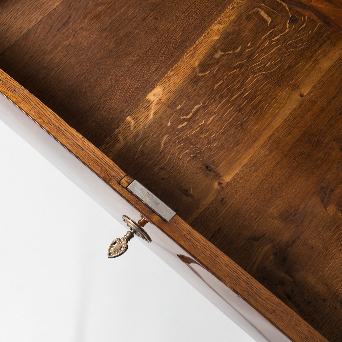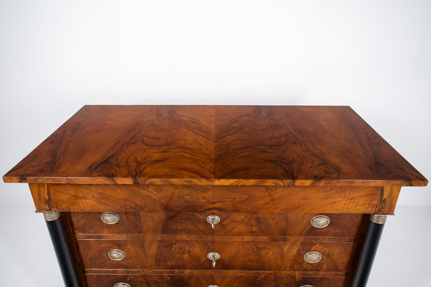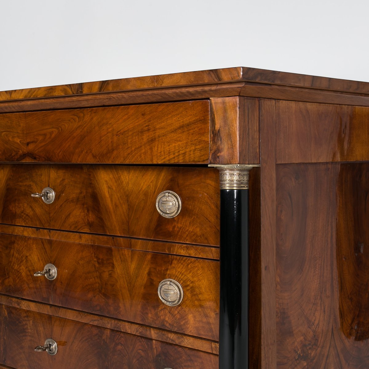 This Biedermeier chest of drawers comes from Germany and was made in 19th Century. It is veneered with beautiful walnut. It has undergone a careful renovation process in our workshop. Surface was refinished with shellac polish, applied by hand with a pad, which in addition to excellent visual effect, protects and nourishes wood. The piece features 3 spacious drawers, each one lockable with a key. Handles and locks are original. Elegant black columns with golden details decorate the chest on both sides. The chest is in very good condition, fully functional, ready to use. The construction is rigid and stabile. A beautiful piece to enrich any antiques collection and add a touch of elegance to any interior.