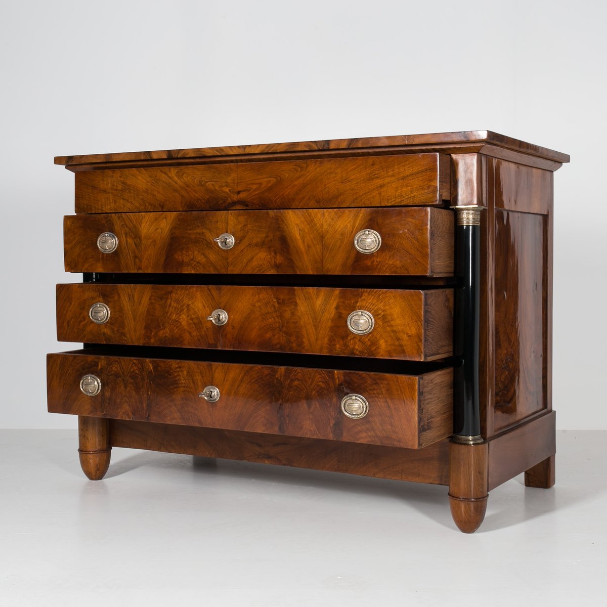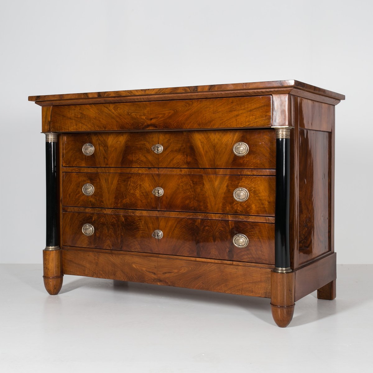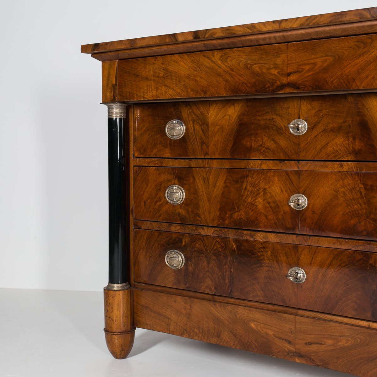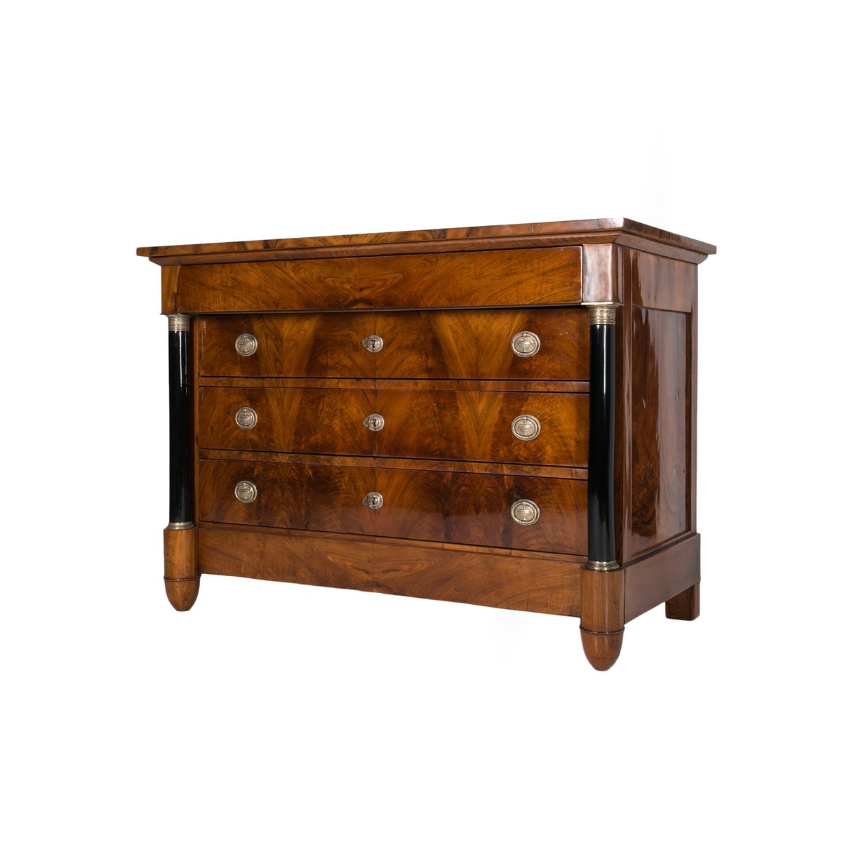 Diese Biedermeier Kommode kommt aus Deutschland und wurde im 19. Jahrhundert hergestellt. Sie ist mit schönem Nussbaum furniert. Sie wurde in unserer Werkstatt einer sorgfältigen Renovierung unterzogen. Die Oberfläche wurde mit einer Schellackpolitur aufgefrischt, die von Hand mit einem Pad aufgetragen wurde und neben der hervorragenden optischen Wirkung auch das Holz schützt und pflegt. Das Möbelstück verfügt über 3 geräumige Schubladen, von denen jede mit einem Schlüssel abschließbar ist. Die Griffe und Schlösser sind original. Elegante schwarze Säulen mit goldenen Details schmücken die Kommode auf beiden Seiten. Die Kommode ist in einem sehr guten Zustand, voll funktionsfähig und einsatzbereit. Die Konstruktion ist fest und stabil. Ein schönes Stück, das jede Antiquitätensammlung bereichert und jedem Interieur einen Hauch von Eleganz verleiht.
