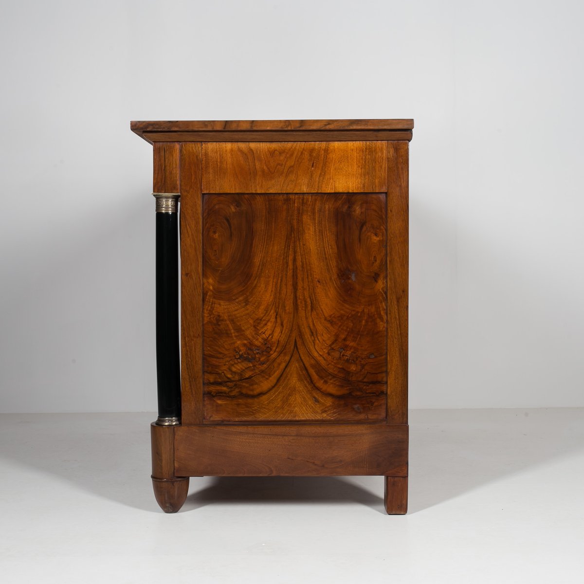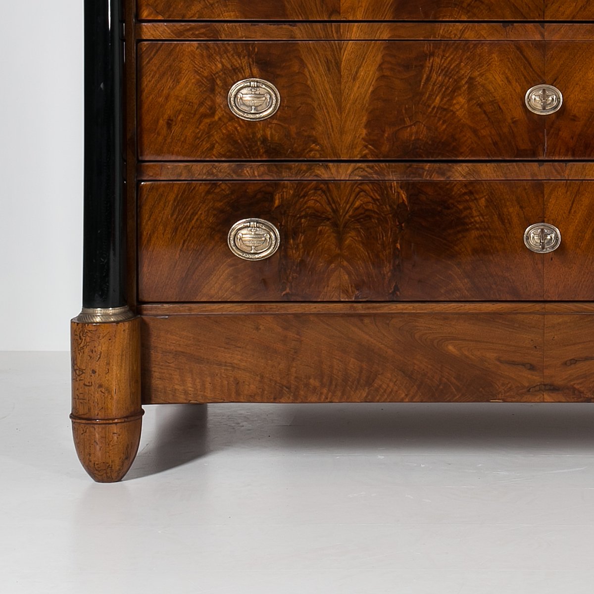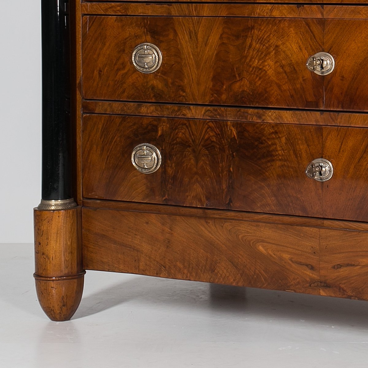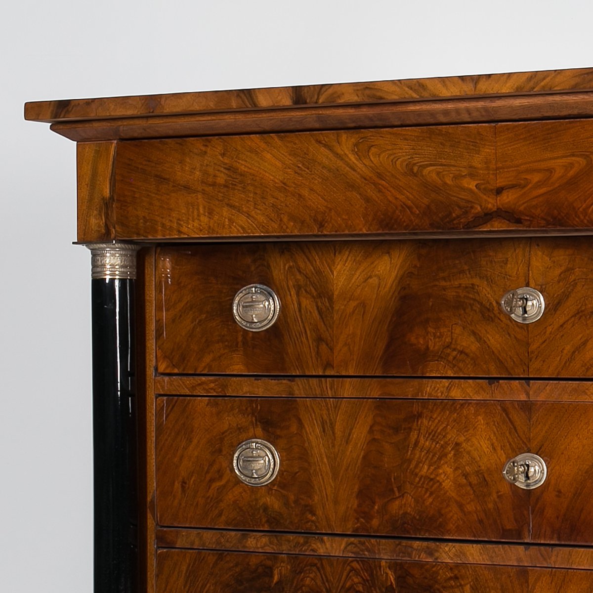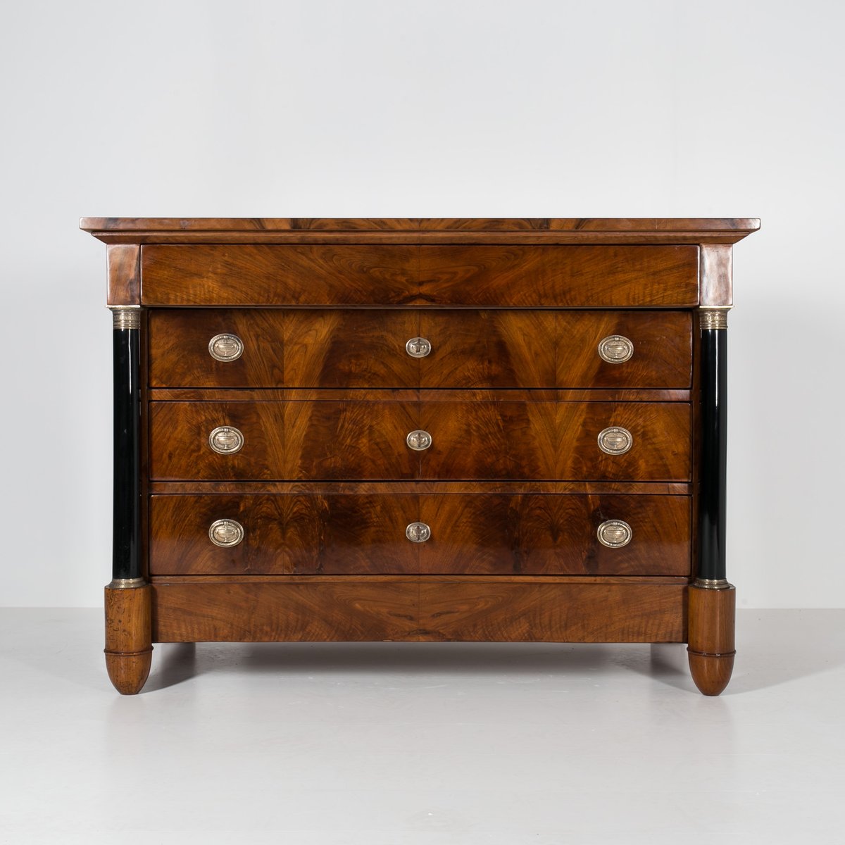 Diese Biedermeier Kommode kommt aus Deutschland und wurde im 19. Jahrhundert hergestellt. Sie ist mit schönem Nussbaum furniert. Sie wurde in unserer Werkstatt einer sorgfältigen Renovierung unterzogen. Die Oberfläche wurde mit einer Schellackpolitur aufgefrischt, die von Hand mit einem Pad aufgetragen wurde und neben der hervorragenden optischen Wirkung auch das Holz schützt und pflegt. Das Möbelstück verfügt über 3 geräumige Schubladen, von denen jede mit einem Schlüssel abschließbar ist. Die Griffe und Schlösser sind original. Elegante schwarze Säulen mit goldenen Details schmücken die Kommode auf beiden Seiten. Die Kommode ist in einem sehr guten Zustand, voll funktionsfähig und einsatzbereit. Die Konstruktion ist fest und stabil. Ein schönes Stück, das jede Antiquitätensammlung bereichert und jedem Interieur einen Hauch von Eleganz verleiht.