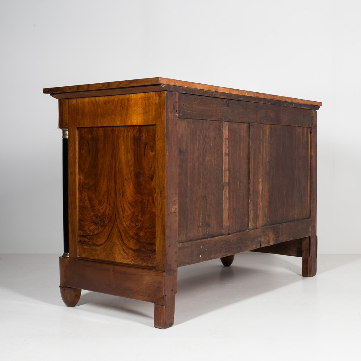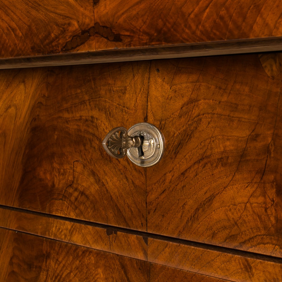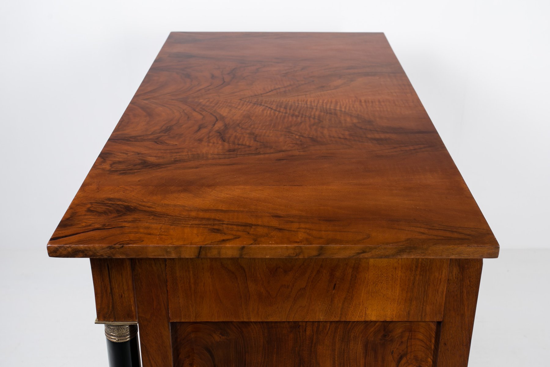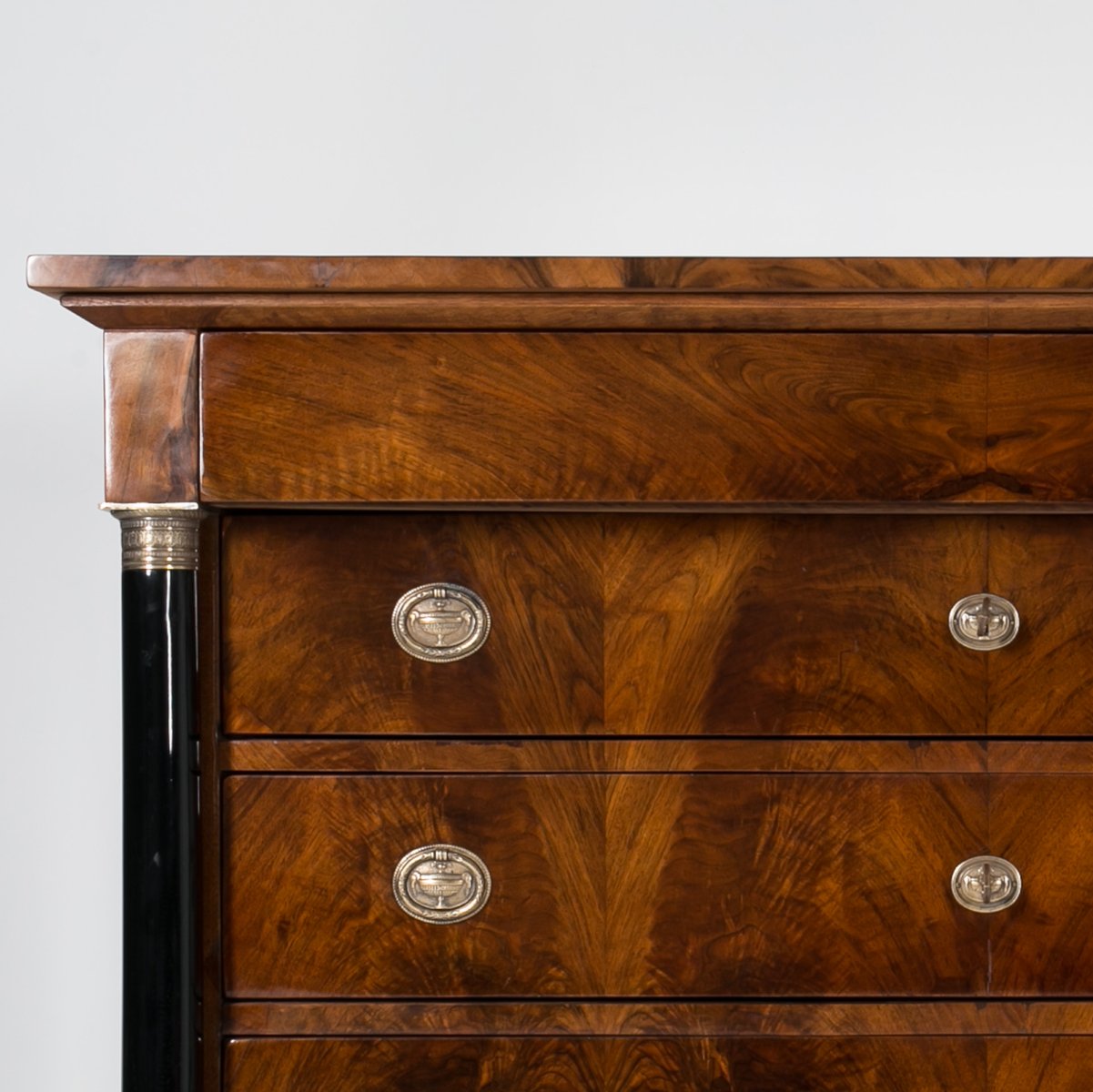 Diese Biedermeier Kommode kommt aus Deutschland und wurde im 19. Jahrhundert hergestellt. Sie ist mit schönem Nussbaum furniert. Sie wurde in unserer Werkstatt einer sorgfältigen Renovierung unterzogen. Die Oberfläche wurde mit einer Schellackpolitur aufgefrischt, die von Hand mit einem Pad aufgetragen wurde und neben der hervorragenden optischen Wirkung auch das Holz schützt und pflegt. Das Möbelstück verfügt über 3 geräumige Schubladen, von denen jede mit einem Schlüssel abschließbar ist. Die Griffe und Schlösser sind original. Elegante schwarze Säulen mit goldenen Details schmücken die Kommode auf beiden Seiten. Die Kommode ist in einem sehr guten Zustand, voll funktionsfähig und einsatzbereit. Die Konstruktion ist fest und stabil. Ein schönes Stück, das jede Antiquitätensammlung bereichert und jedem Interieur einen Hauch von Eleganz verleiht.