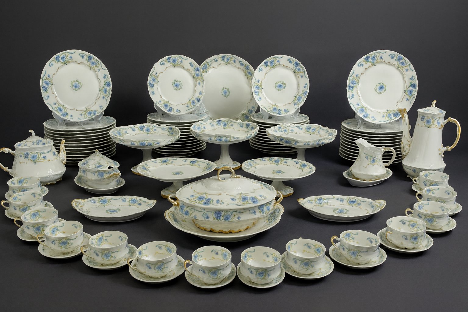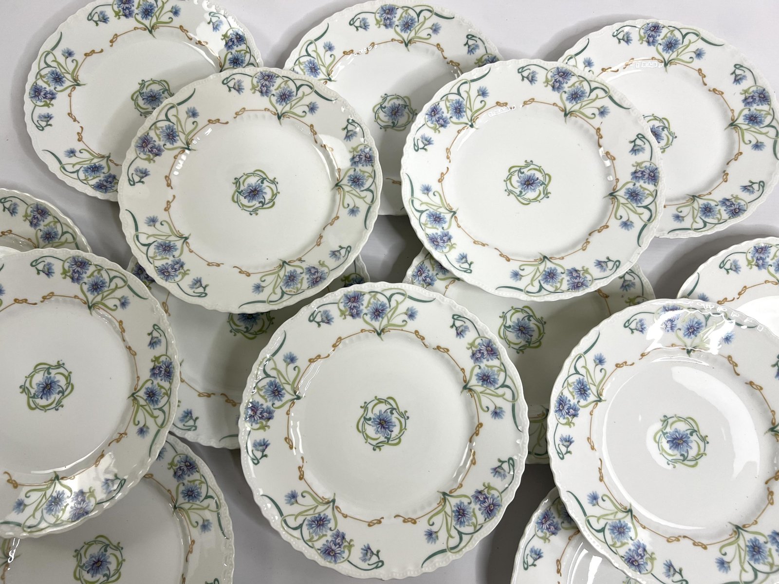 Tauchen Sie ein in die raffinierte Welt der französischen Belle Époque mit diesem prächtigen Tafelservice aus Limoges-Porzellan von Haviland, Modell "Bleuet", das mit zarten blauen Kornblumen und handvergoldeten Details verziert ist.