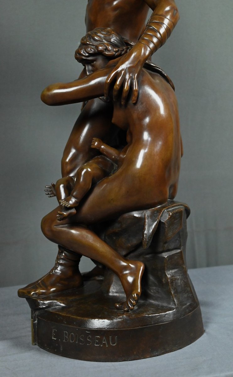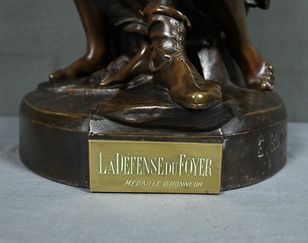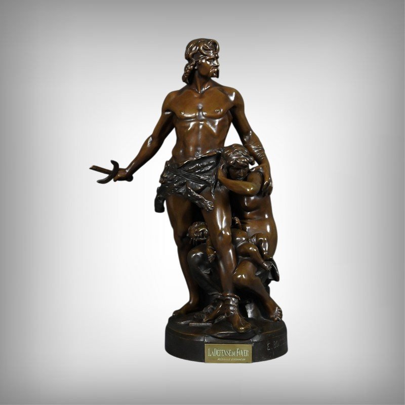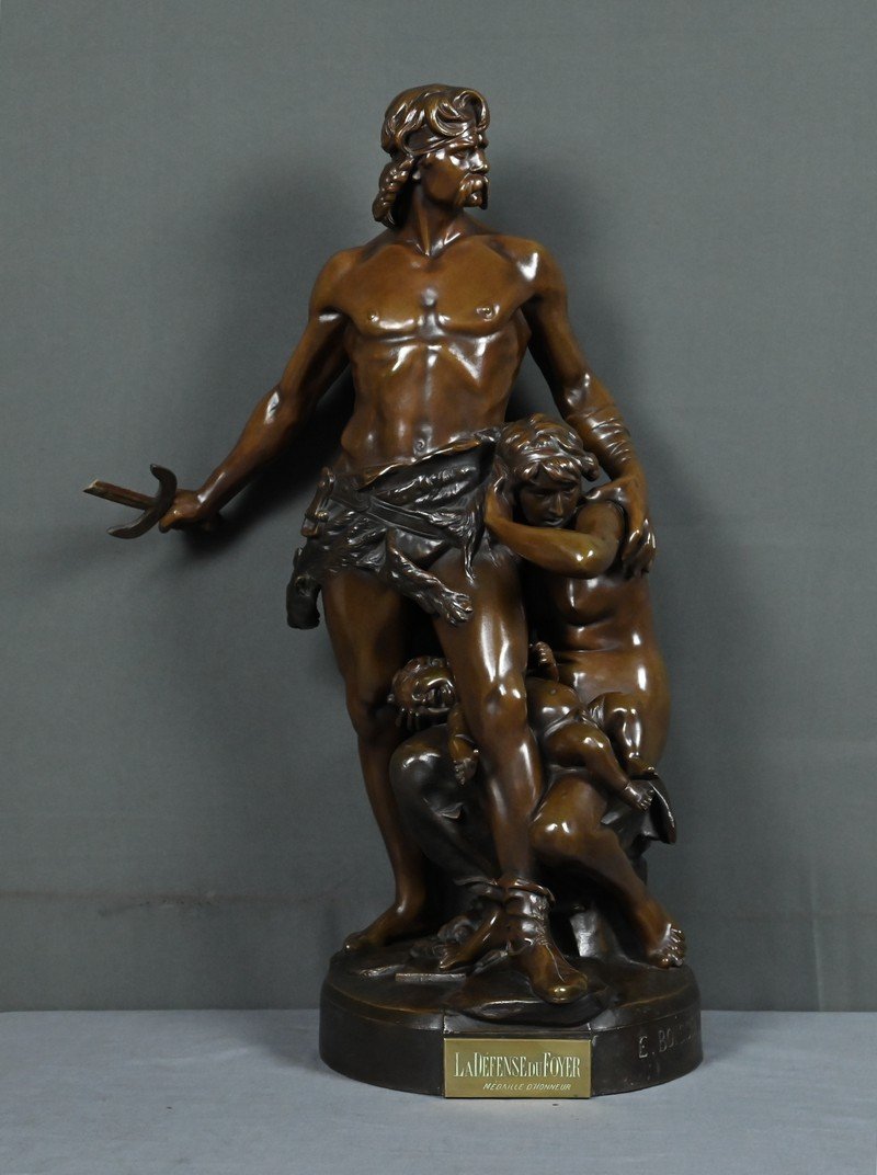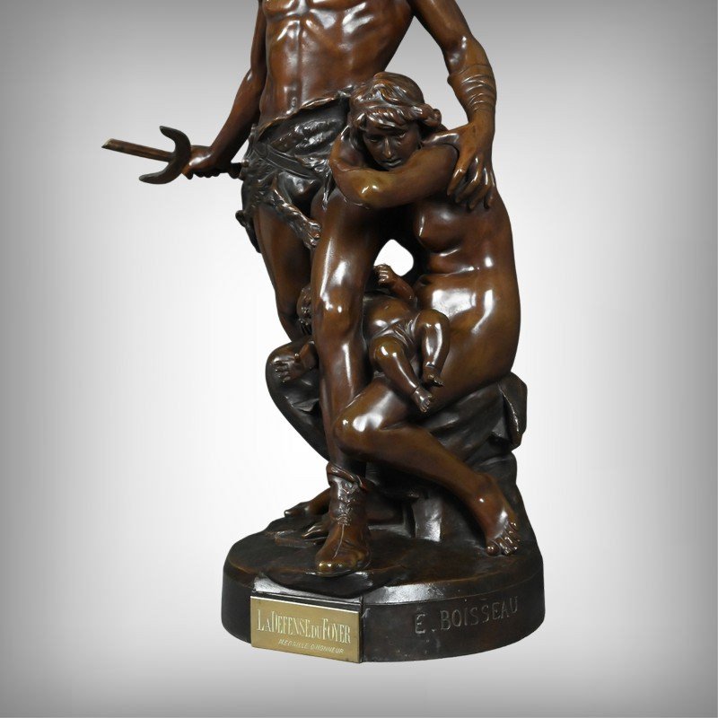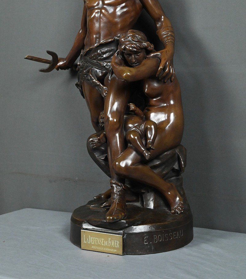 Powerful and moving, this large bronze group with a brown patina, entitled "The Defense of the Home," forcefully embodies the universal theme of family protection in the face of peril. Created by the sculptor Émile Boisseau, it transposes, in a smaller format, the original model erected in the Square d'Ajaccio in Paris, in front of Les Invalides.