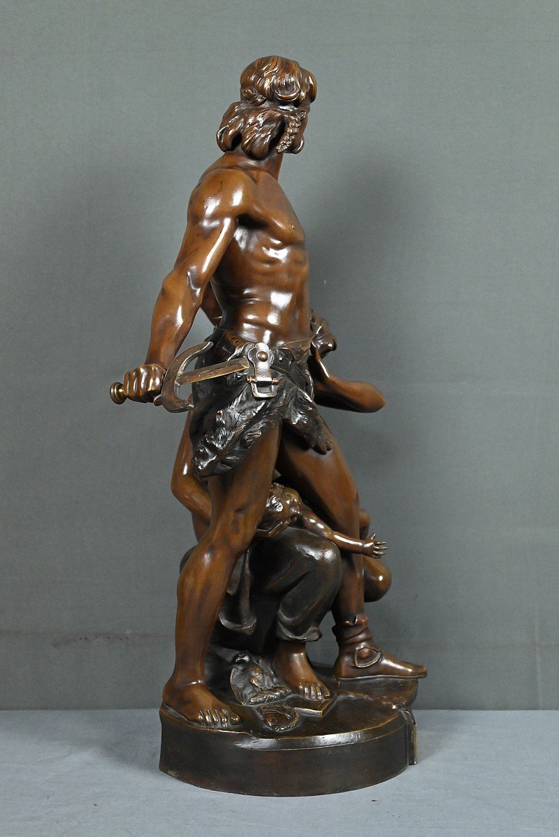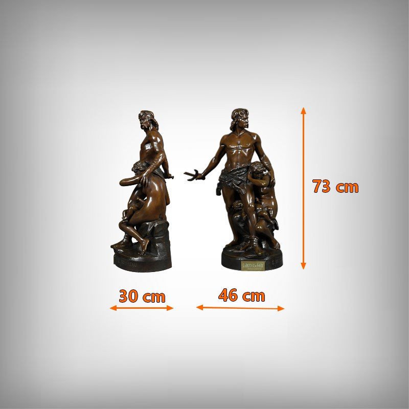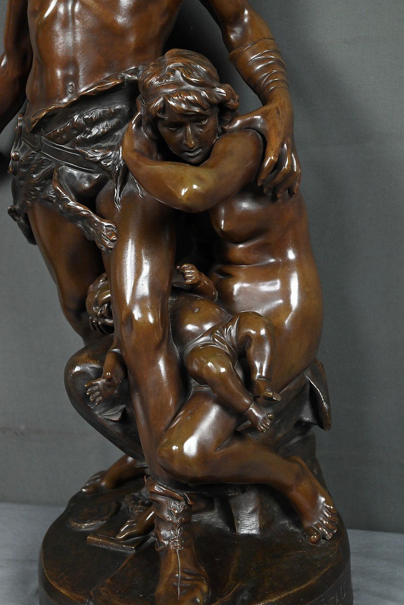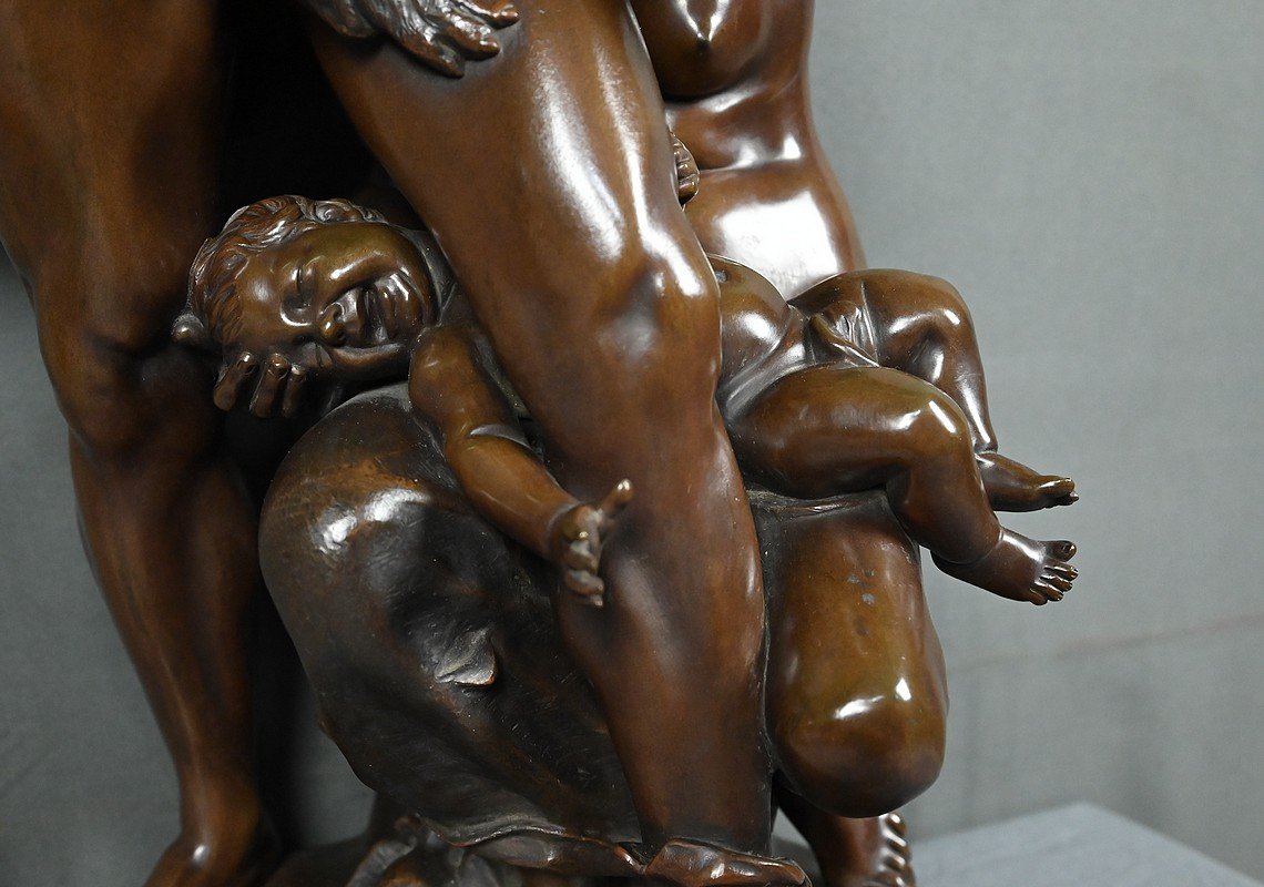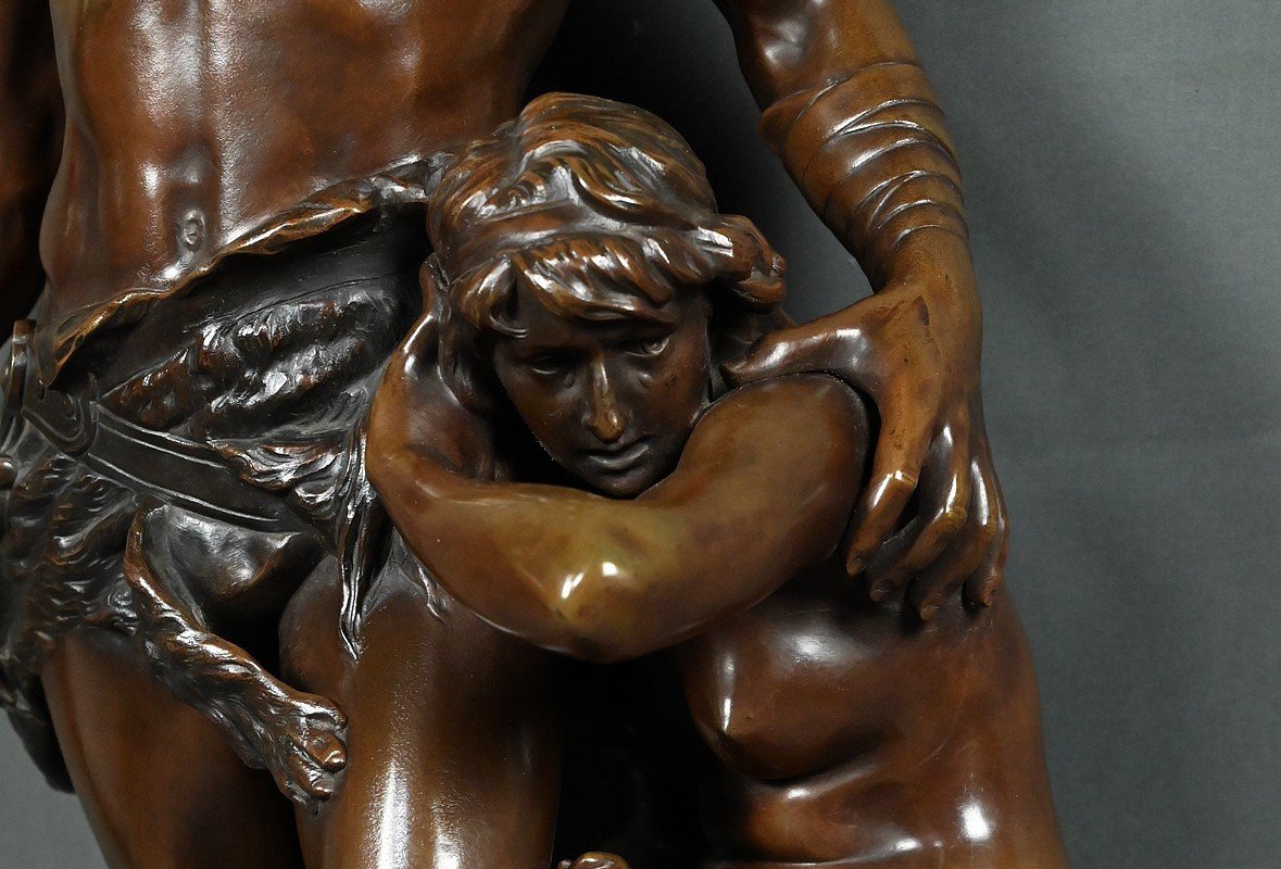 The brown patina accentuates the volumes and contrasts, highlighting the taut muscles, the tormented drapery, and the intensely sculpted expressions. The piece exudes a striking narrative tension, poised between heroism and vulnerability.