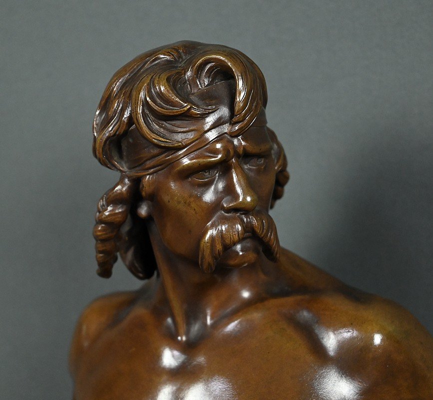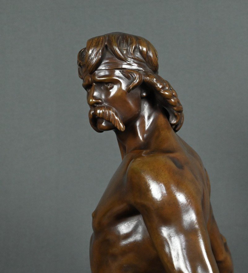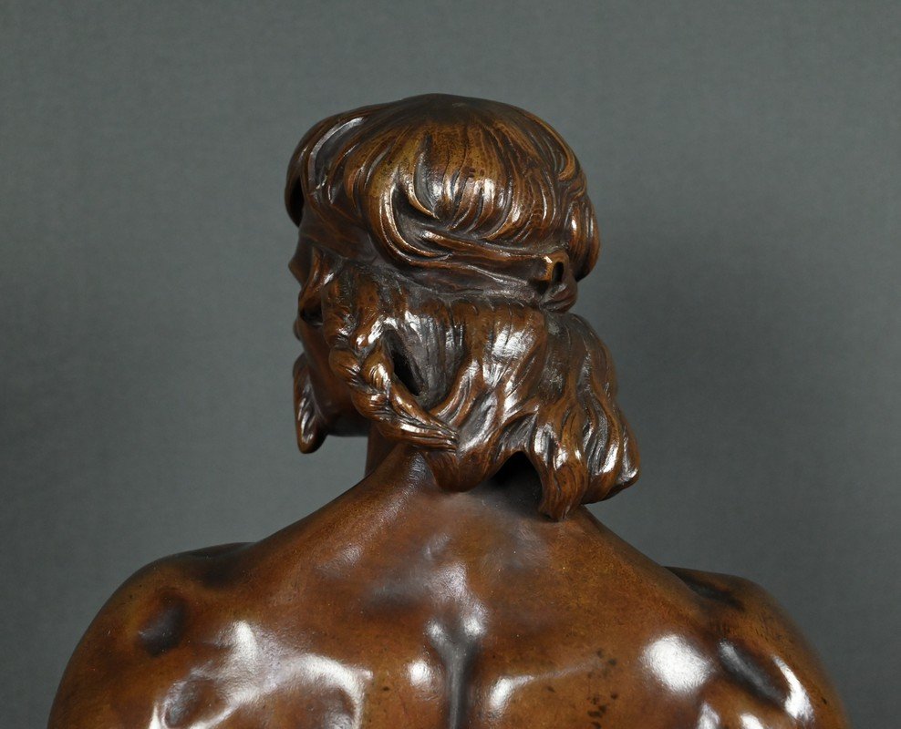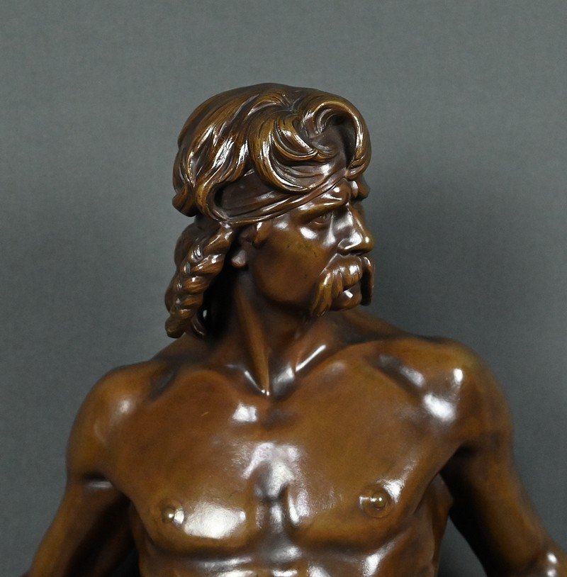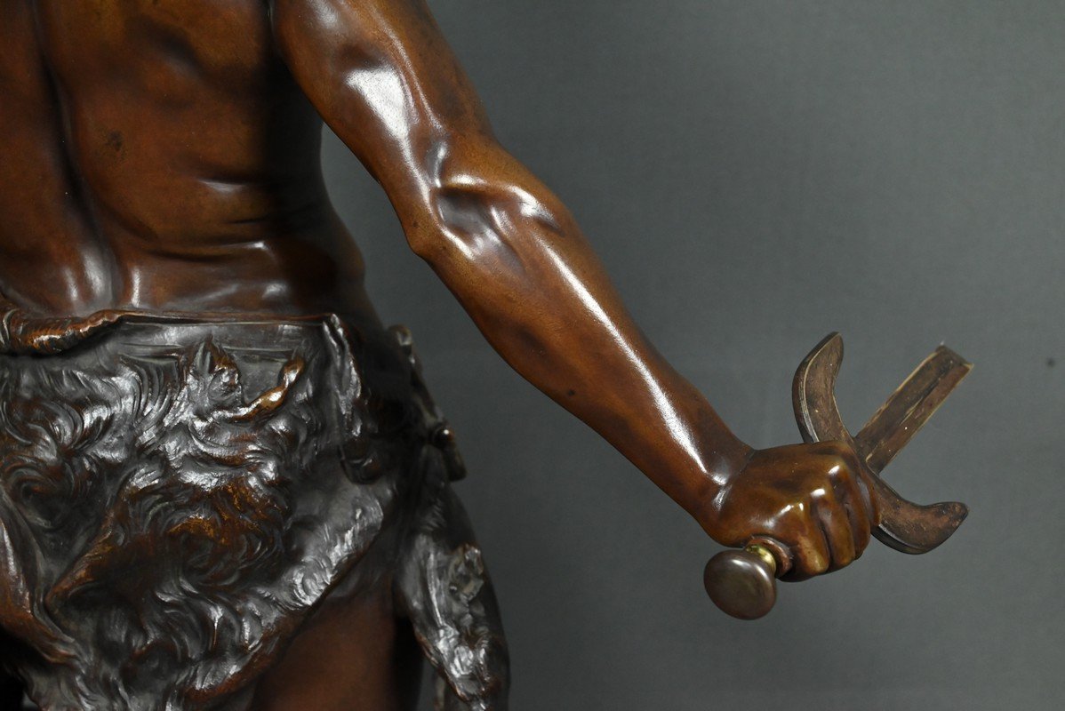 The brown patina accentuates the volumes and contrasts, highlighting the taut muscles, the tormented drapery, and the intensely sculpted expressions. The piece exudes a striking narrative tension, poised between heroism and vulnerability.