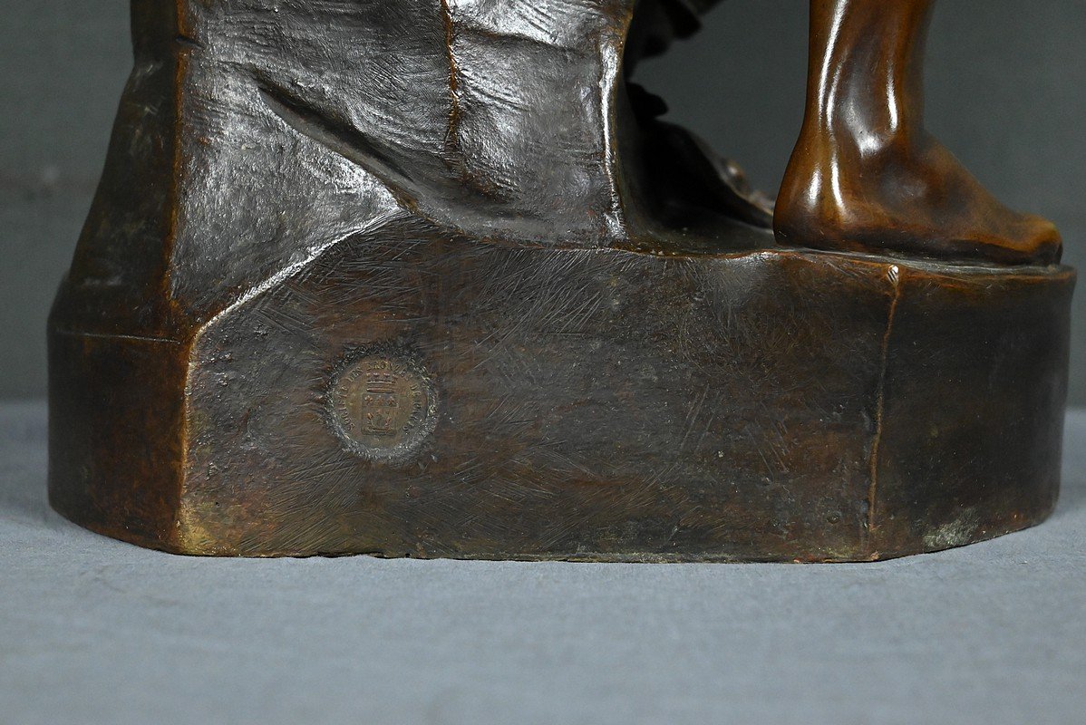 Diese Bronzeskulptur, deren Titel in einer Kartusche steht, trägt die Inschrift „Médaille d'Honneur” (Ehrenmedaille), was die offizielle Anerkennung des Werks für seine künstlerische Qualität und patriotische Botschaft belegt. Es gehört zur Tradition der Gedenkskulpturen aus dem späten 19. Jahrhundert, die die Werte Mut, Pflichtbewusstsein und Familienliebe feiern. Das Werk ist auf dem Sockel signiert und trägt die Gießereimarke „Société des Bronzes de Paris” (Pariser Bronzegießerei).