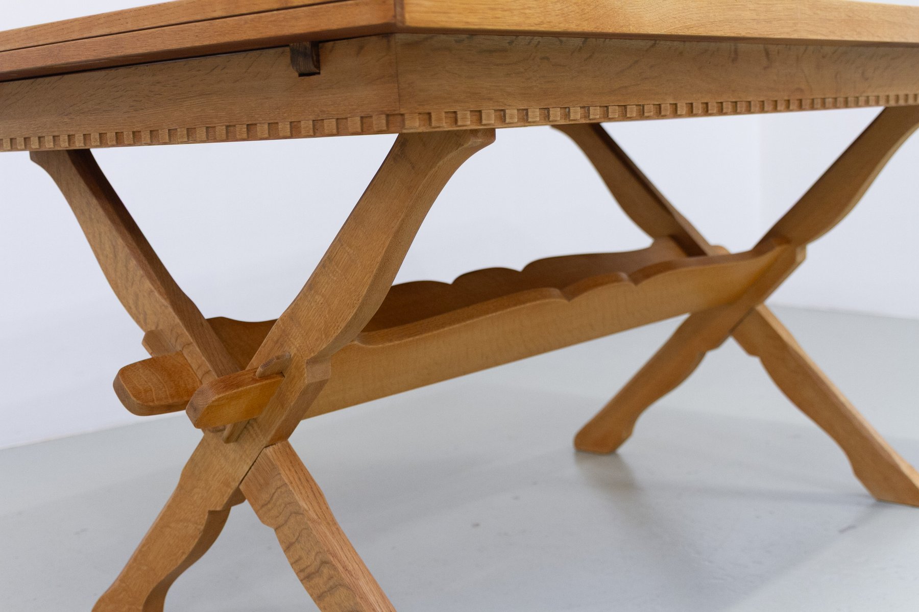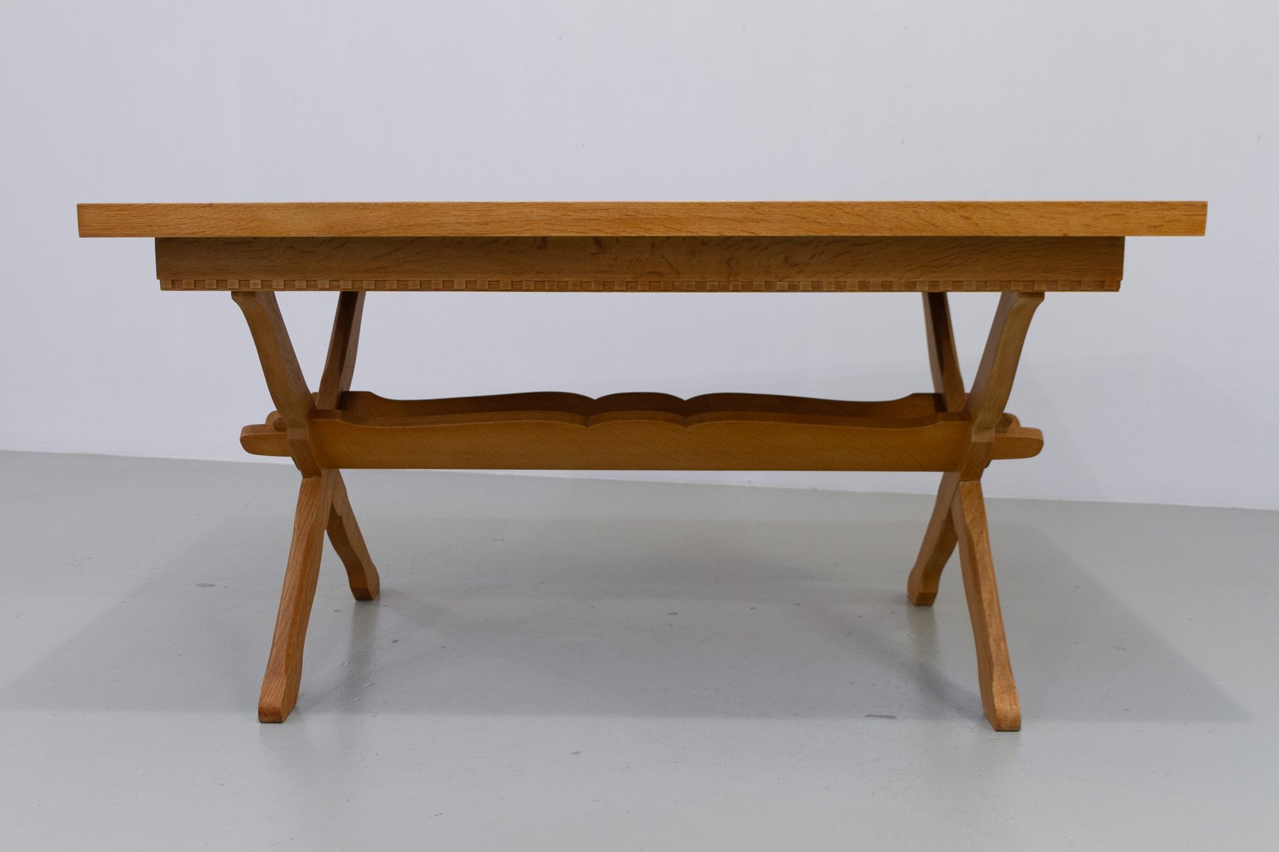 The most striking element is the cross-leg trestle base, formed from two elegantly curved X-shaped supports. These are joined by two shaped central stretchers with fluid, scalloped detailing—an unmistakable Kjærnulf signature. The legs are thick yet gracefully contoured, giving the table both stability and an expressive, handcrafted character.