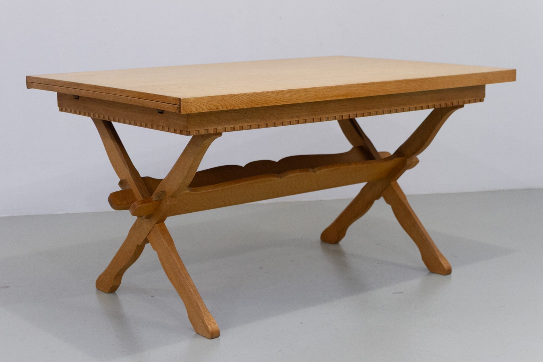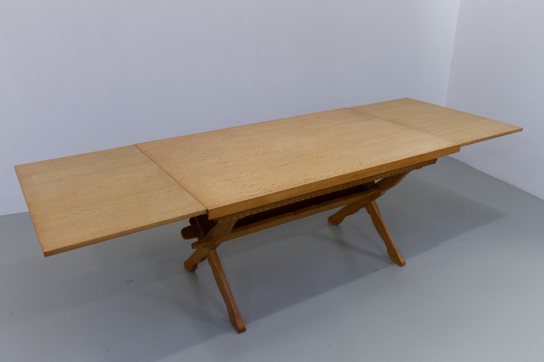 Brutalist design with traces of Danish Modern influence. Hidden extension leaves in each end which are
