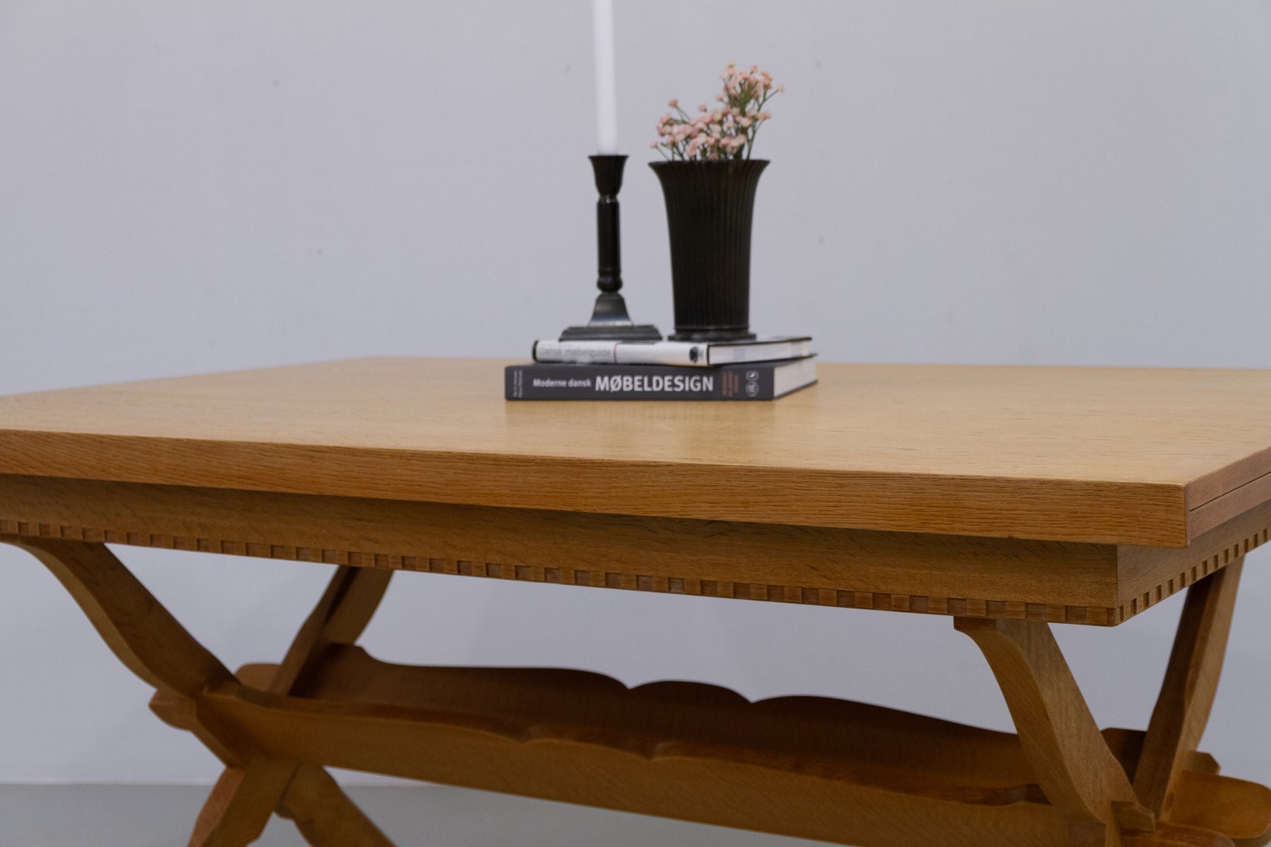 This Henning Kjærnulf oak dining table features a distinctive sculptural base that showcases the designer’s refined craftsmanship. The tabletop is crafted from veneered oak with a warm, even grain. Along the underside runs a fine, decorative carved border, adding texture and visual interest without overwhelming the clean Scandinavian form.