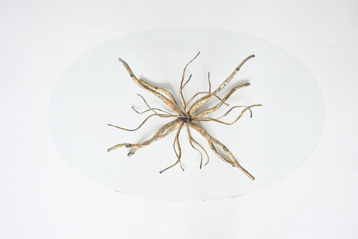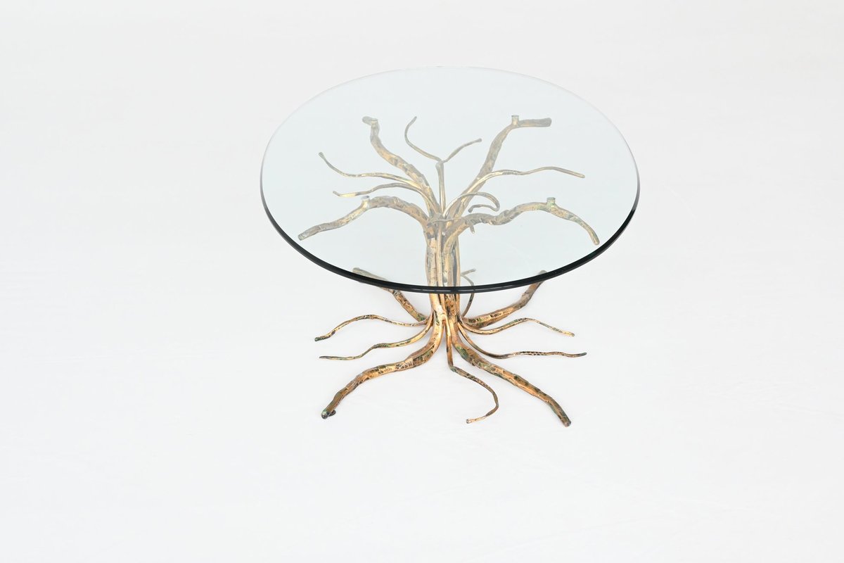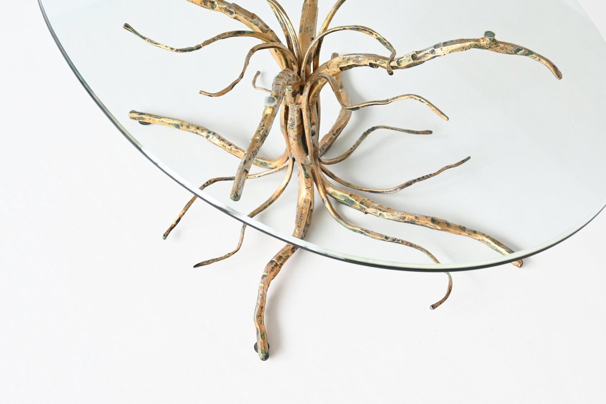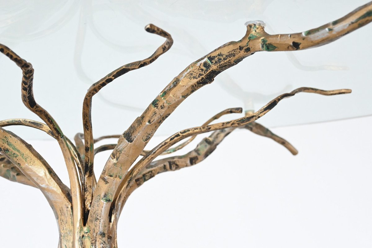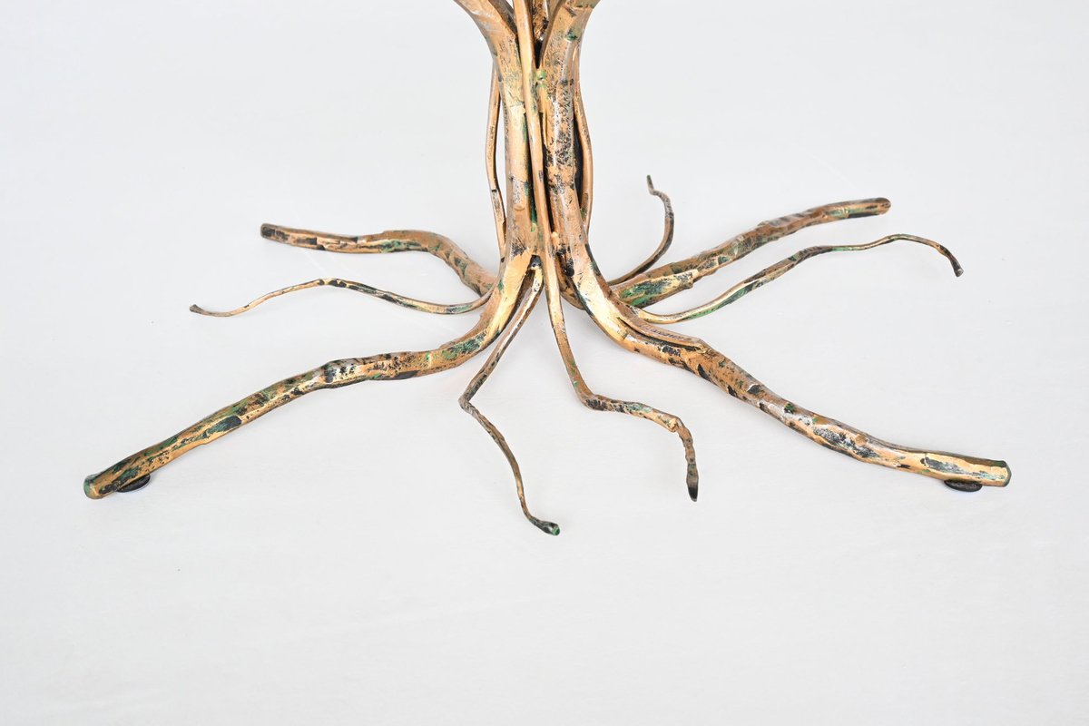 Dieser brutalistische Couchtisch des renommierten italienischen Designers Salvino Marsura aus der Mitte des letzten Jahrhunderts ist eine beeindruckende Mischung aus Kunst und Funktion. Der in den 1960er Jahren entworfene Tisch hat einen skulpturalen Sockel aus Schmiedeeisen in Form eines Baumes, der mit einer reichen Patina vergoldet ist und Marsuras charakteristische, von der Natur inspirierte Ästhetik verkörpert. Die Tischplatte aus klarem Glas bildet einen schönen Kontrast zum rohen, strukturierten Sockel und macht dieses Stück zu einem herausragenden Beispiel für das italienische Design der Mitte des Jahrhunderts. In ausgezeichnetem Vintage-Zustand spiegelt es Marsuras Meisterschaft wider, organische Formen mit einem kühnen brutalistischen Stil zu kombinieren.