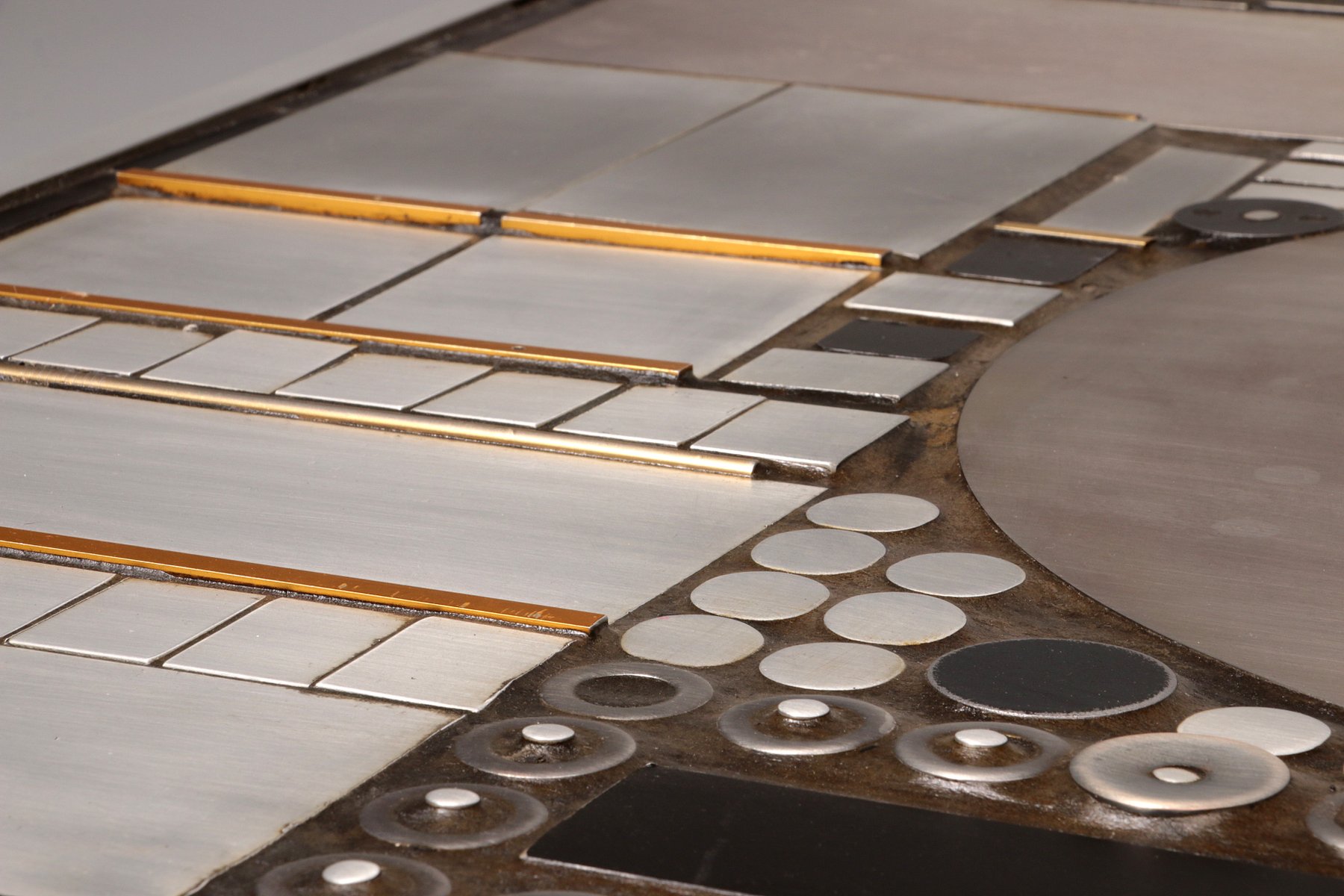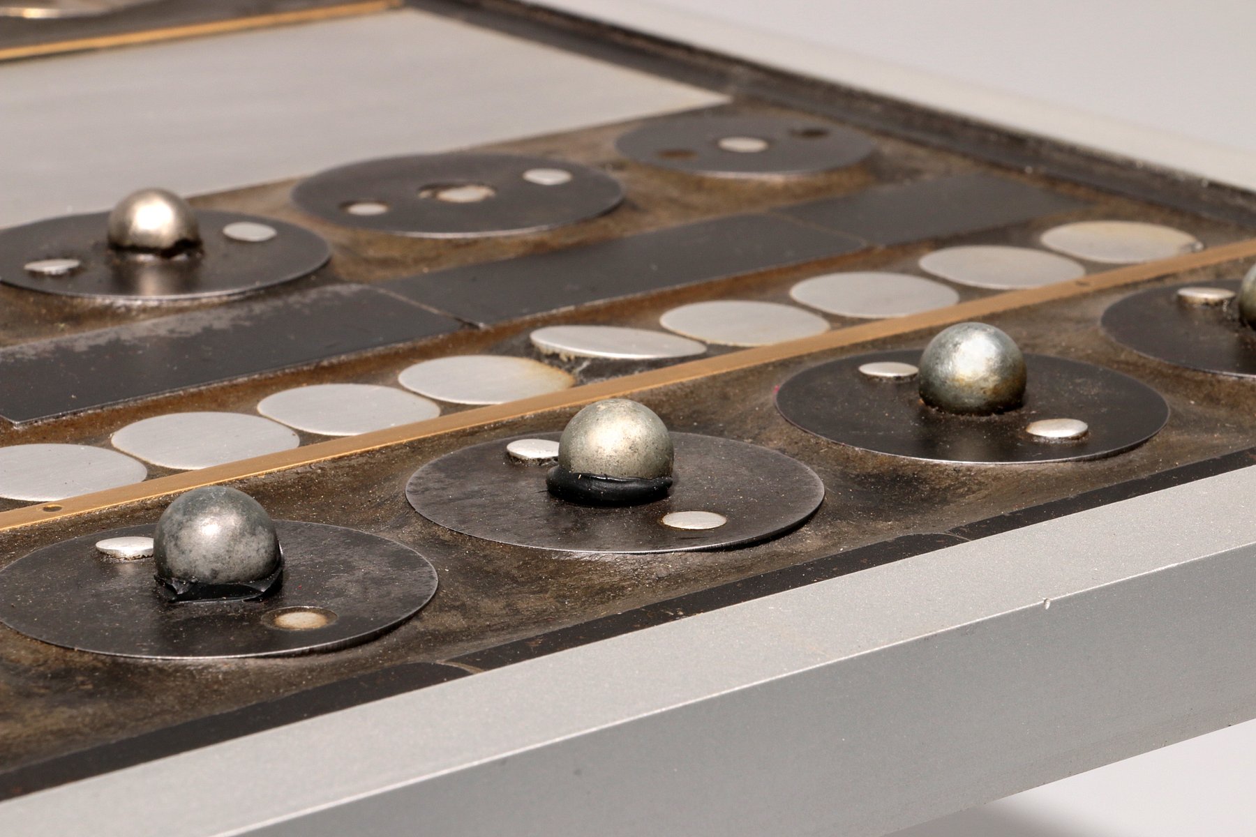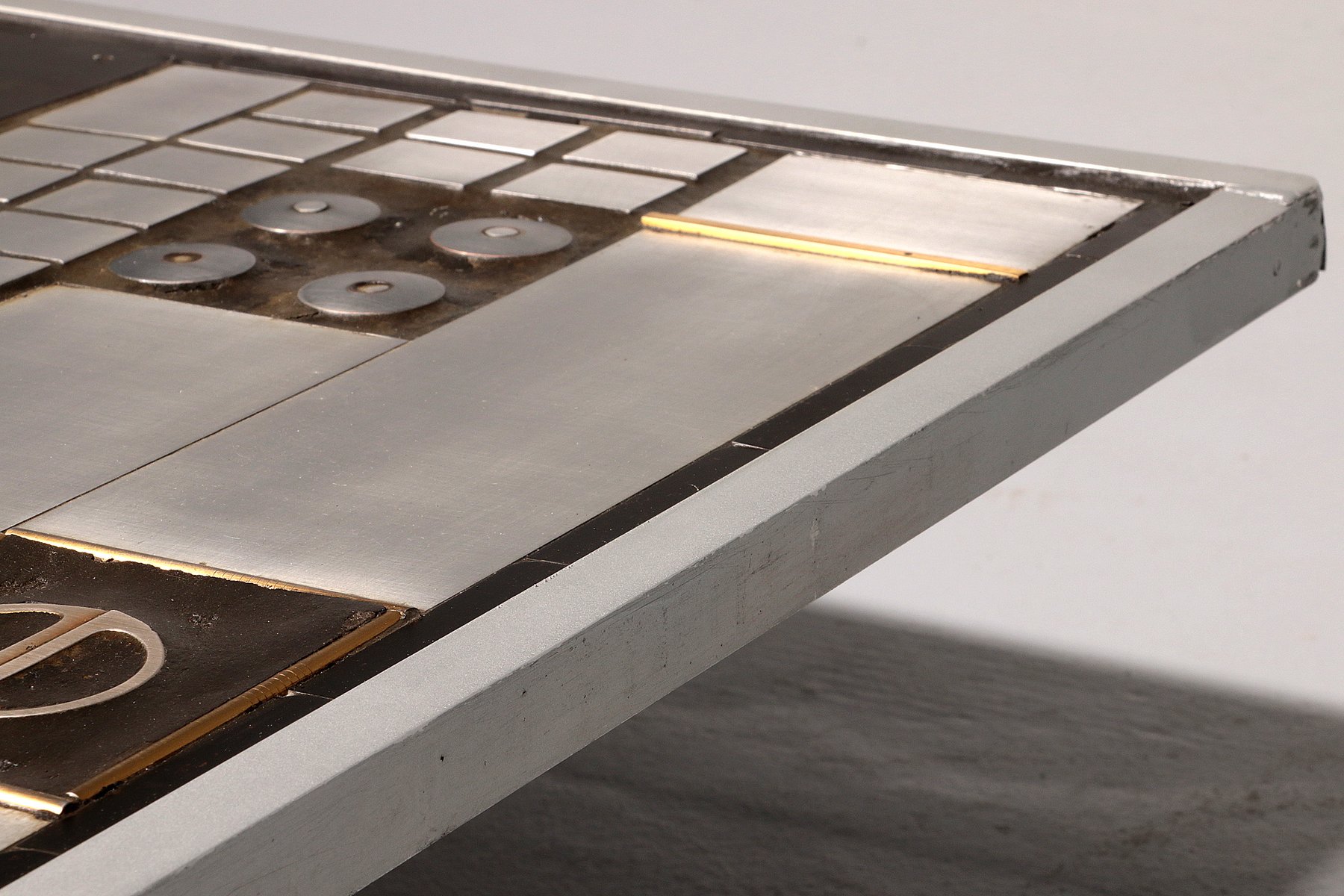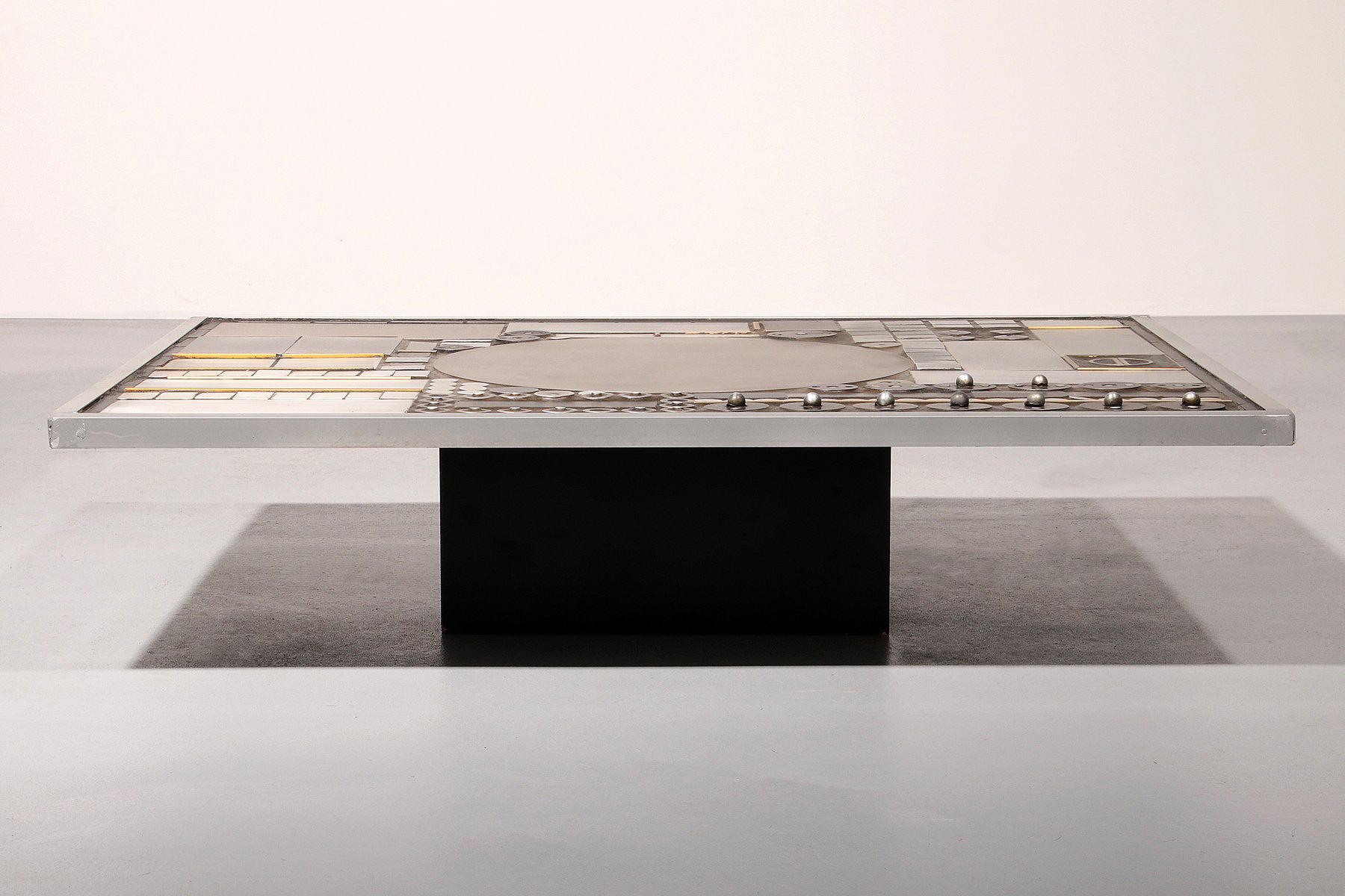 Dieser außergewöhnliche Couchtisch des belgischen Künstlers Raf Verjans ist weit mehr als ein Möbelstück; er ist ein skulpturales Statement, das jedes Interieur in eine galerieartige Umgebung verwandelt. Die Platte besteht aus mehreren Aluminium- und Messingelementen, die in Form und Höhe variieren und eine architektonische Landschaft schaffen, die das Licht auf beeindruckende Weise einfängt und reflektiert. Jeder Winkel offenbart eine neue Komposition, ein neues Spiel von Schatten und Materialien und macht den Tisch zu einem lebendigen Kunstwerk im Raum. Dieses seltene Stück aus der Mitte des Jahrhunderts verkörpert die kühne Experimentierfreudigkeit der belgischen Kunstmöbel dieser Zeit und steht stolz zwischen Skulptur und Funktion. Es ist ein ikonisches, monumentales Objekt, das einen Raum durch seine Präsenz definiert und jede Sammlung durch seinen unverwechselbaren Charakter bereichert.