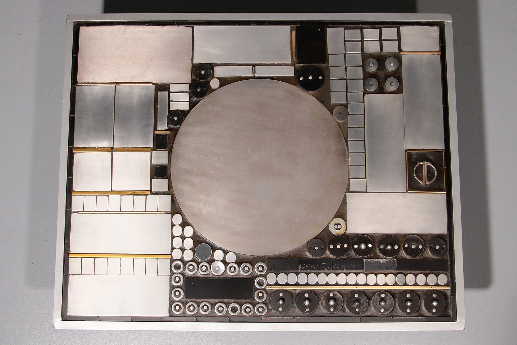 This exceptional coffee table by Belgian artist Raf Verjans is far more than a piece of furniture; it is a sculptural statement that transforms any interior into a gallery-like environment. The top is composed of multiple aluminum and brass elements, each varying in form and height, creating an architectural landscape that captures and reflects light in a striking way. Every angle reveals a new composition, a new play of shadows and materials, making the table a living artwork within the room. This rare mid-century piece embodies the bold experimentation of Belgian art furniture from the period, standing proudly between sculpture and function. It is an iconic, monumental object that defines a space with its presence and enriches any collection with its unmistakable character.