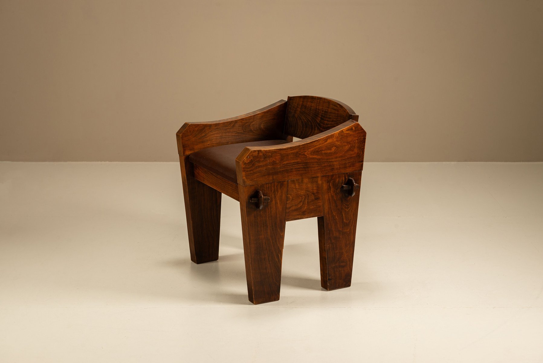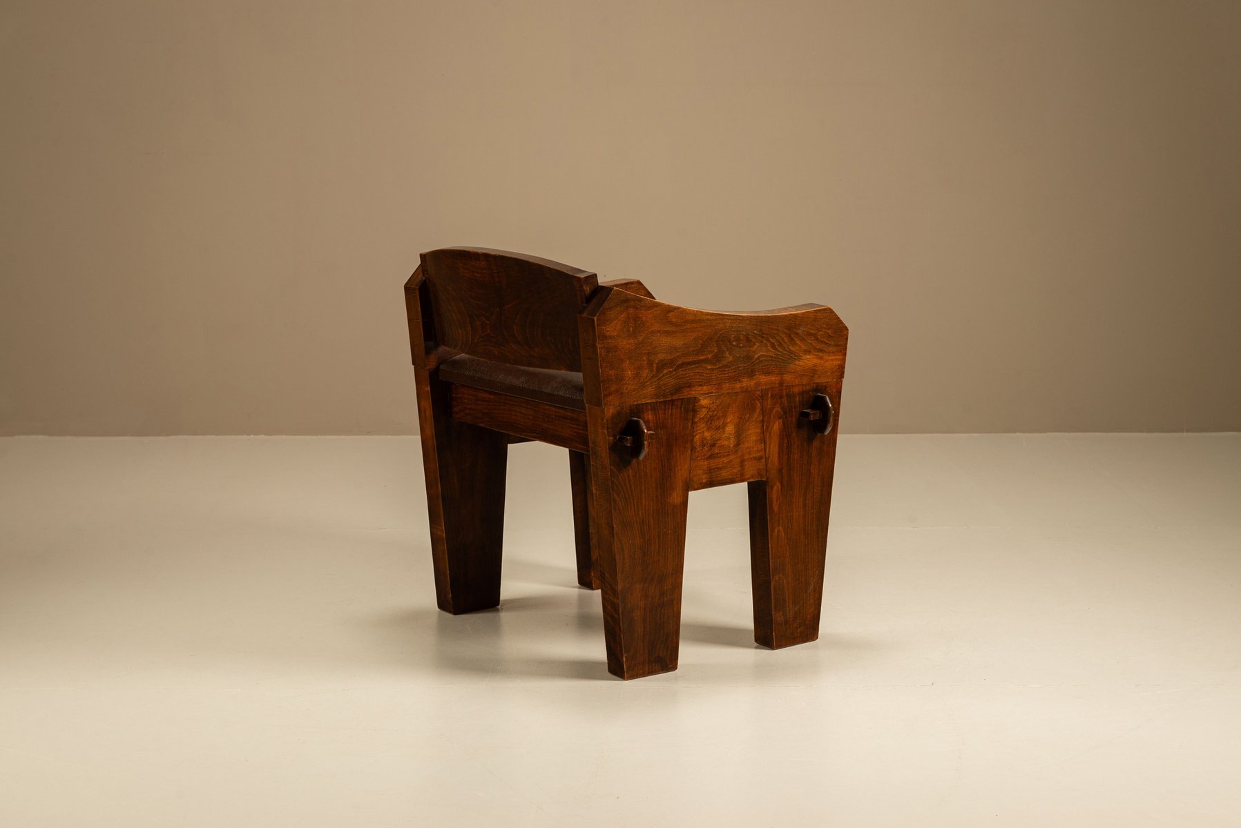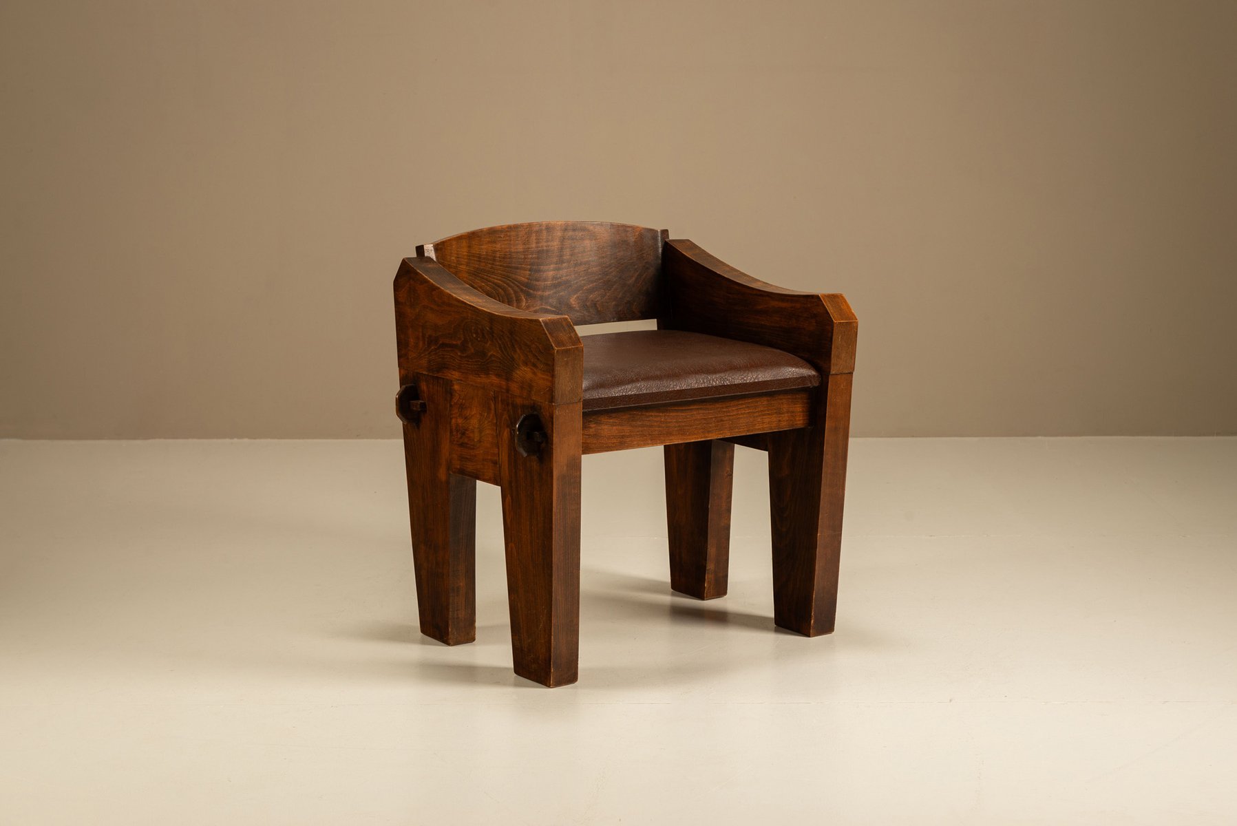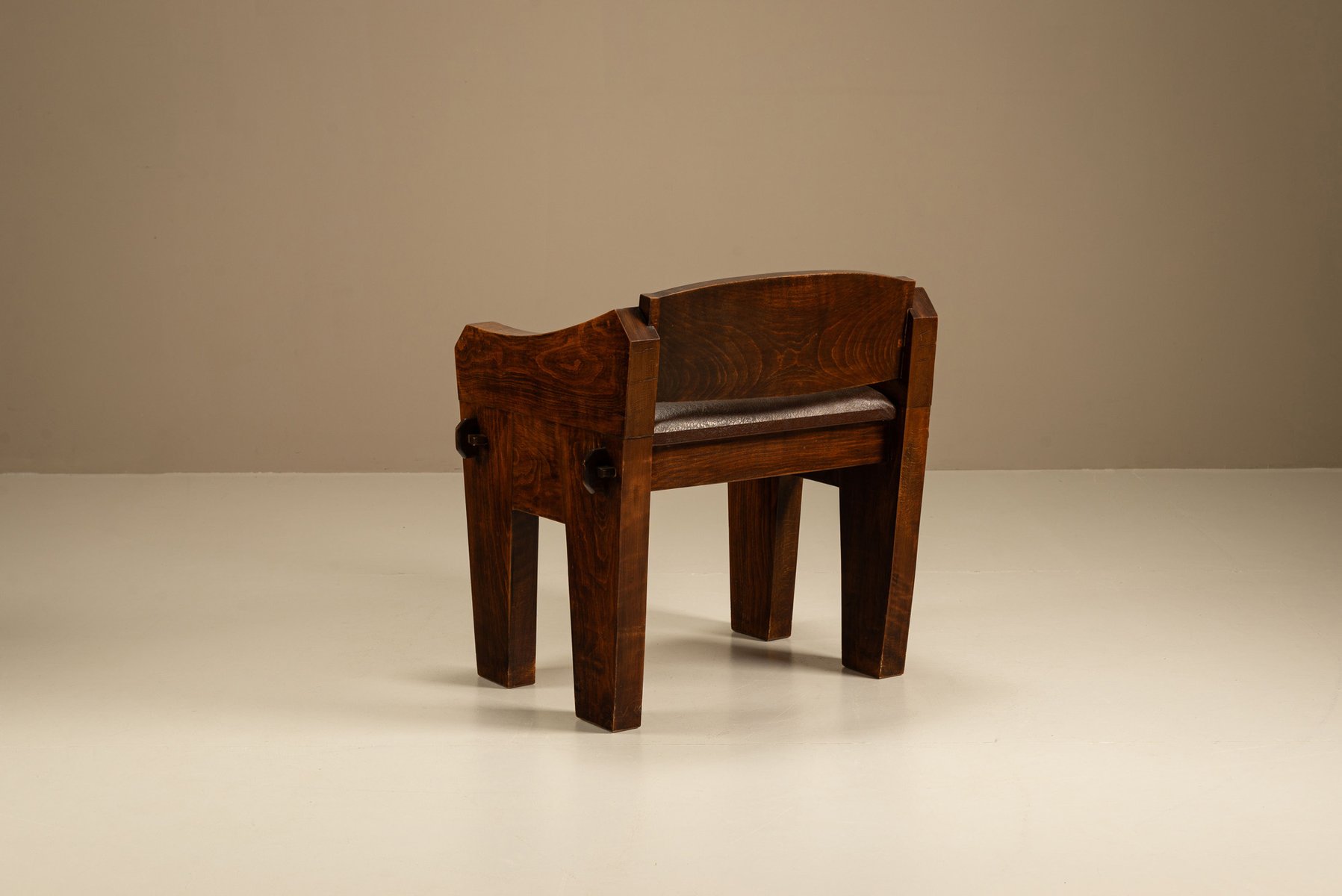 Der Sessel ist aus schwerem Holz gefertigt und von Hand mit weiten Kurven und dicken Beinen geformt. Sein stabiles Gestell lässt vermuten, dass er in einer ländlichen Werkstatt hergestellt wurde, wo praktisches Design auf ausdrucksstarke Formen traf. Die breiten Armlehnen und die abgewinkelte Rückenlehne bieten Halt und Komfort. Der Sitz ist mit Kunstleder bezogen, das einen Kontrast zwischen der dunklen Oberfläche und dem warmen Holz darunter bildet. Das Material ist praktisch und pflegeleicht, aber dennoch bequem.