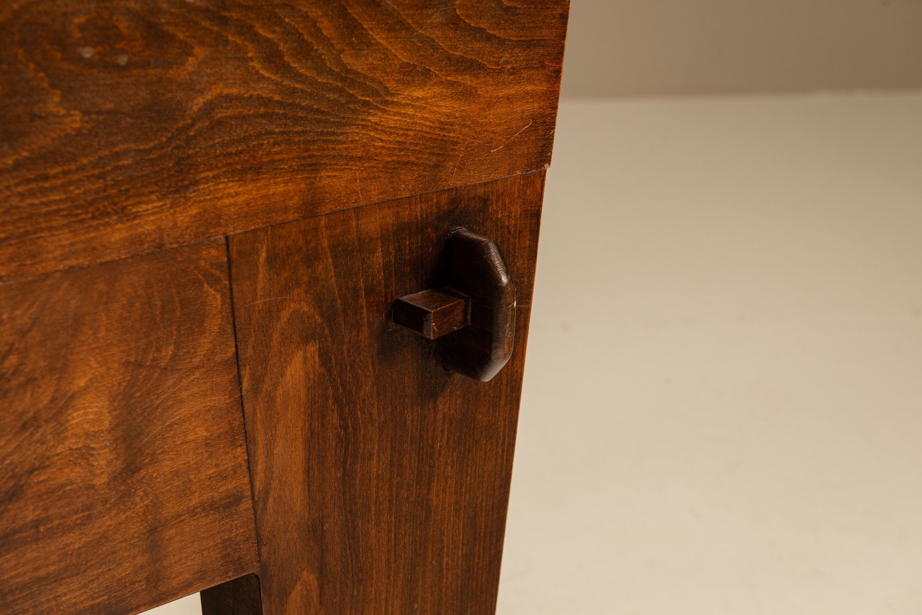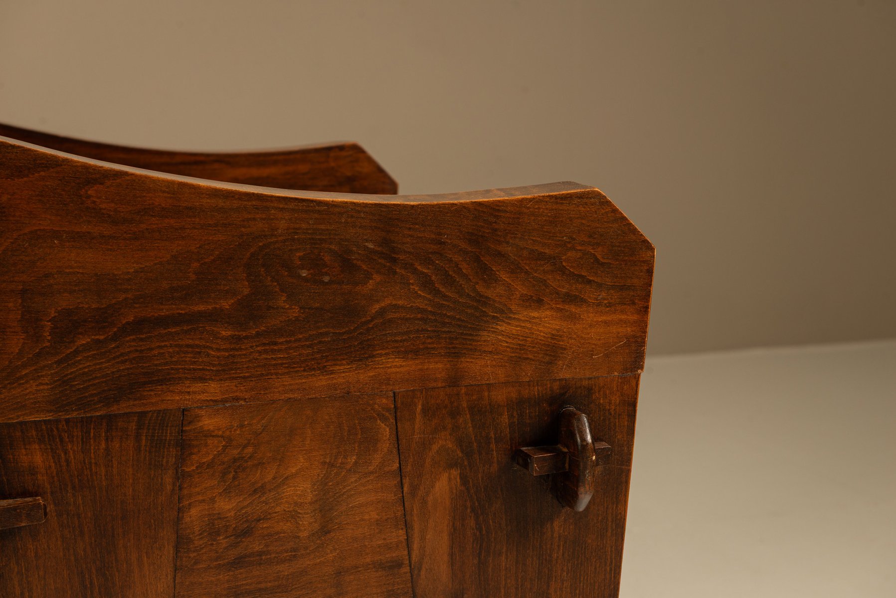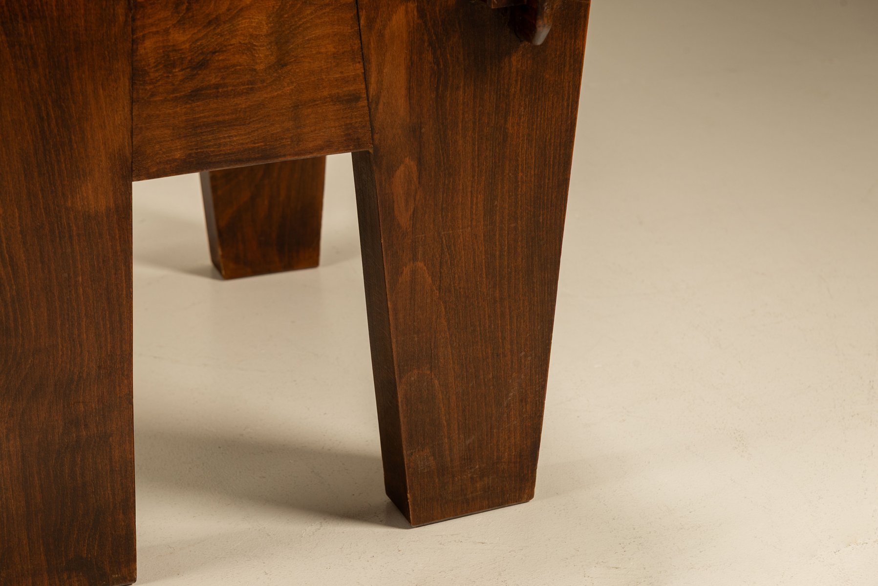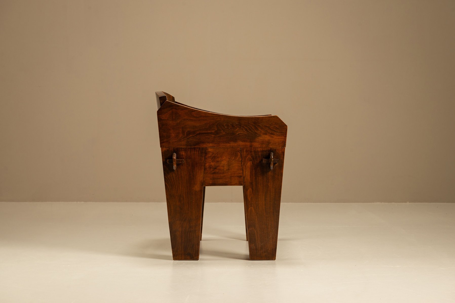Der Sessel ist aus schwerem Holz gefertigt und von Hand mit weiten Kurven und dicken Beinen geformt. Sein stabiles Gestell lässt vermuten, dass er in einer ländlichen Werkstatt hergestellt wurde, wo praktisches Design auf ausdrucksstarke Formen traf. Die breiten Armlehnen und die abgewinkelte Rückenlehne bieten Halt und Komfort. Der Sitz ist mit Kunstleder bezogen, das einen Kontrast zwischen der dunklen Oberfläche und dem warmen Holz darunter bildet. Das Material ist praktisch und pflegeleicht, aber dennoch bequem.