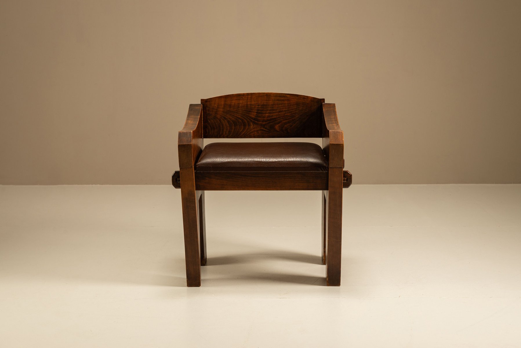 The chair is built from heavy wood, shaped by hand with broad curves and thick legs. Its sturdy frame suggests it was made in a rural workshop, where practical design met expressive form. The wide armrests and angled back offer support and comfort. Faux leather covers the seat, creating a contrast between the dark surface and the warm wood underneath. The material is practical and easy to maintain, while still comfortable.