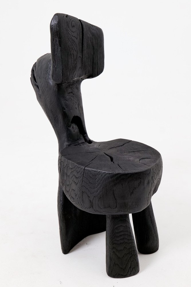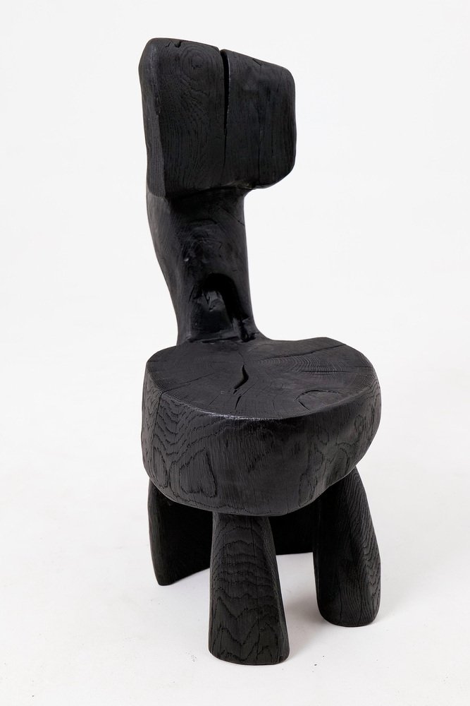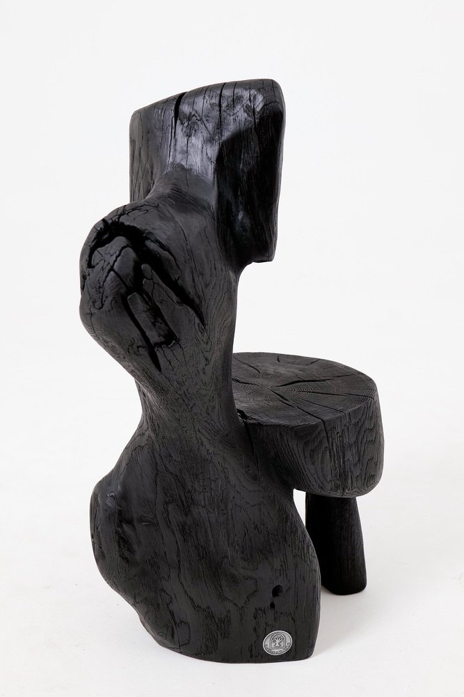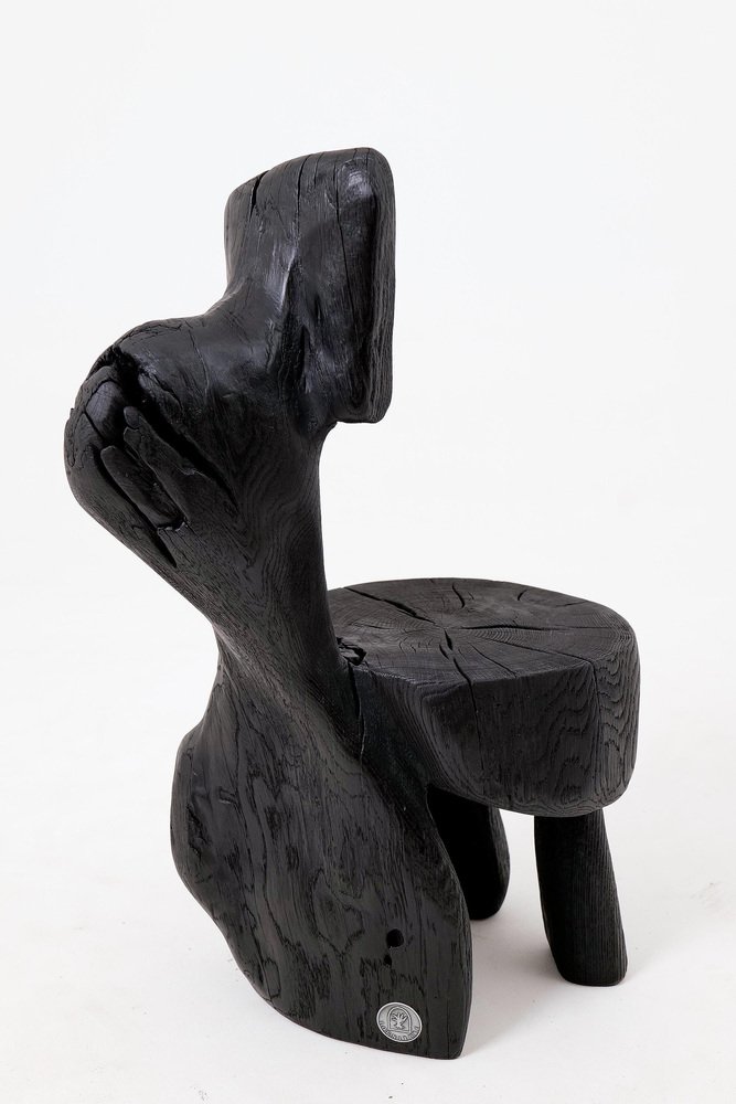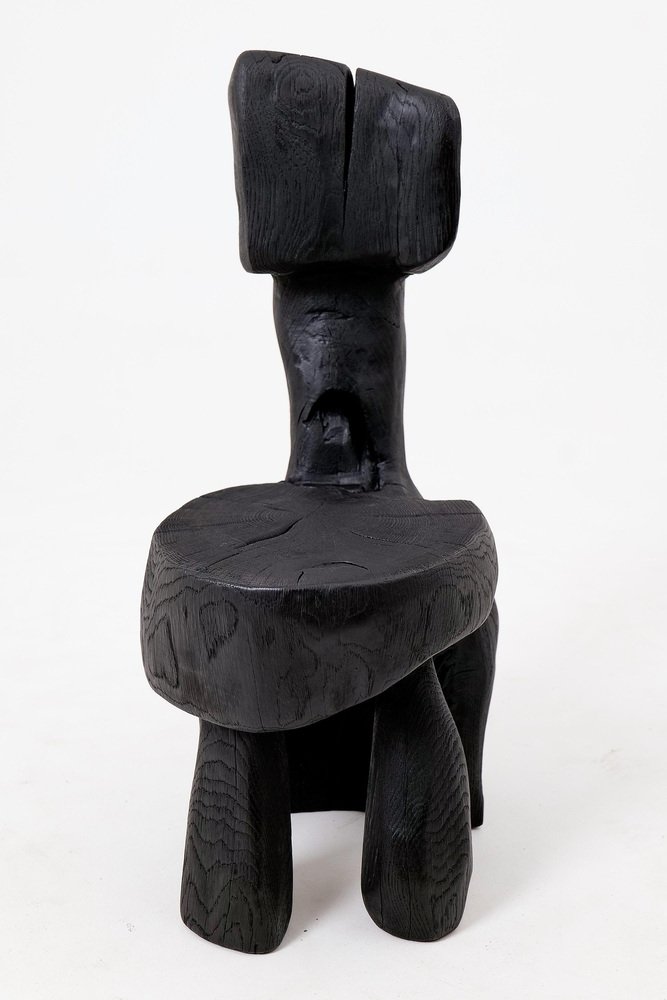 This striking chair is a one-of-a-kind functional sculpture, carved from a single piece of wood to ensure absolute structural integrity and a monolithic presence. Its design features an abstract, upright backrest and a rounded seat that emerge from a heavy, organic base, creating a silhouette that feels like a prehistoric artifact rediscovered for the modern age. The piece represents a bold exploration of volume and negative space, serving as both a ceremonial seat and a powerful work of art. The entire form is treated with a deep ebonized finish, giving the timber a rich, matte black tone that unifies its complex geometry. This finish accentuates the rugged texture of the hand work, highlighting the surface with tool marks while allowing natural fissures and the wood's inherent character to remain visible. The top of the seat proudly displays original growth rings and checking, providing a tactile connection to the material's life cycle. Built for structural permanence, the chair rests on a robust, three-legged base that maintains a sense of grounded, primitive stability. Its architectural profile makes it an ideal focal point for minimalist, industrial, or avant-garde interiors that value raw craftsmanship and the dark elegance of natural materials. Perfect for Brutalist, Wabi-Sabi, or contemporary monochromatic spaces, it brings a layer of sophisticated mystery and handcrafted integrity to any room. Designed and made in Europe by Logniture, a studio dedicated to transforming raw timber into expressive, heirloom-grade furniture. Technical Specifications: Materials: Solid hardwood(oak) Finish: Natural oils and waxes Placement: Indoor & Outdoor