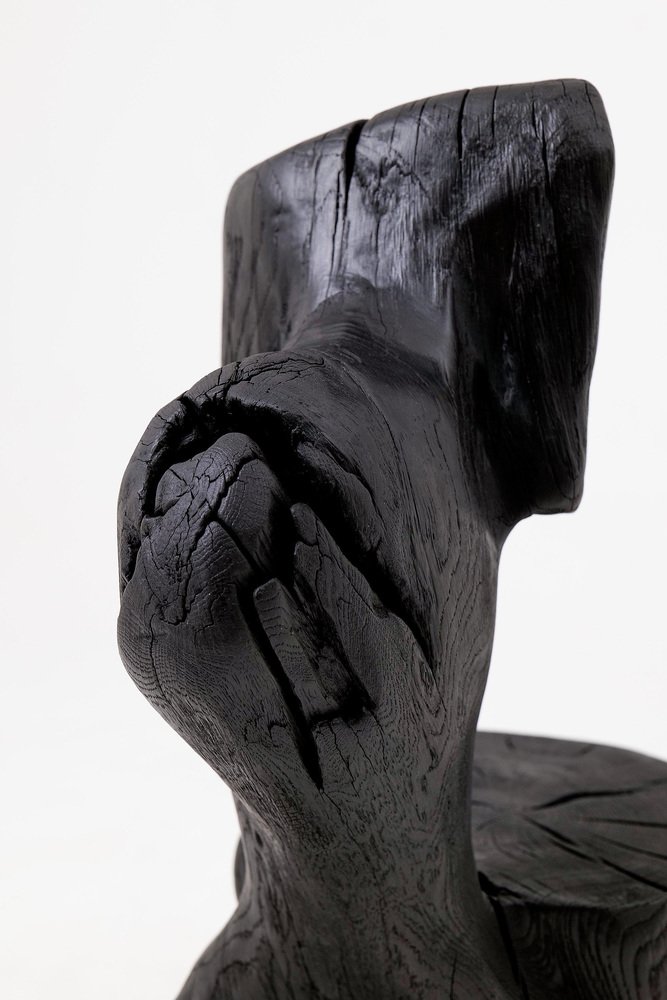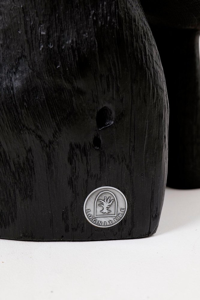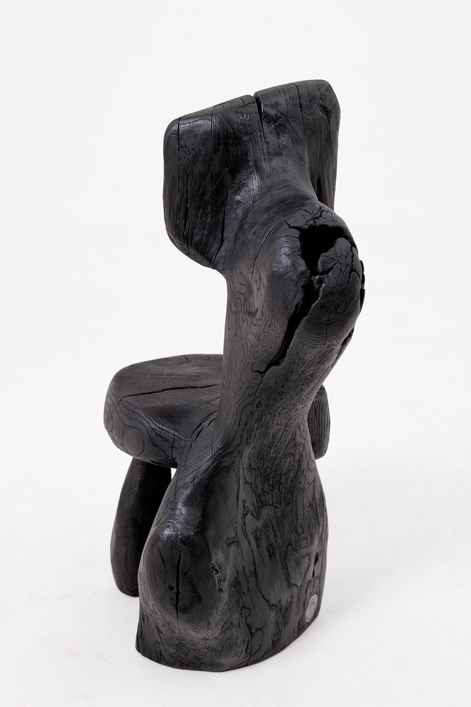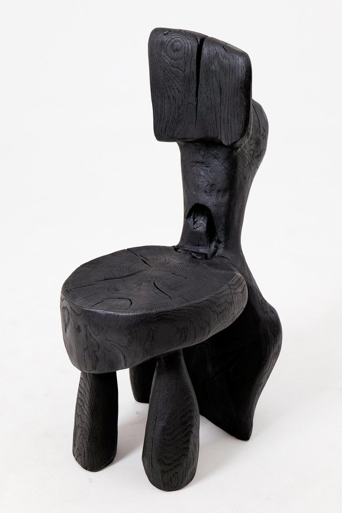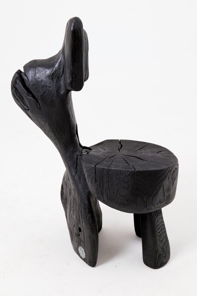 This striking chair is a one-of-a-kind functional sculpture, carved from a single piece of wood to ensure absolute structural integrity and a monolithic presence. Its design features an abstract, upright backrest and a rounded seat that emerge from a heavy, organic base, creating a silhouette that feels like a prehistoric artifact rediscovered for the modern age. The piece represents a bold exploration of volume and negative space, serving as both a ceremonial seat and a powerful work of art. The entire form is treated with a deep ebonized finish, giving the timber a rich, matte black tone that unifies its complex geometry. This finish accentuates the rugged texture of the hand work, highlighting the surface with tool marks while allowing natural fissures and the wood's inherent character to remain visible. The top of the seat proudly displays original growth rings and checking, providing a tactile connection to the material's life cycle. Built for structural permanence, the chair rests on a robust, three-legged base that maintains a sense of grounded, primitive stability. Its architectural profile makes it an ideal focal point for minimalist, industrial, or avant-garde interiors that value raw craftsmanship and the dark elegance of natural materials. Perfect for Brutalist, Wabi-Sabi, or contemporary monochromatic spaces, it brings a layer of sophisticated mystery and handcrafted integrity to any room. Designed and made in Europe by Logniture, a studio dedicated to transforming raw timber into expressive, heirloom-grade furniture. Technical Specifications: Materials: Solid hardwood(oak) Finish: Natural oils and waxes Placement: Indoor & Outdoor