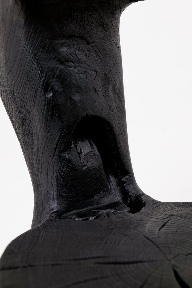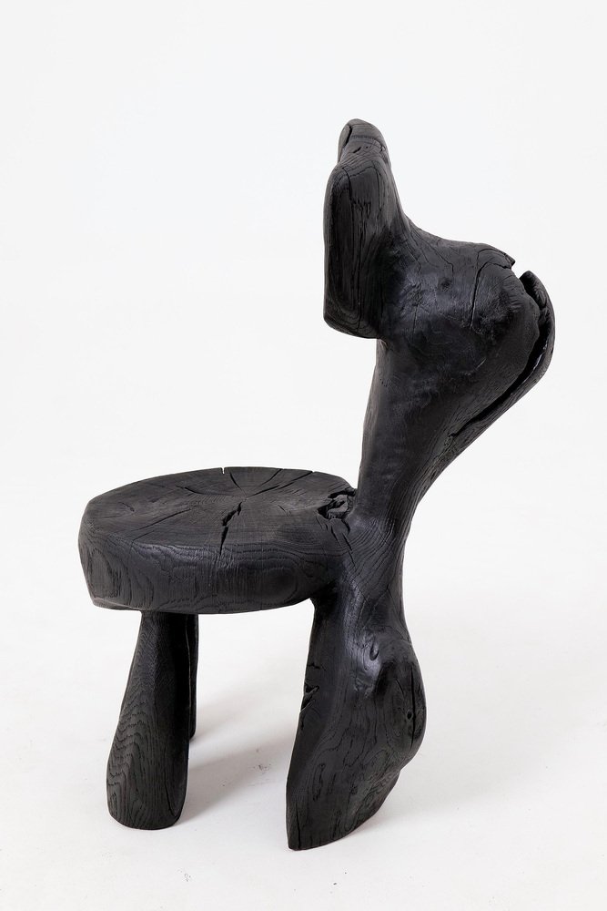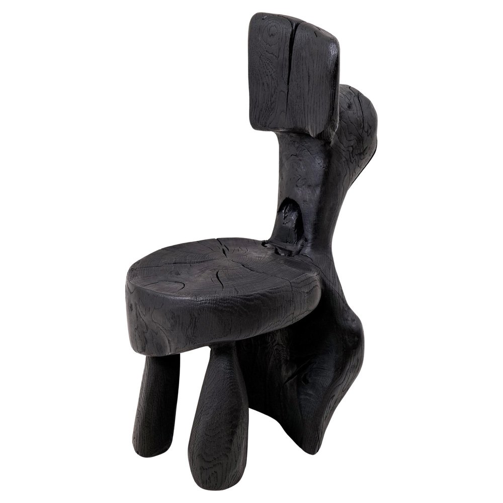 Dieser auffällige Stuhl ist eine einzigartige funktionale Skulptur, die aus einem einzigen Stück Holz geschnitzt wurde, um absolute strukturelle Integrität und eine monolithische Präsenz zu gewährleisten. Sein Design zeichnet sich durch eine abstrakte, aufrechte Rückenlehne und eine abgerundete Sitzfläche aus, die aus einem schweren, organischen Sockel hervorgehen und eine Silhouette schaffen, die wie ein prähistorisches Artefakt wirkt, das für die Moderne wiederentdeckt wurde. Das Stück stellt eine kühne Erkundung von Volumen und negativem Raum dar und dient sowohl als zeremonieller Sitz als auch als kraftvolles Kunstwerk. Die gesamte Form ist mit einer tiefen Ebonisierung behandelt, die dem Holz einen satten, matten Schwarzton verleiht, der seine komplexe Geometrie vereint. Diese Oberfläche betont die raue Textur der Handarbeit, hebt die Oberfläche mit Werkzeugspuren hervor und lässt gleichzeitig natürliche Risse und den natürlichen Charakter des Holzes sichtbar bleiben. Die Oberseite des Sitzes zeigt stolz die ursprünglichen Jahresringe und Risse und stellt so eine taktile Verbindung zum Lebenszyklus des Materials her. Der Stuhl ist auf strukturelle Beständigkeit ausgelegt und ruht auf einem robusten, dreibeinigen Untergestell, das ein Gefühl von Bodenständigkeit und ursprünglicher Stabilität vermittelt. Sein architektonisches Profil macht ihn zu einem idealen Blickfang für minimalistische, industrielle oder avantgardistische Innenräume, in denen rohe Handwerkskunst und die dunkle Eleganz natürlicher Materialien geschätzt werden. Er eignet sich perfekt für brutalistische, Wabi-Sabi- oder zeitgenössische monochrome Räume und verleiht jedem Raum eine raffinierte geheimnisvolle Note und handwerkliche Integrität. Entworfen und hergestellt in Europa von Logniture, einem Studio, das sich der Verwandlung von Rohholz in ausdrucksstarke Möbelstücke in Erbstückqualität verschrieben hat. Technische Daten: Materialien: Massives Hartholz (Eiche) Oberfläche: Natürliche Öle und Wachse Aufstellung: Innen- und Außenbereich