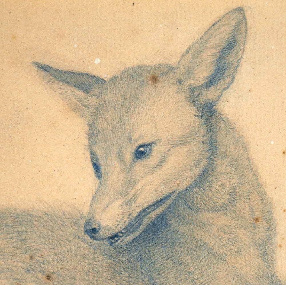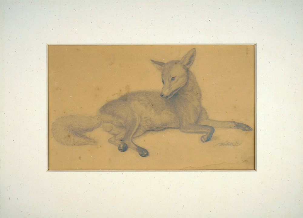Carl Friedrich Deiker (1838 Wetzlar - 1892 Düsseldorf). Vigilant fox. Pencil drawing on brown paper, 18 × 29.5 cm (inside measurement), 31.5 x 43.5 cm (mount), signed and dated "Deiker [18]54" at lower right.
