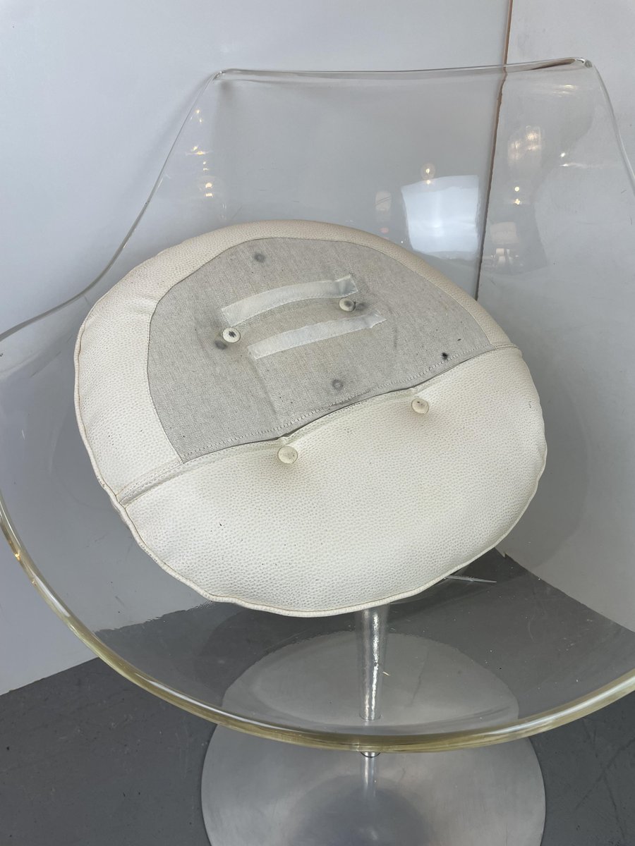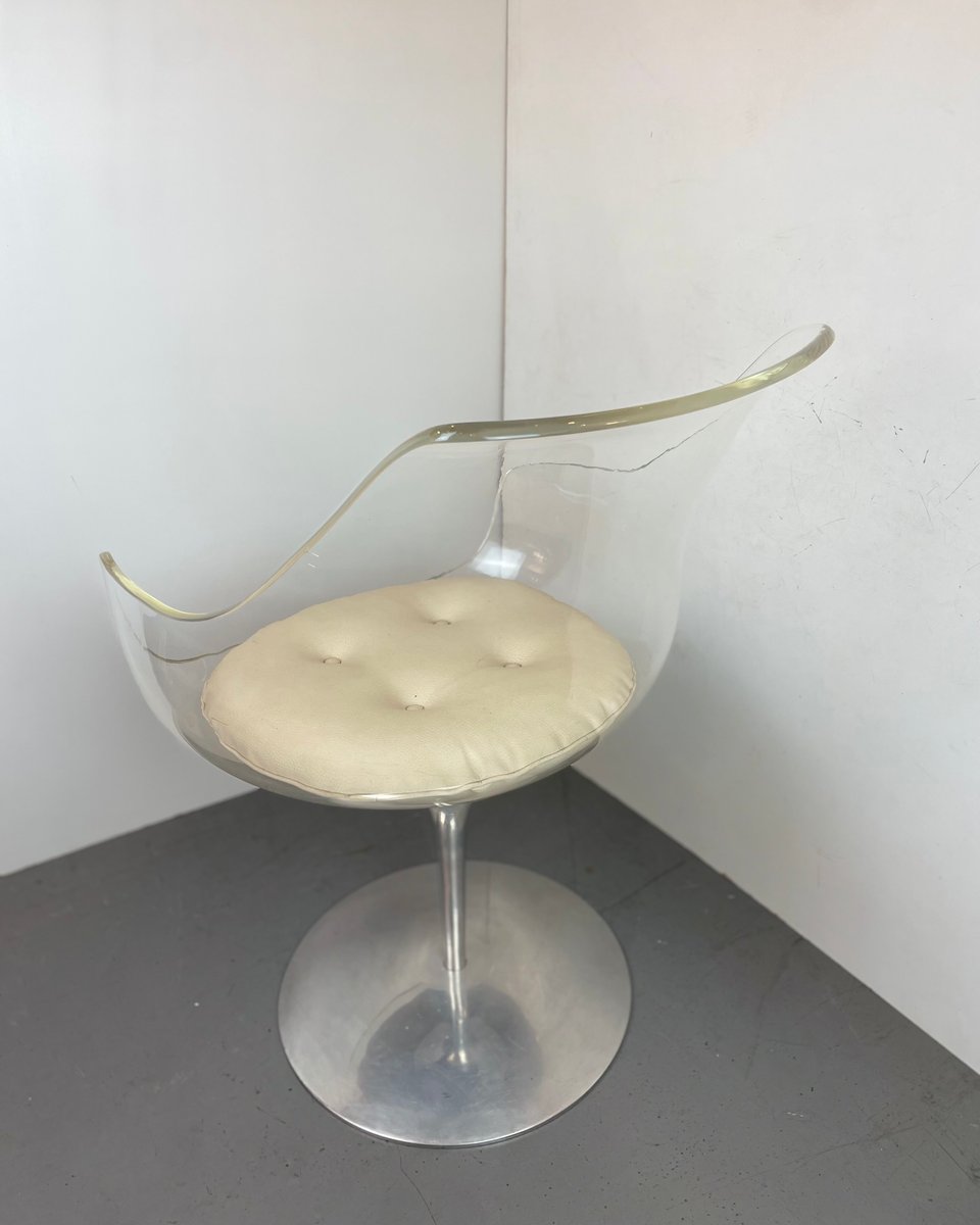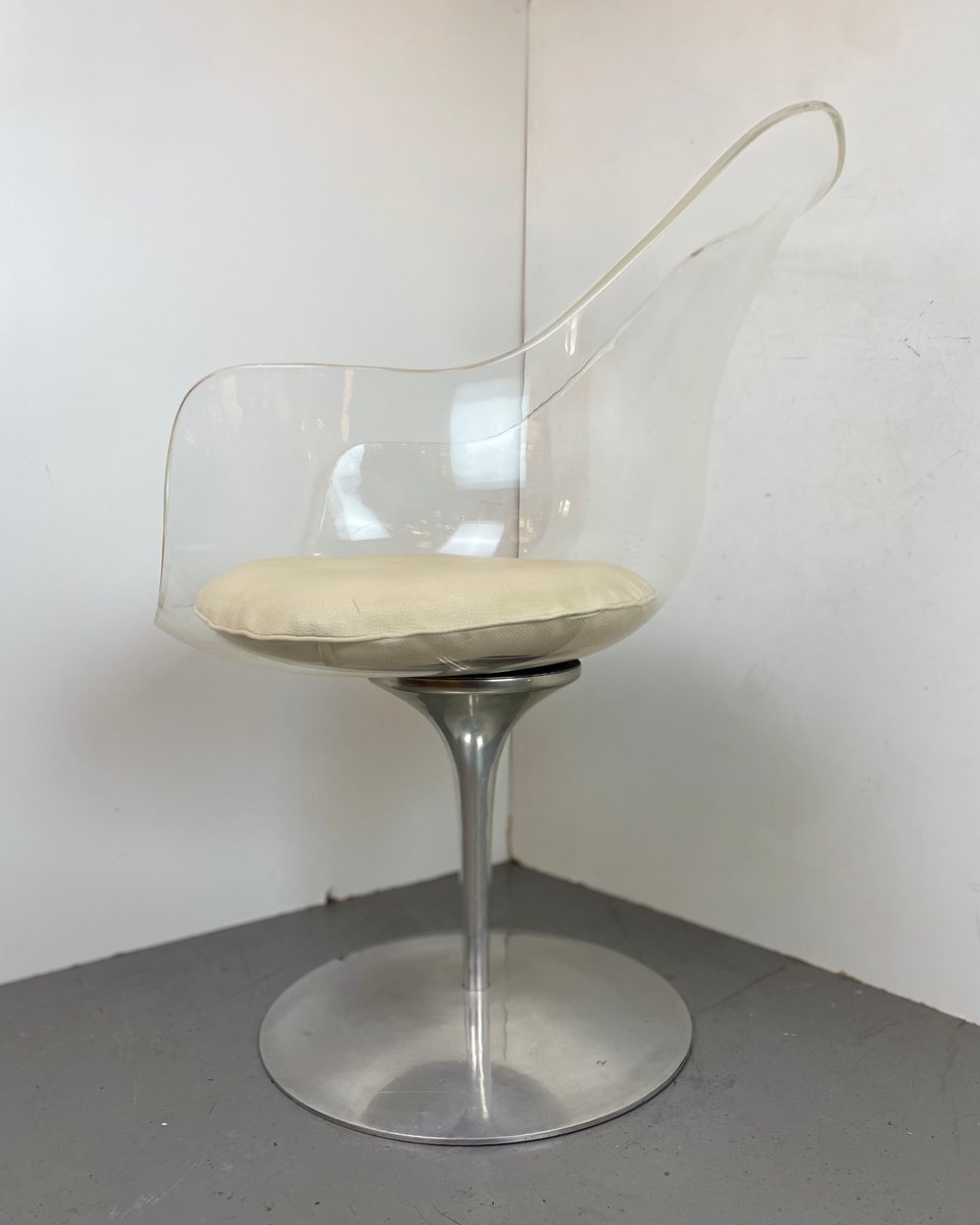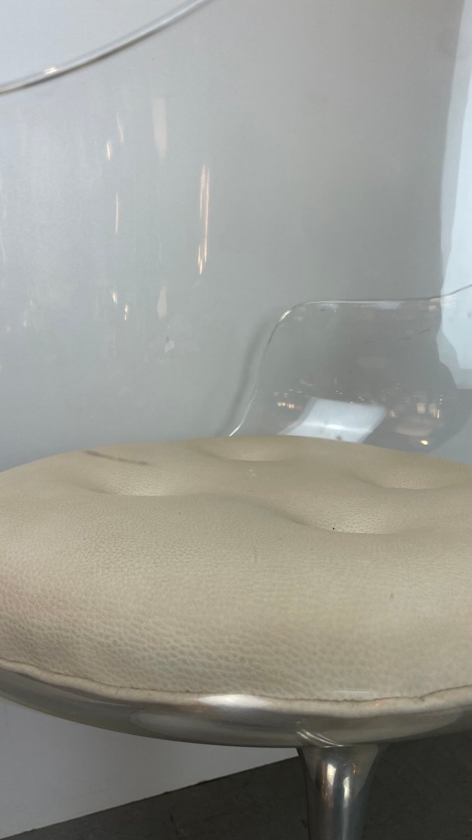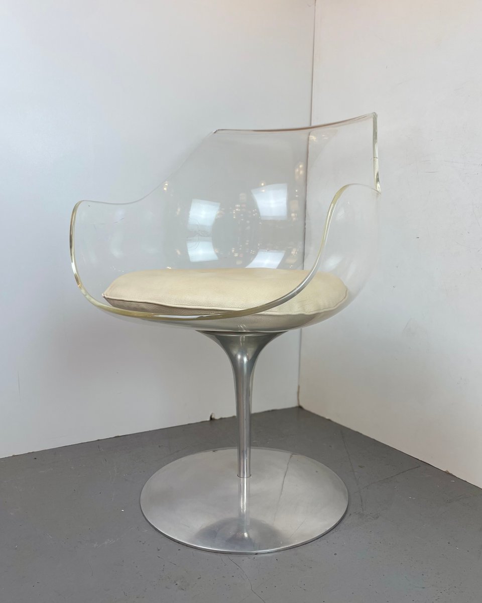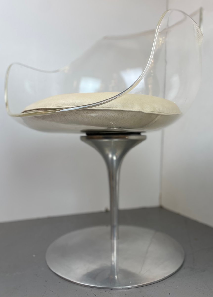 Iconic chair with arms made of a rotating transparent acrylic glass shell with beige leather cushion, mounted on a cast aluminum tulip base. from the series Invisible, this masterpiece of modernist design is named Champagne and was designed in Paris by the French couple Estelle & Erwin Laverne for the atelier Formes Nouvelles in 1957.