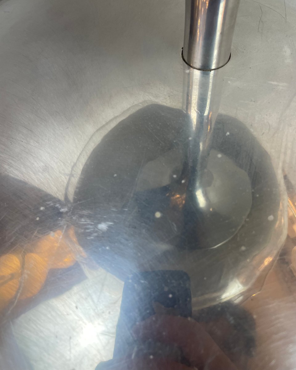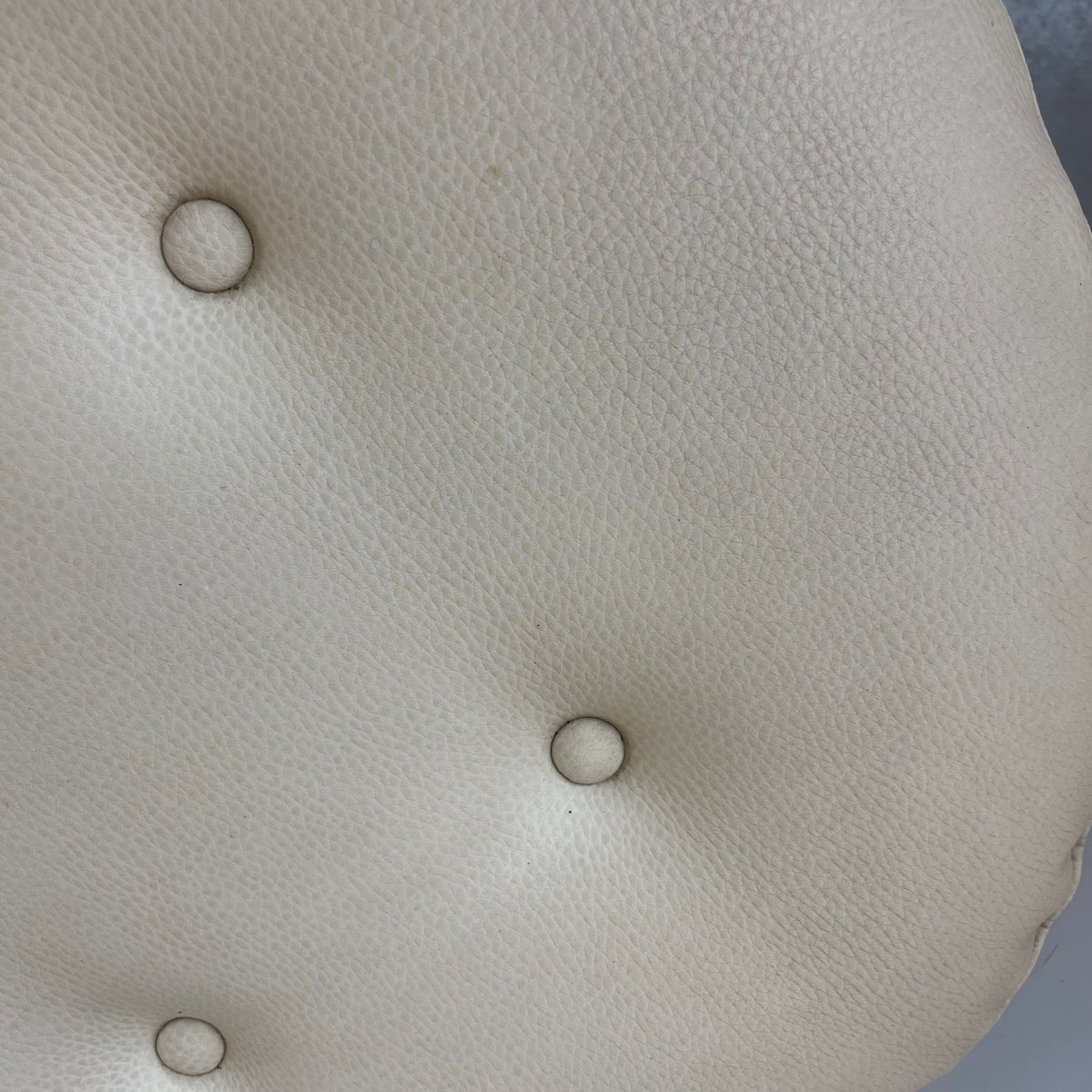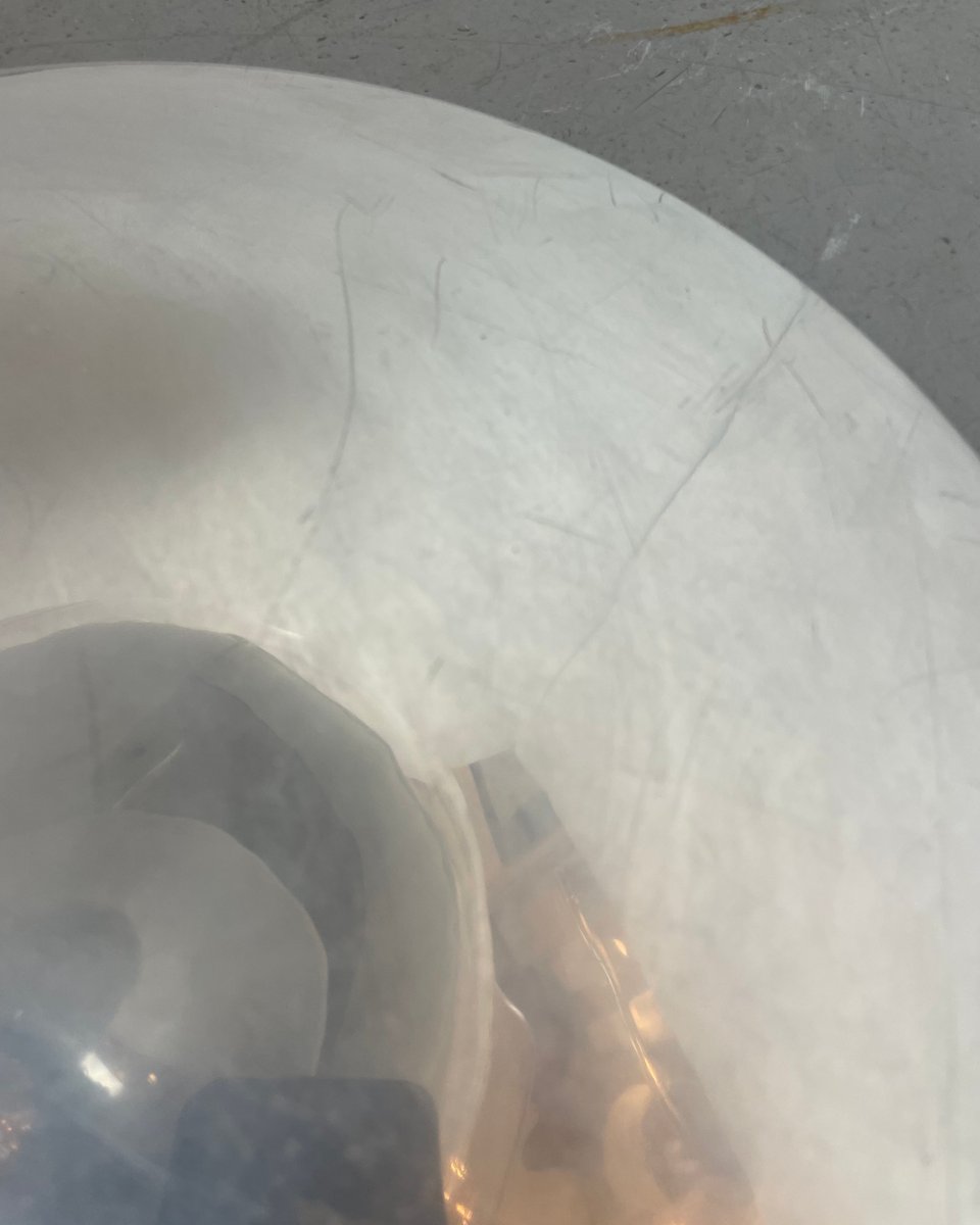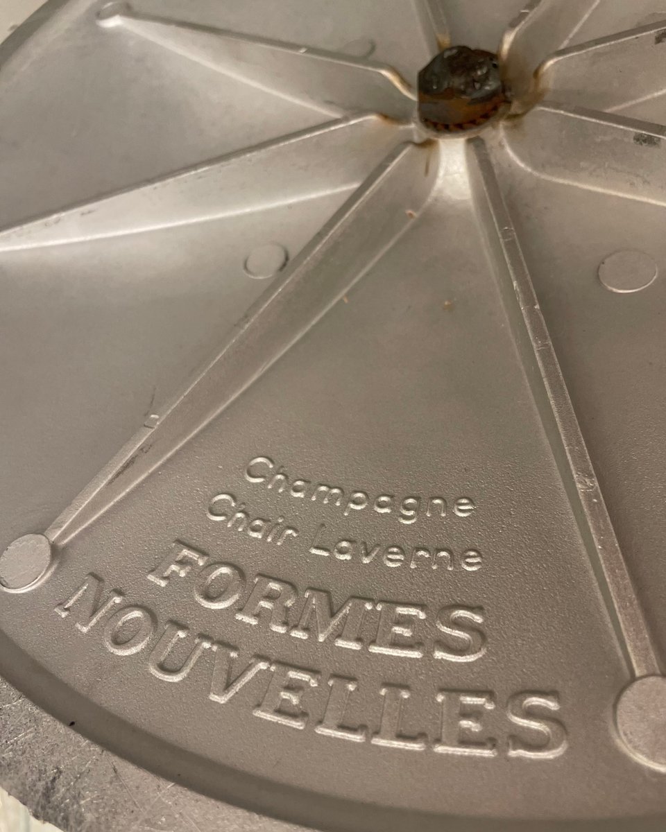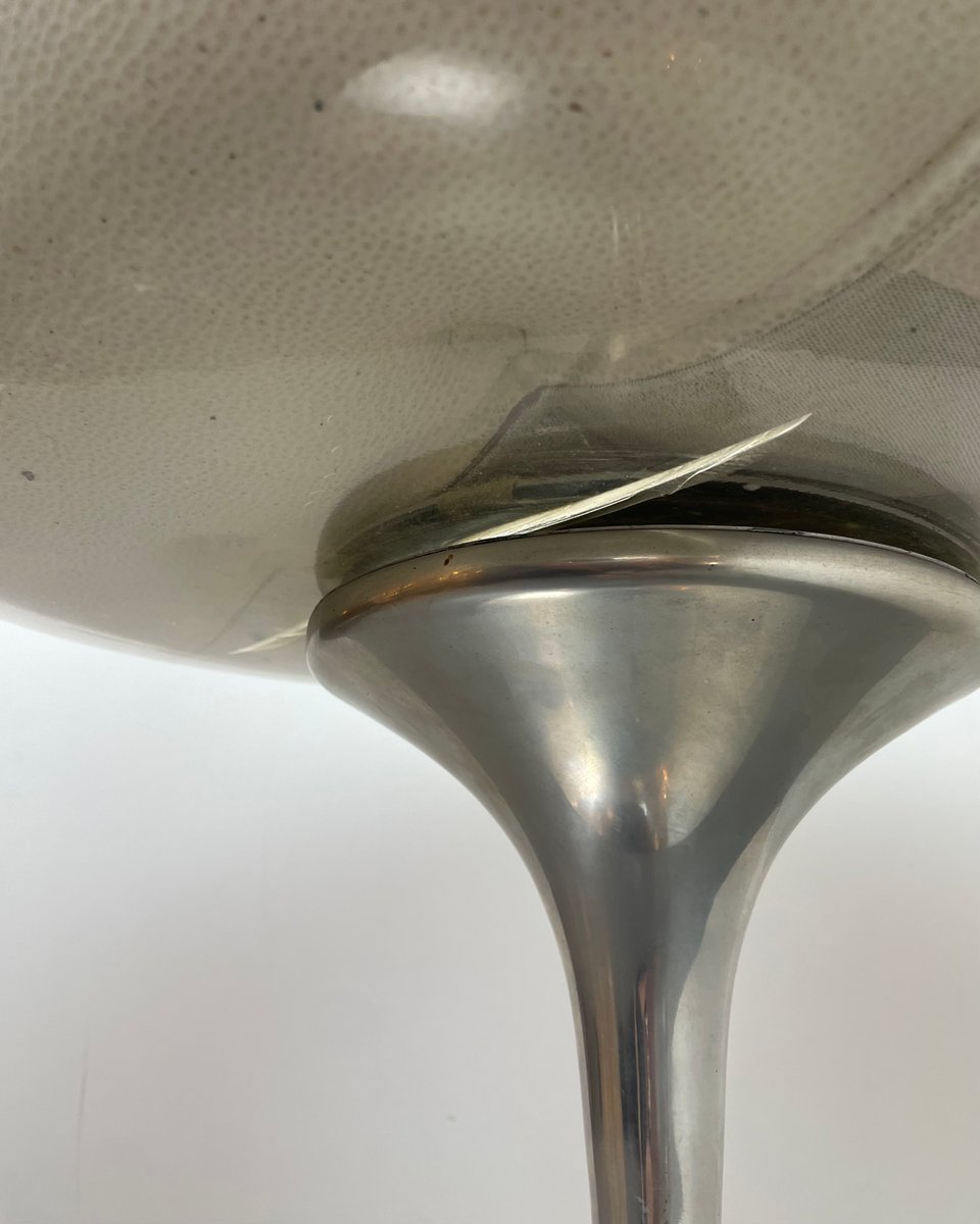 Iconic chair with arms made of a rotating transparent acrylic glass shell with beige leather cushion, mounted on a cast aluminum tulip base. from the series Invisible, this masterpiece of modernist design is named Champagne and was designed in Paris by the French couple Estelle & Erwin Laverne for the atelier Formes Nouvelles in 1957.
