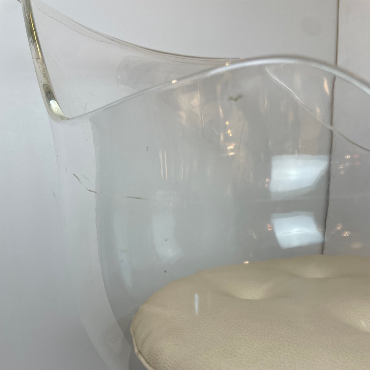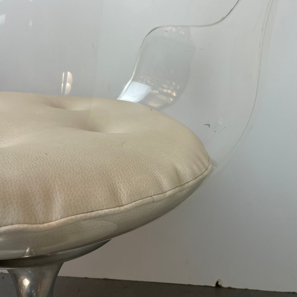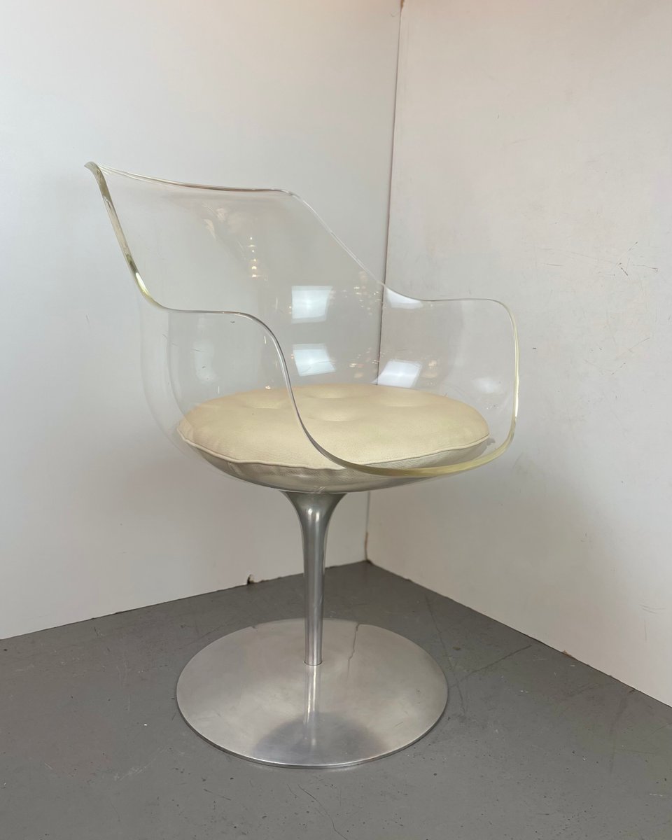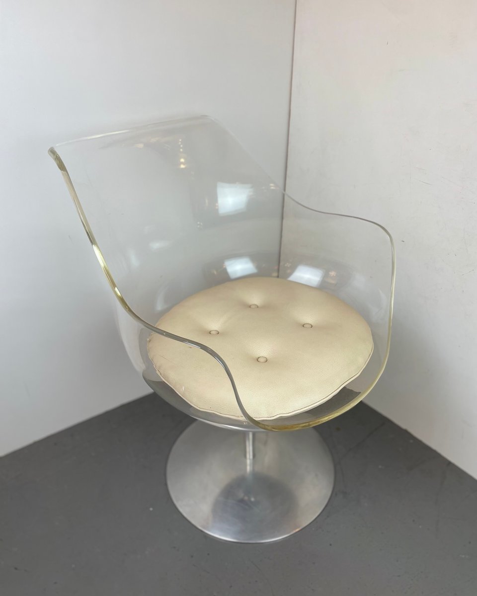 Kultiger Sessel mit Armlehnen aus einer drehbaren, transparenten Acrylglas-Schale mit beigem Lederkissen, montiert auf einem Tulpenfuß aus Aluminiumguss. Dieses Meisterwerk des modernistischen Designs aus der Serie „Invisible“ trägt den Namen „Champagne“ und wurde 1957 in Paris vom französischen Ehepaar Estelle & Erwin Laverne für das Atelier Formes Nouvelles entworfen. -