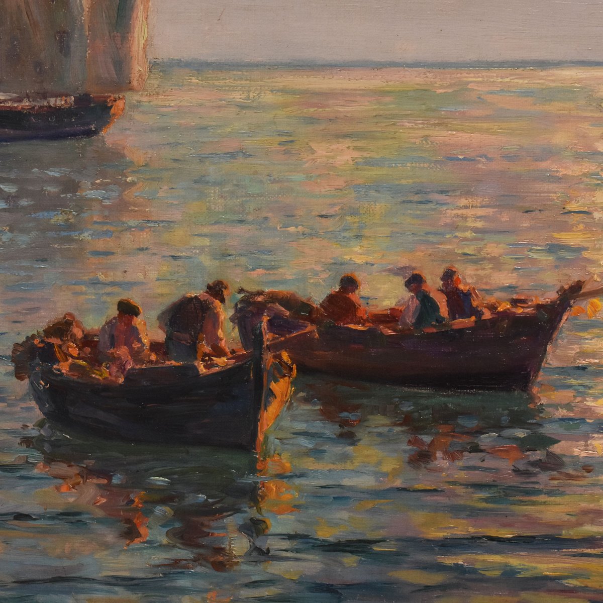 aus dem späten 19. oder frühen 20. Jahrhundert. Das Kunstwerk zeigt im Vordergrund zwei Ruderboote mit Matrosen, im Hintergrund,