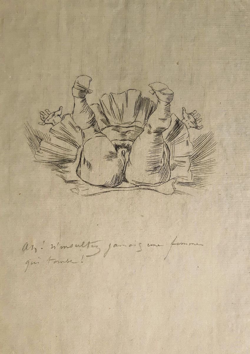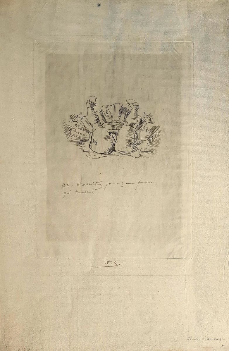Chute d’un Ange is an original drypoint on laid paper realized by Félicien Rops, hand monogrammed and inscribed ''Ah! N'insultez jambs une femme qui tombe!''. In very good conditions. Félicien Victor Joseph Rops ( 1833-1898) was a Belgian artist associated with Symbolism and the Parisian Fin-de Siecle. He was a painter, illustrator, caricaturist, also a prolific and innovative printmaker, particularly in intaglio.Eroticism mixed with mortality and evil themes is one of the most prominent aspects of her work. He is best known for his graphic works, many of which are horror or erotic. Rupes was educated in Brussels. His first drawings were published in the humorous newspaper Crocodile (1855) and Euilenspiegel. He also created watercolors. The praise given to him by writers such as Charles Baudelaire and Yoris Karl Hussman's placed him at the forefront of the decadent school of the late 19th century. He has lived in France since 1878. This artwork is shipped from Italy. Under existing legislation, any artwork in Italy created over 50 years ago by an artist who has died requires a licence for export regardless of the work’s market price. The shipping may require additional handling days to require the licence according to the final destination of the artwork.