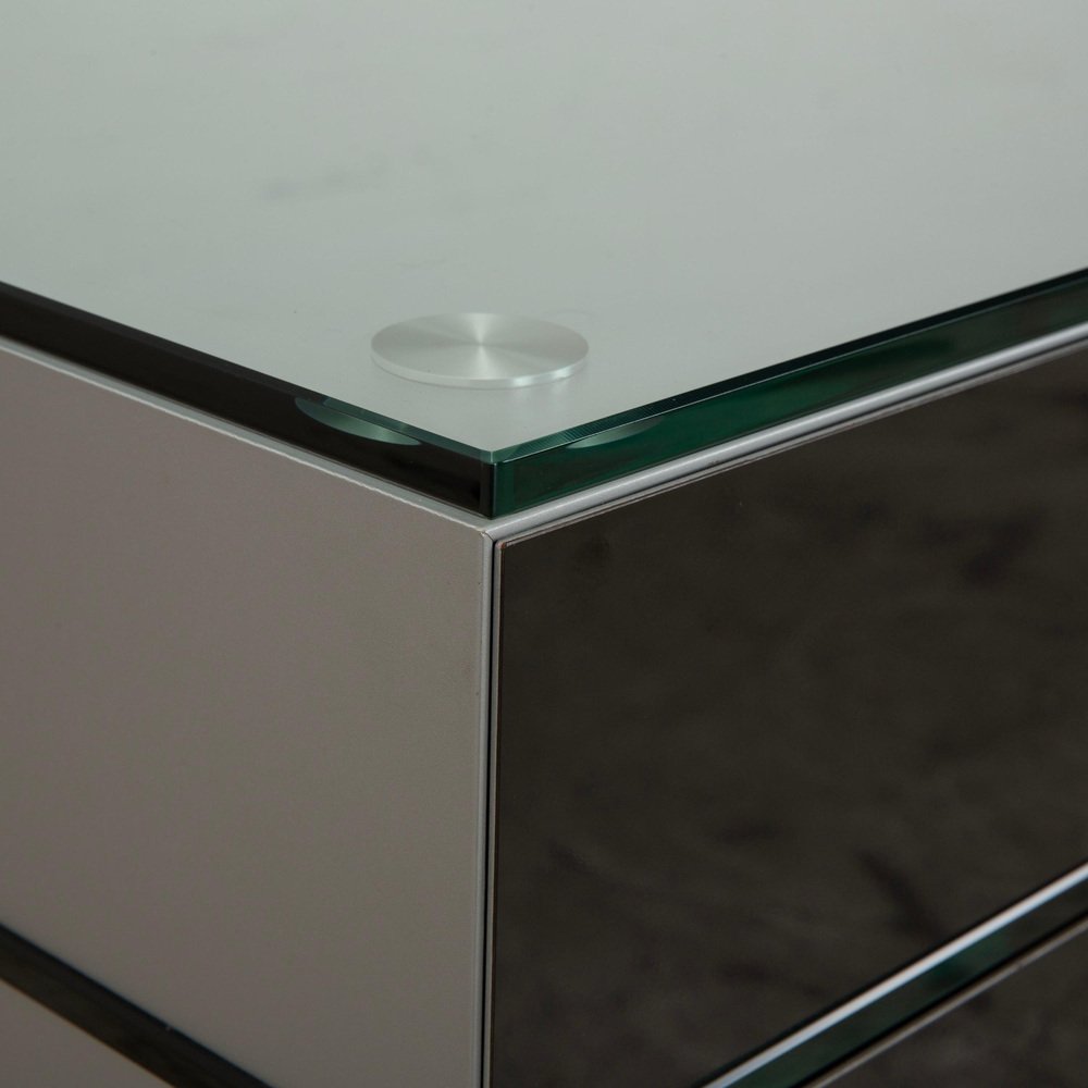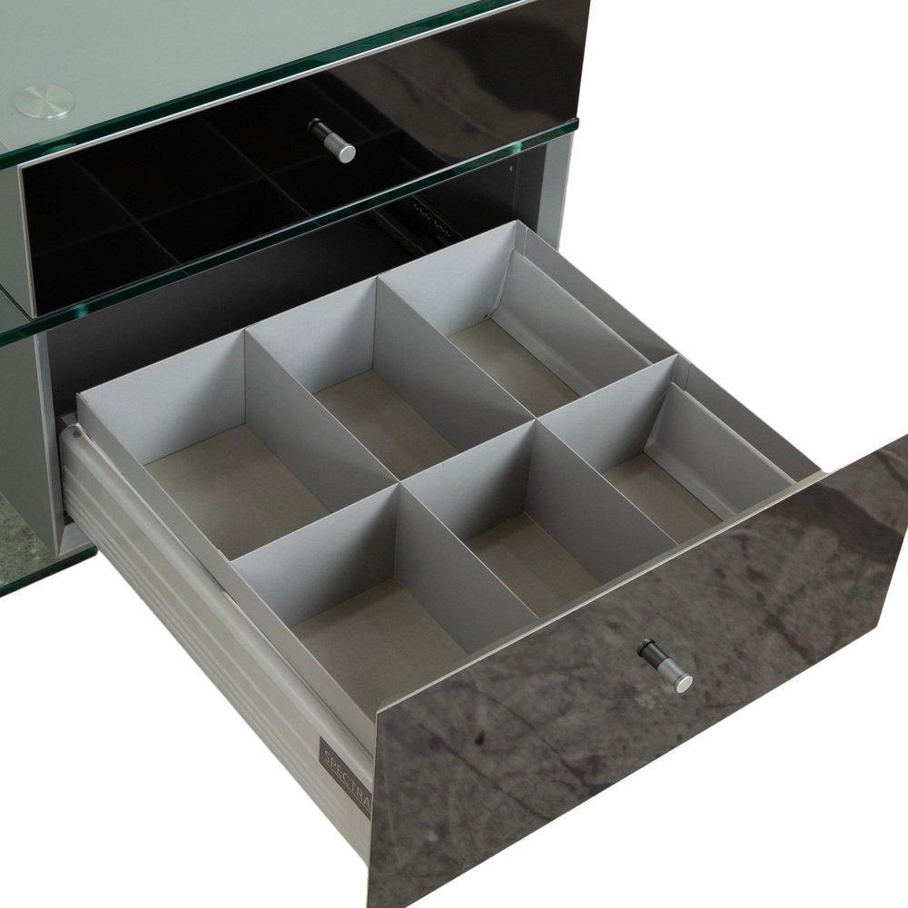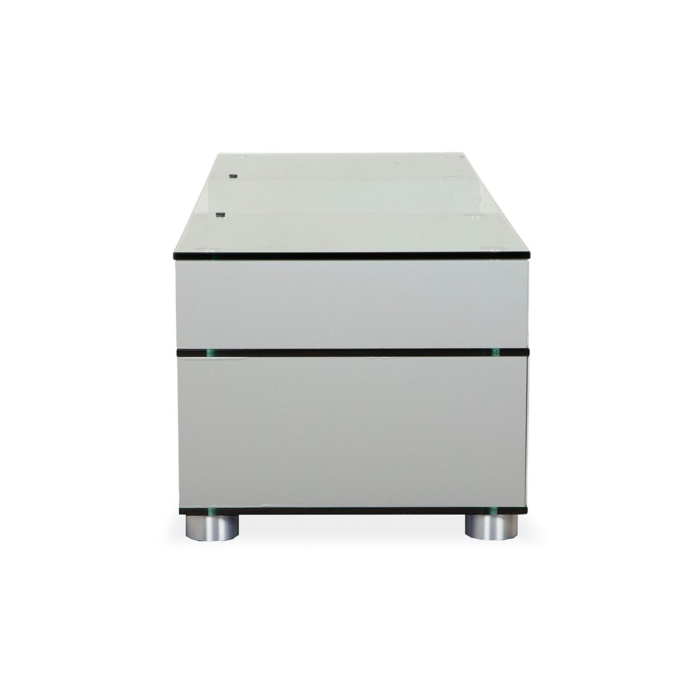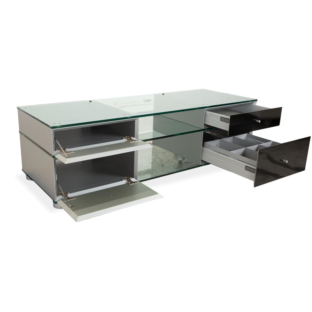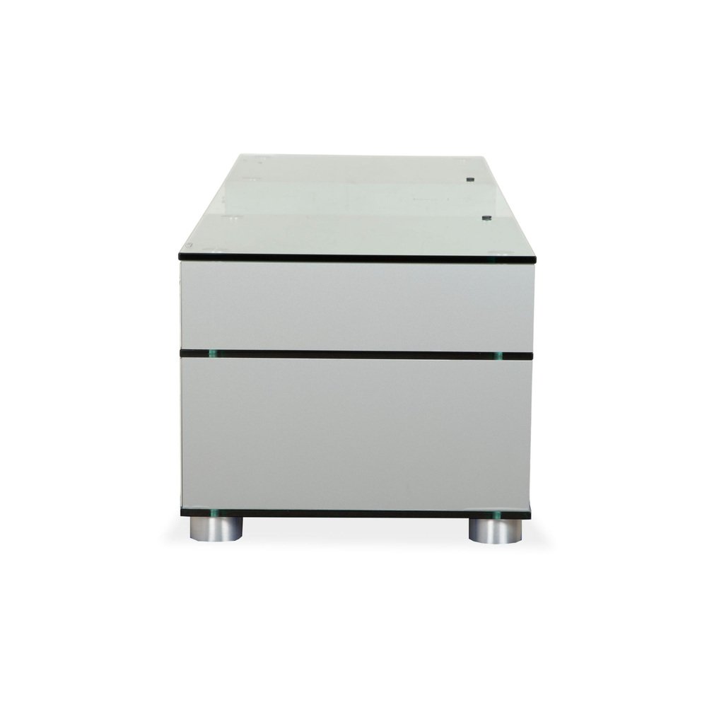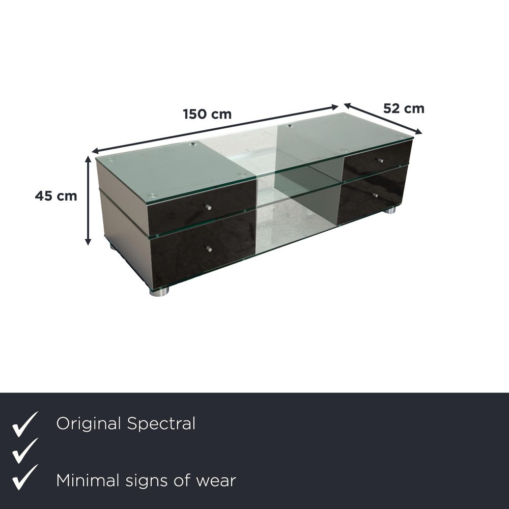 The elegant Spectral CL 1552 sideboard embodies the Spectral brand's design philosophy, which combines functionality with minimalist aesthetics. It is a prime example of modern elegance. The clean lines and high-quality materials underscore the timeless character of this sideboard. Crafted from sophisticated black glass with a transparent center compartment, the sideboard integrates perfectly into contemporary living spaces. On the left, two drop-down doors offer ample storage for a tidy multimedia solution, discreetly concealing cables. On the right, two drawers provide additional storage. The Spectral CL 1552 sideboard impresses not only with its attractive appearance but also with its well-engineered construction, ensuring durability and stability.