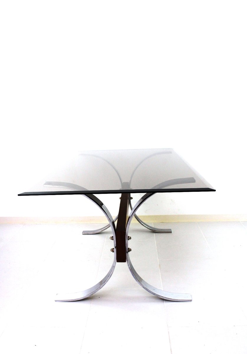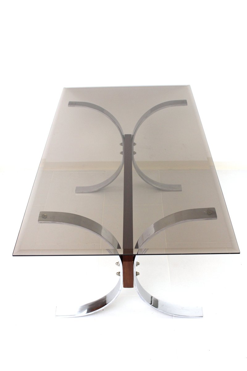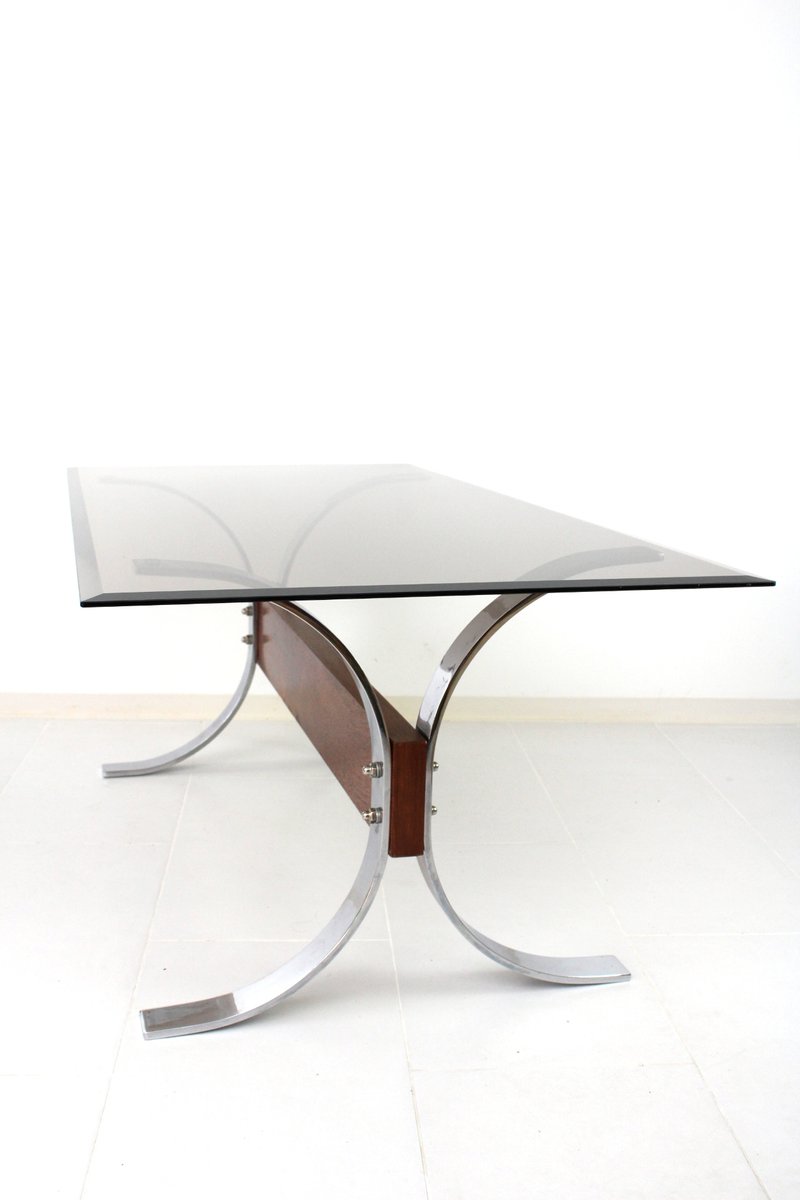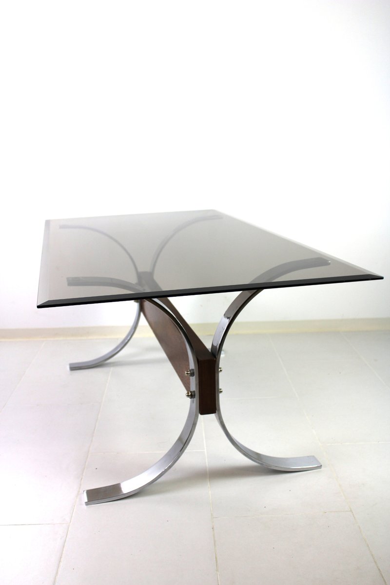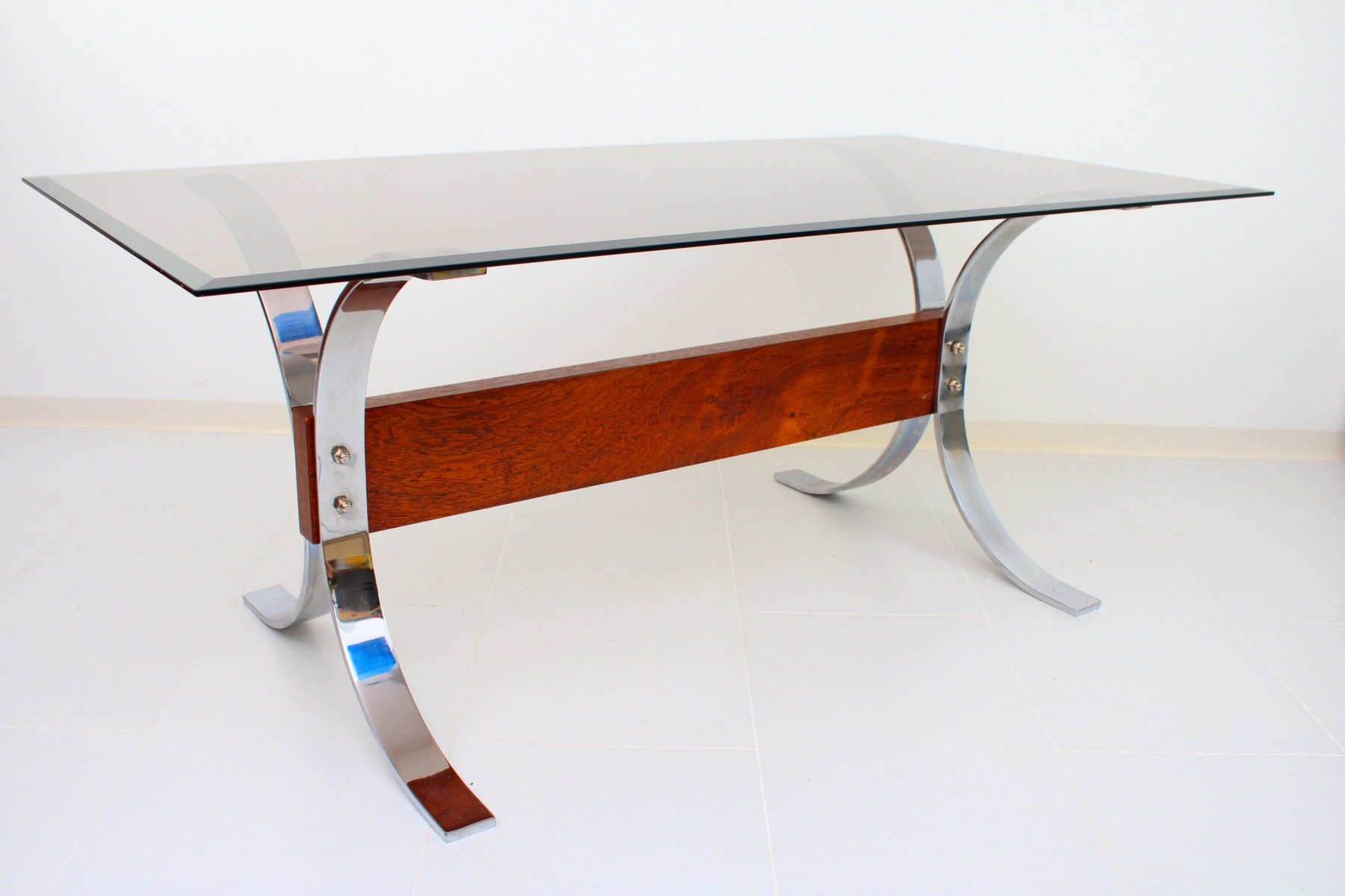 Couchtisch aus verchromtem Stahl & Holz mit Tischplatte aus Rauchglas, 1970er