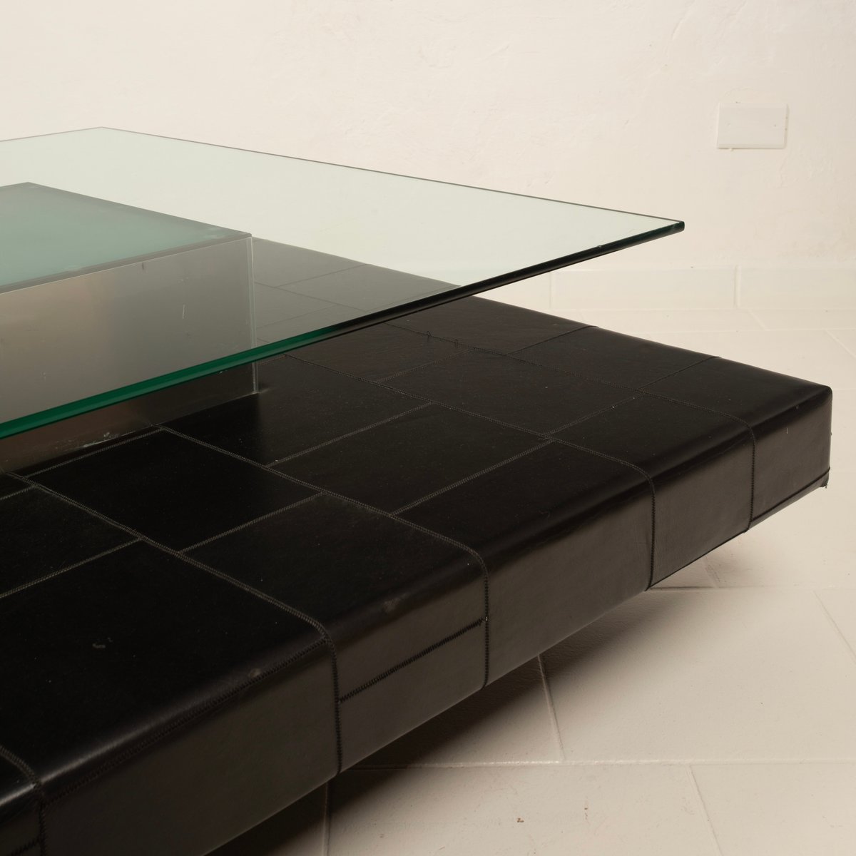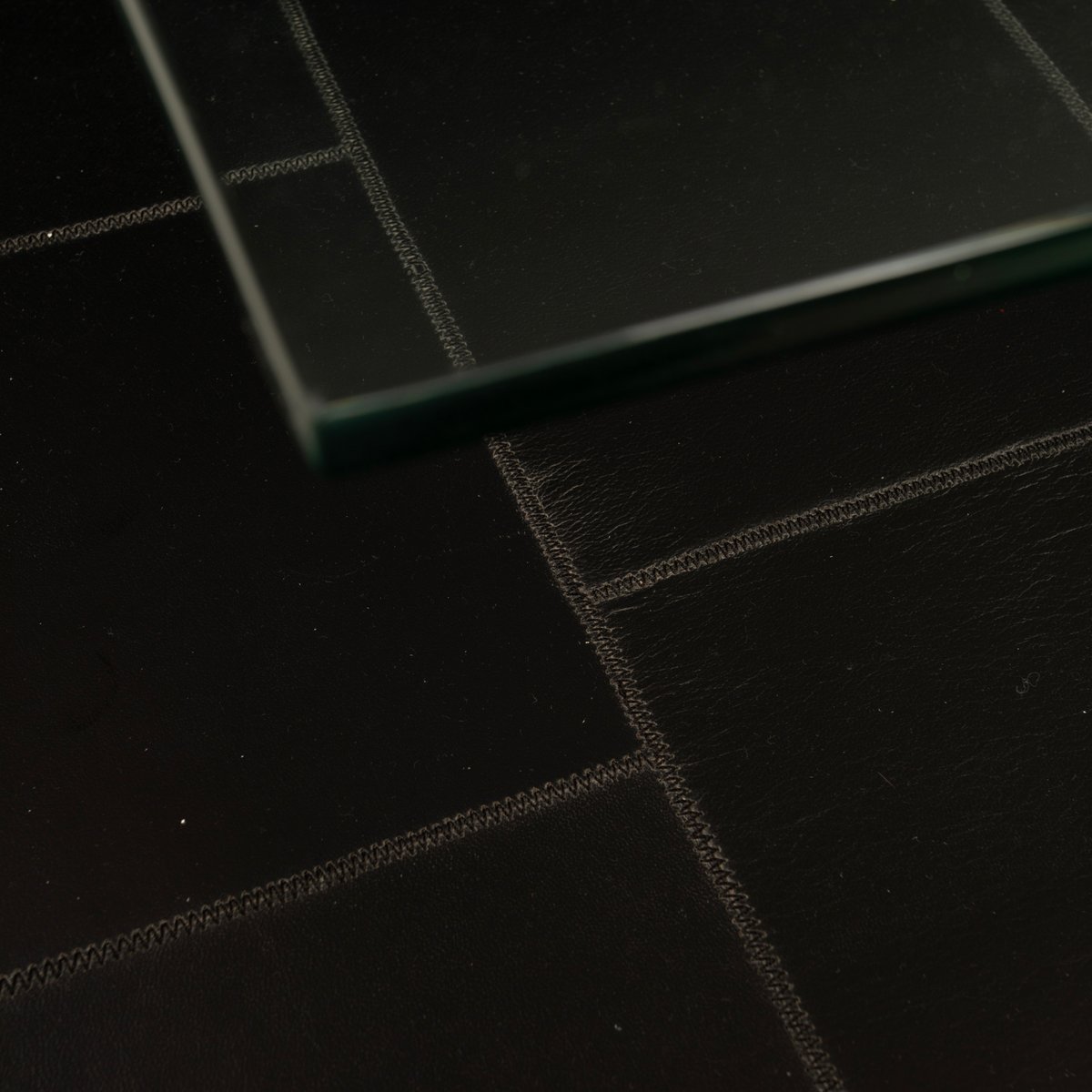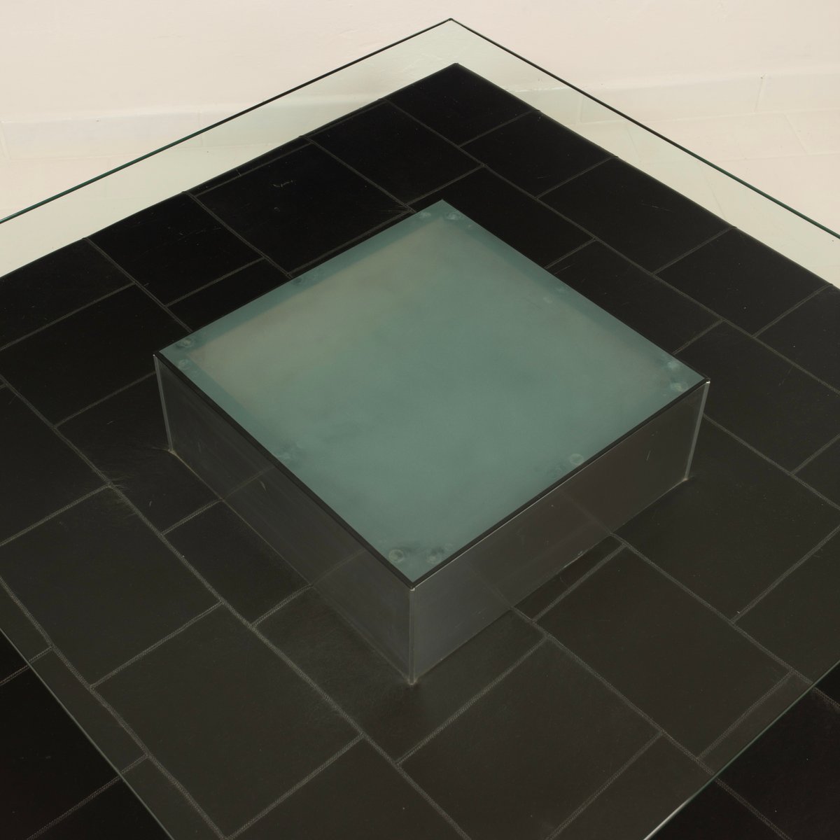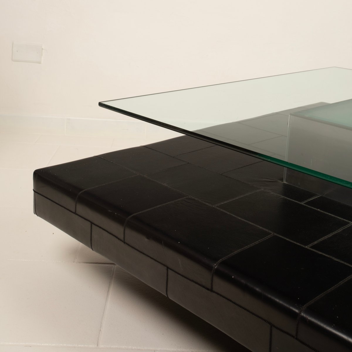 A distinctive and highly qualifying element is the intermediate level upholstered in fine pecari leather, a rare and extremely high-quality material historically associated with the artisanal excellence of Poltrona Frau. The leather, meticulously worked and stitched into regular square panels, introduces a tactile and sensory dimension that both contrasts with and balances the severity of the steel and the lightness of the glass. The stitching pattern articulates the surface with a measured rhythm, recalling an almost architectural grammar, fully consistent with Agnoli’s design language.