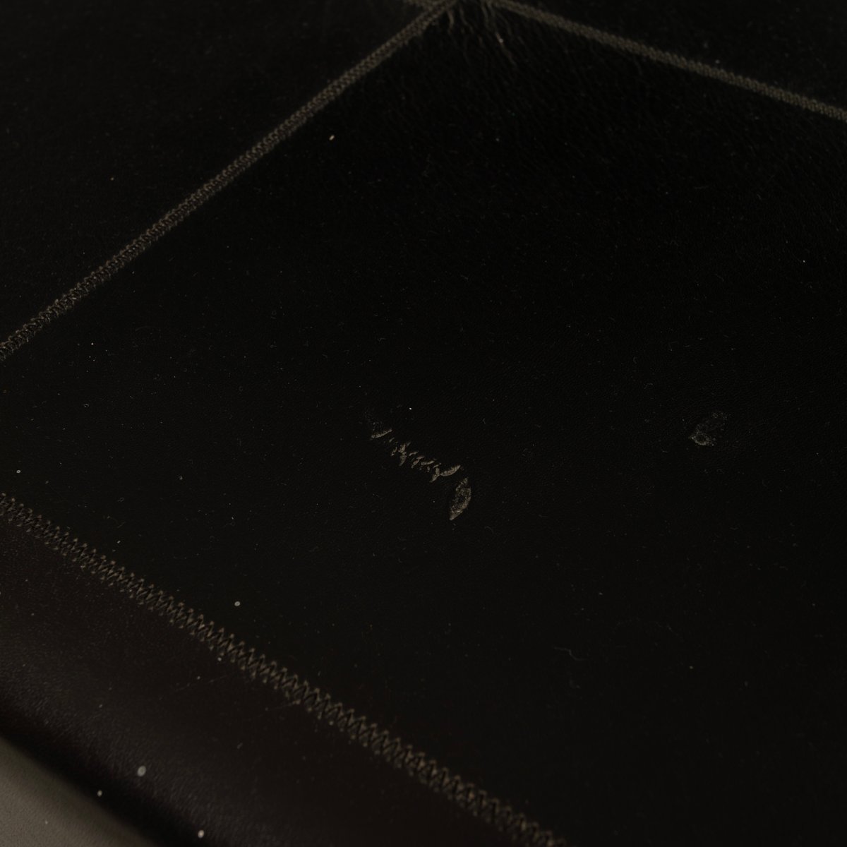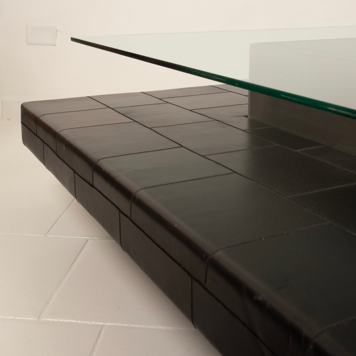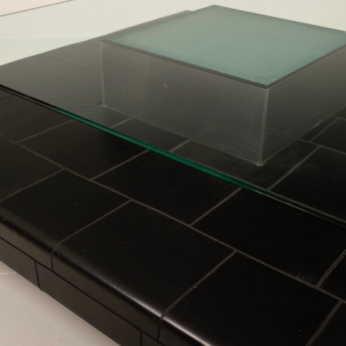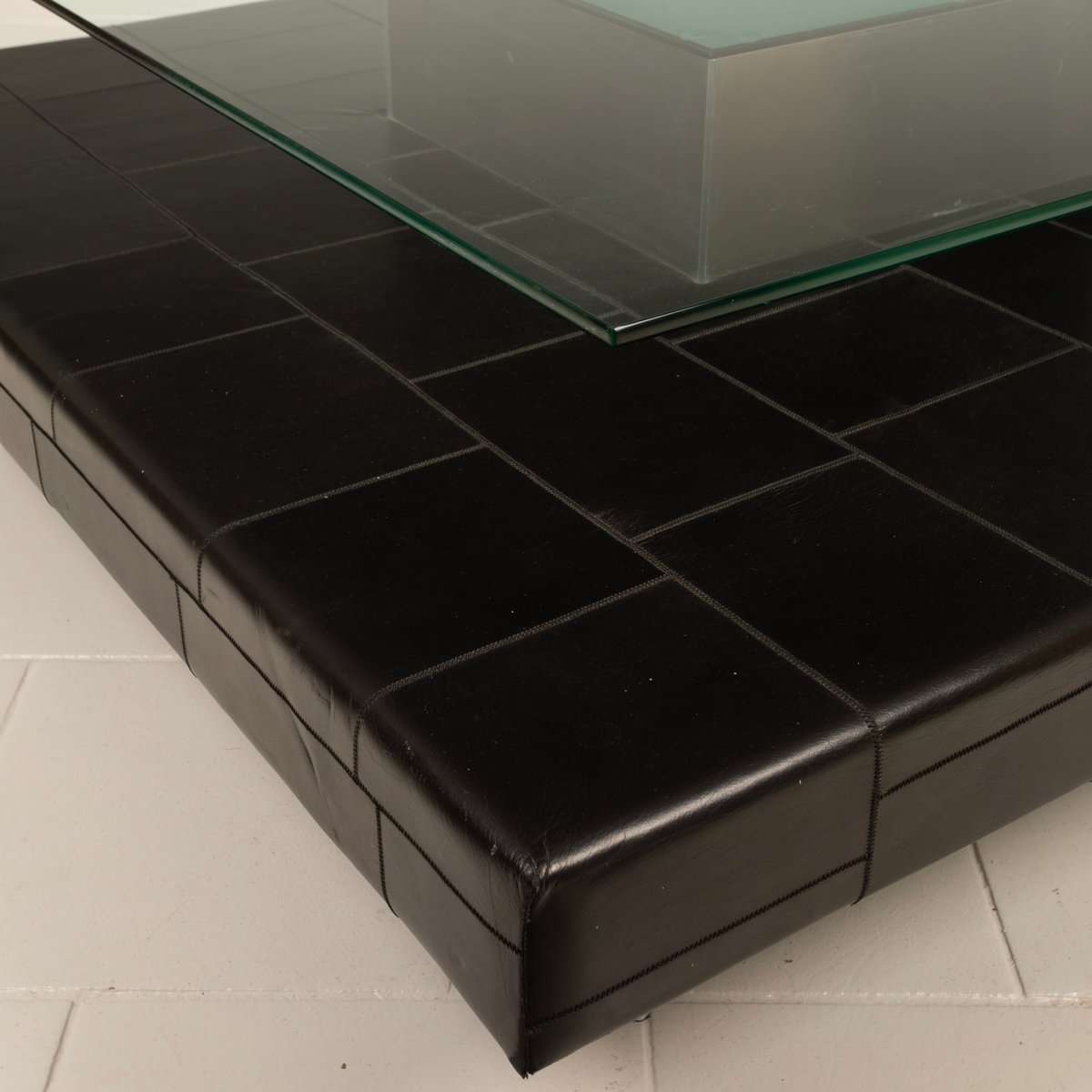 A distinctive and highly qualifying element is the intermediate level upholstered in fine pecari leather, a rare and extremely high-quality material historically associated with the artisanal excellence of Poltrona Frau. The leather, meticulously worked and stitched into regular square panels, introduces a tactile and sensory dimension that both contrasts with and balances the severity of the steel and the lightness of the glass. The stitching pattern articulates the surface with a measured rhythm, recalling an almost architectural grammar, fully consistent with Agnoli’s design language.