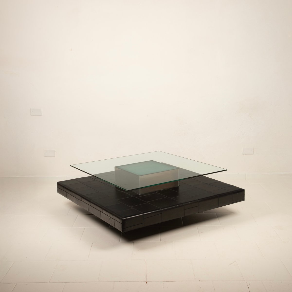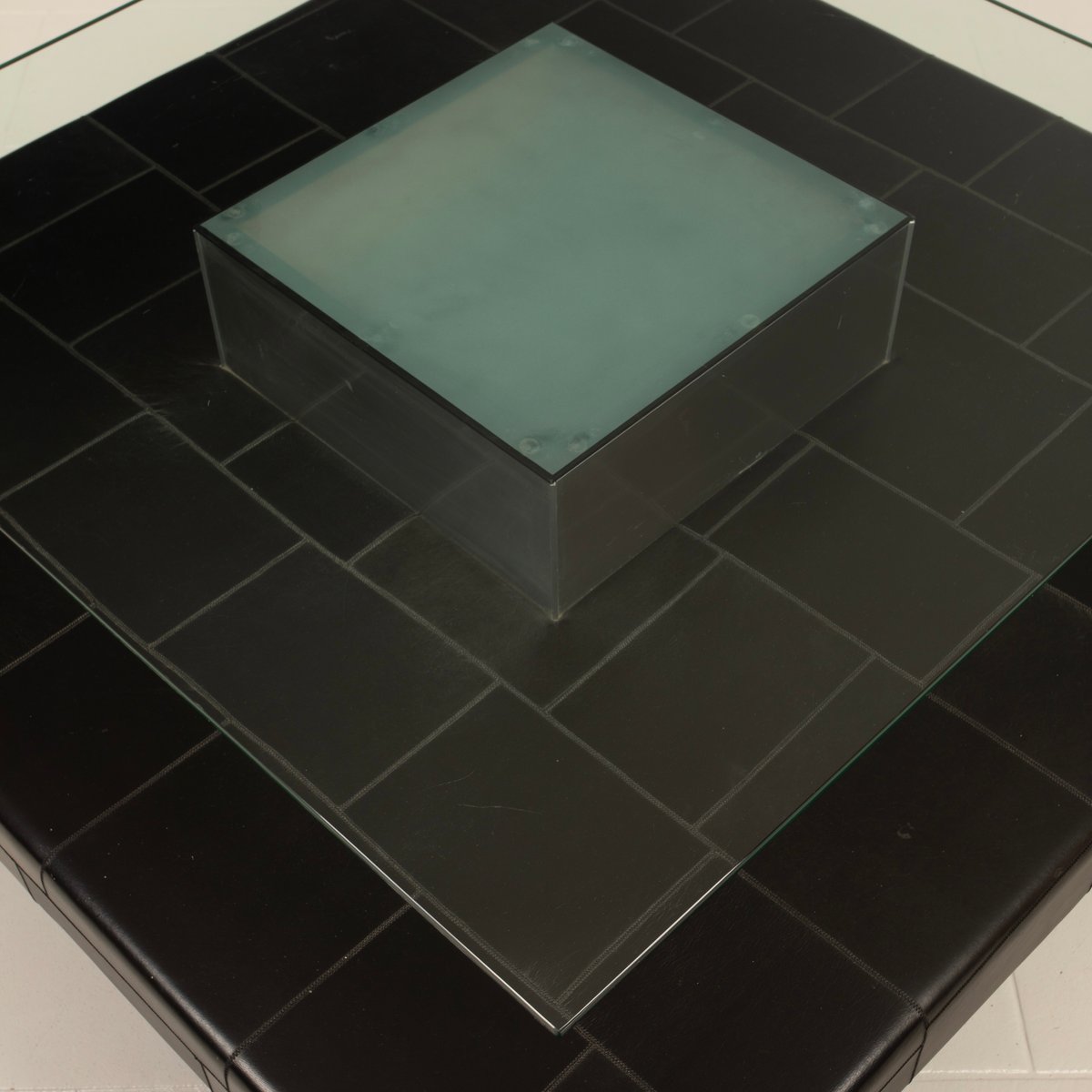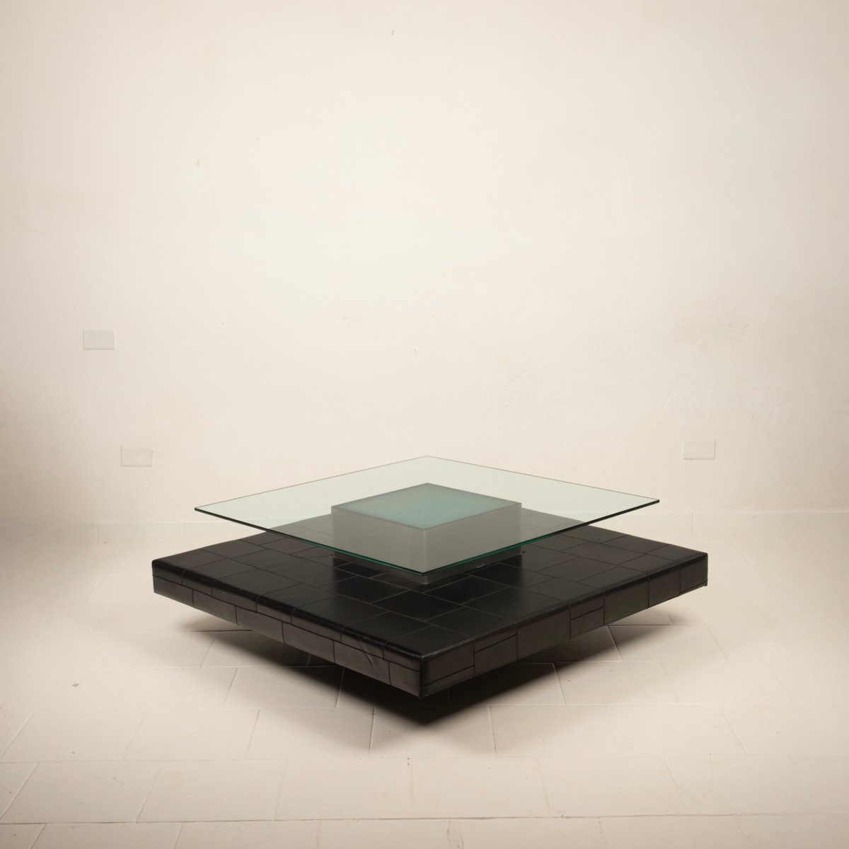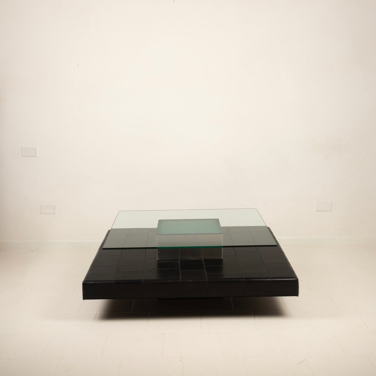 Distinctive Design: Architectural and balanced composition, characterized by a monolithic steel base, an acid-etched glass top capable of filtering and diffusing light, and a refined intermediate level in pecari leather stitched into regular square panels, introducing a tactile and material dimension of great elegance