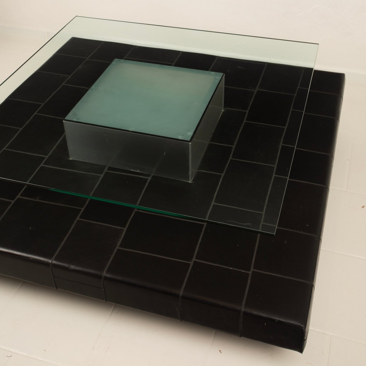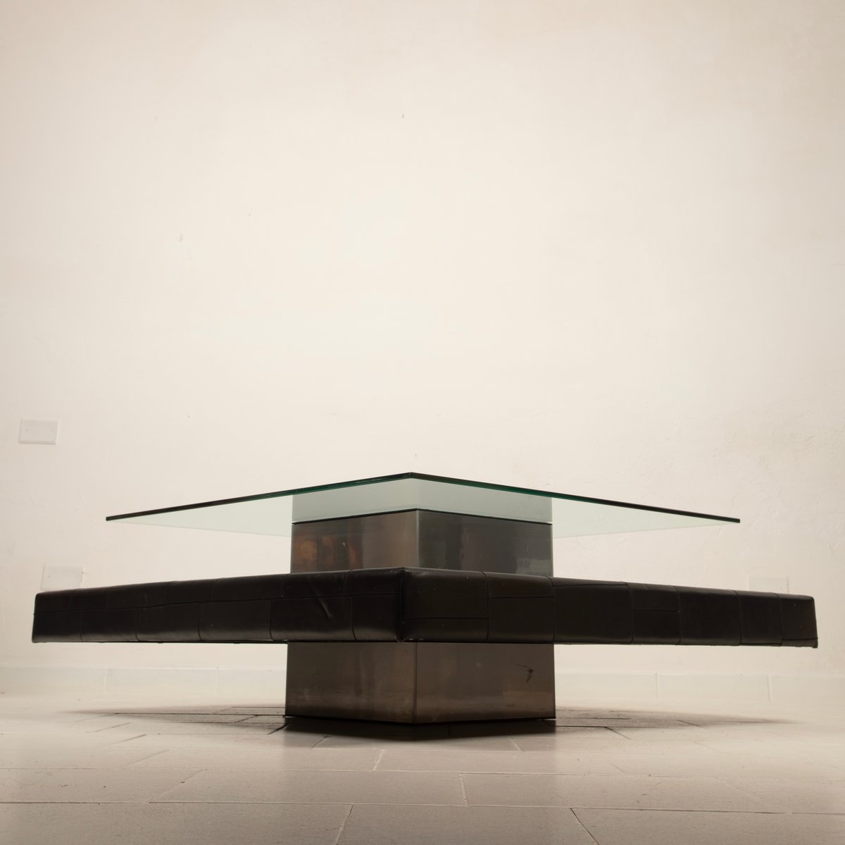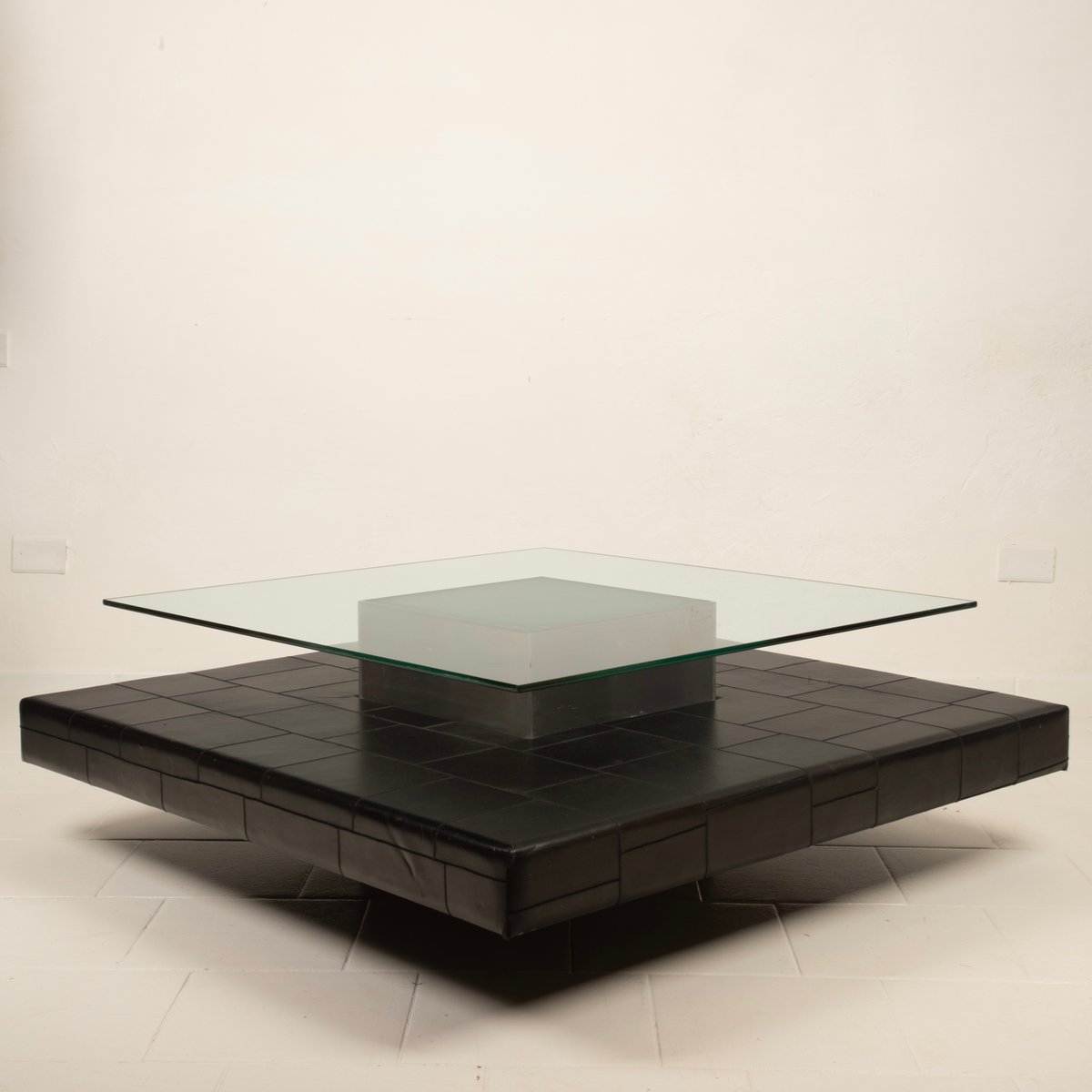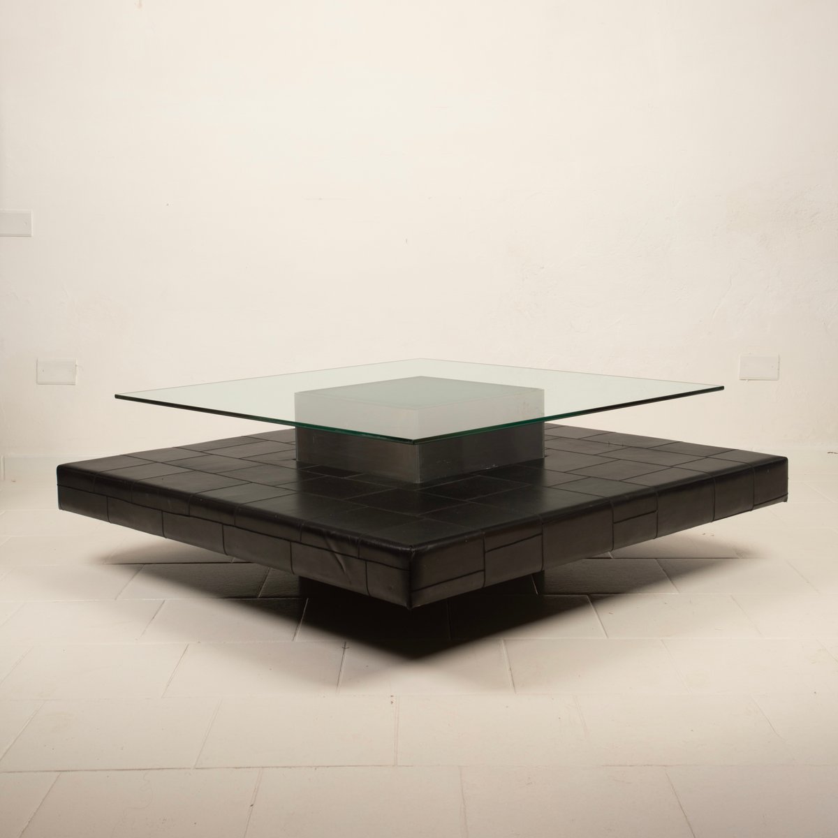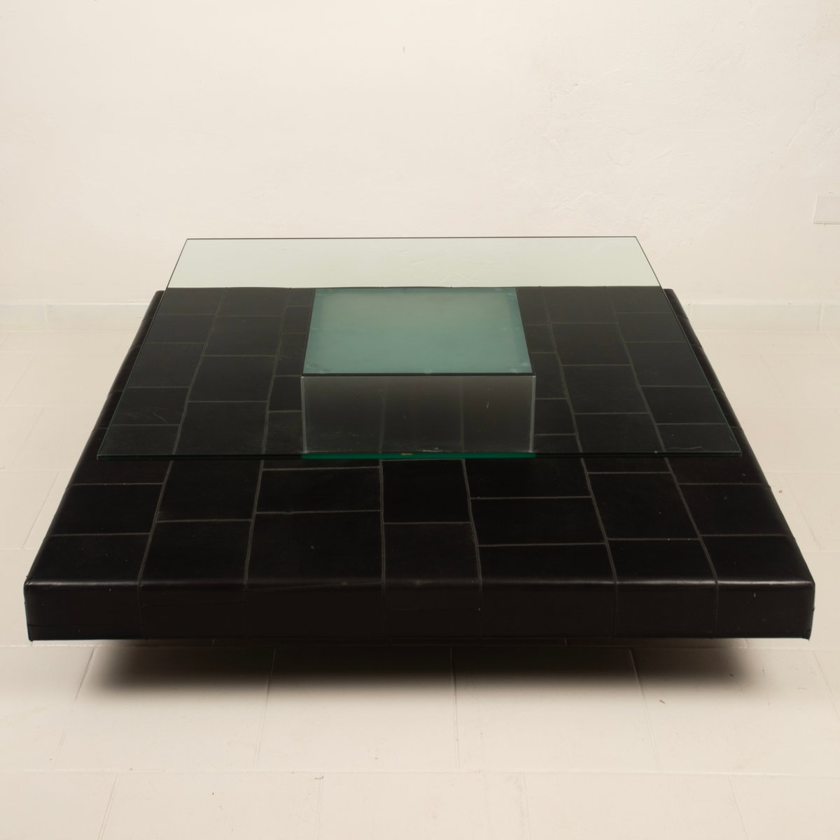 Distinctive Design: Architectural and balanced composition, characterized by a monolithic steel base, an acid-etched glass top capable of filtering and diffusing light, and a refined intermediate level in pecari leather stitched into regular square panels, introducing a tactile and material dimension of great elegance