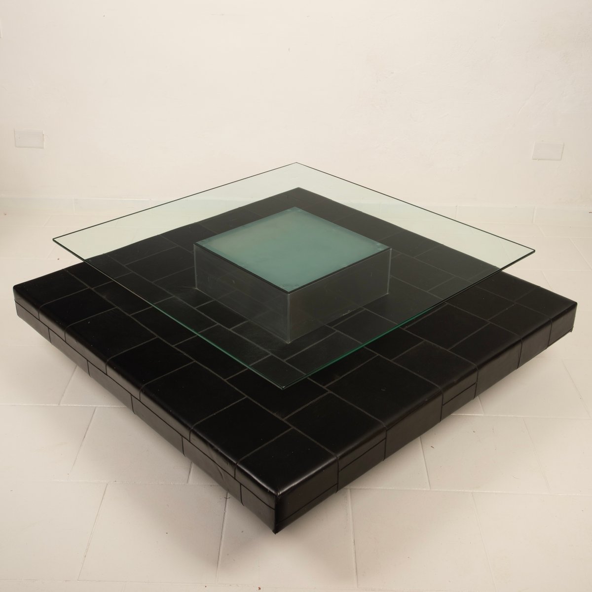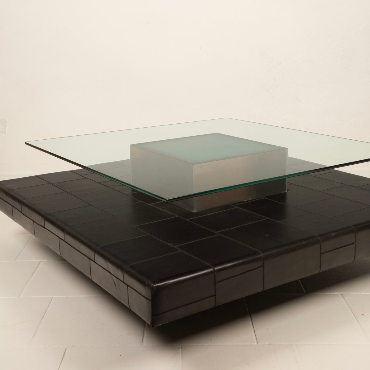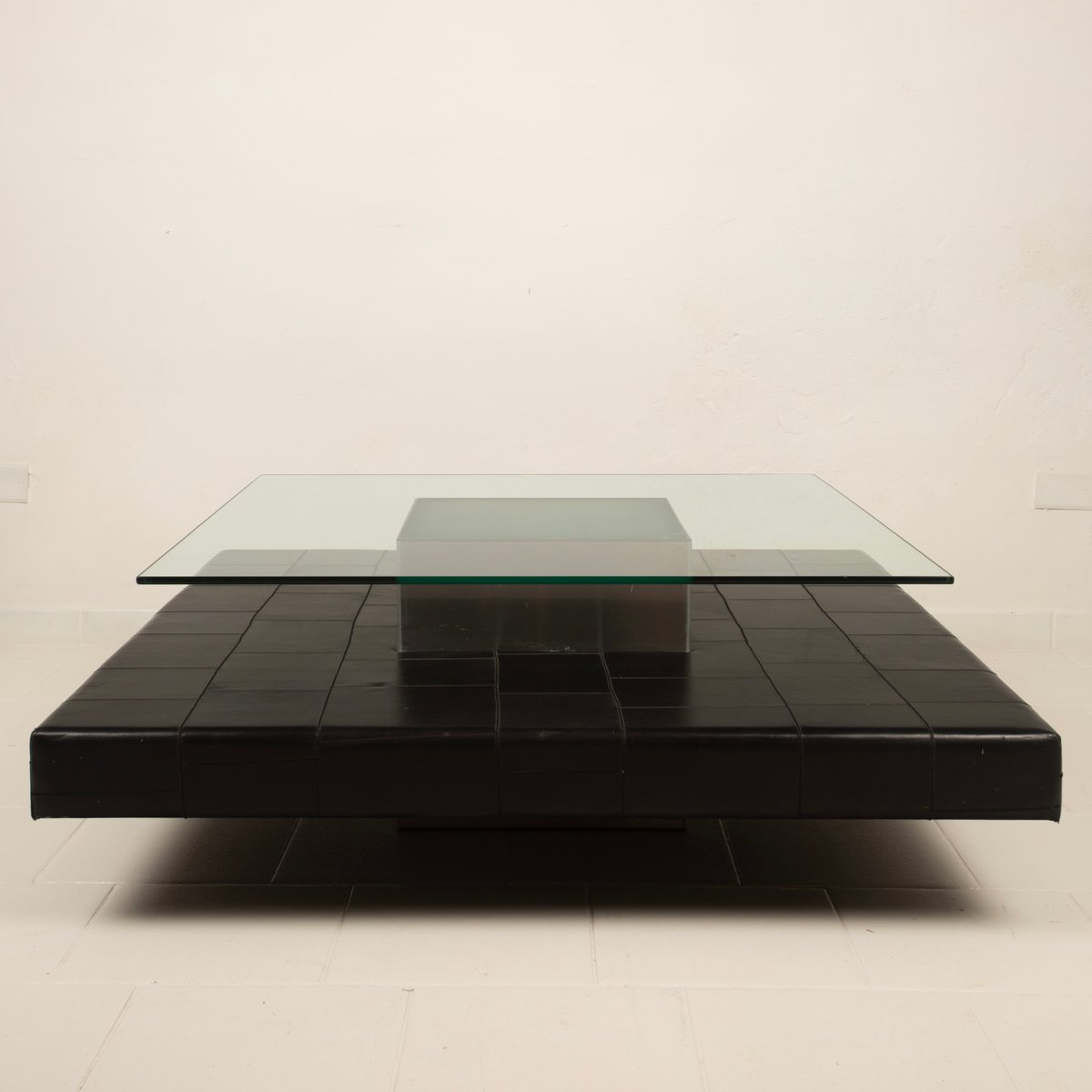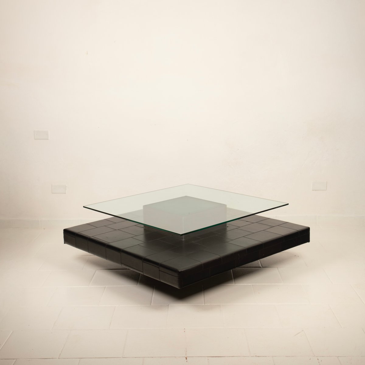 Distinctive Design: Architectural and balanced composition, characterized by a monolithic steel base, an acid-etched glass top capable of filtering and diffusing light, and a refined intermediate level in pecari leather stitched into regular square panels, introducing a tactile and material dimension of great elegance
