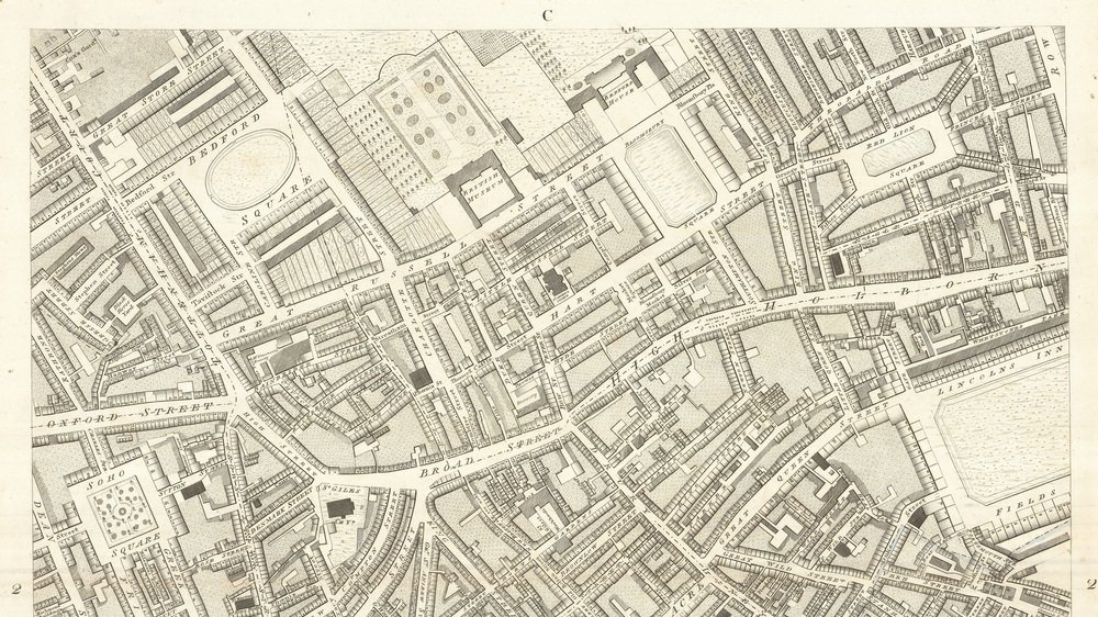 Am linken Rand befinden sich der Bedford Square, der Soho Square und die Compton Street, der Leicester Square und der Haymarket; am oberen Rand der Karte sind das British Museum, der Bloomsbury Square und der Red Lion Square eingezeichnet.