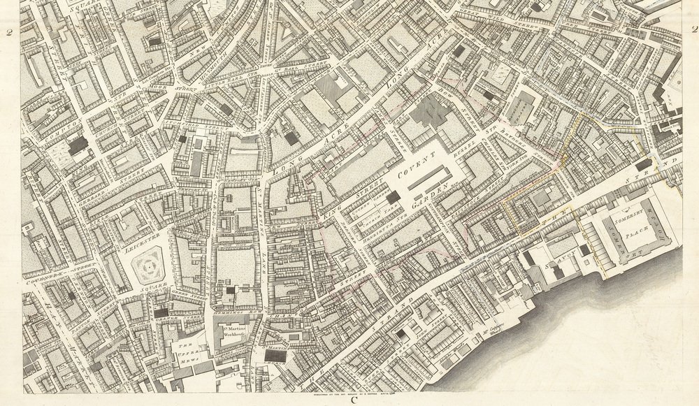 A map of London's West End from what Howgego describes as the 'largest and most important London map of the eighteenth century', on a scale of 26 inches to a mile.