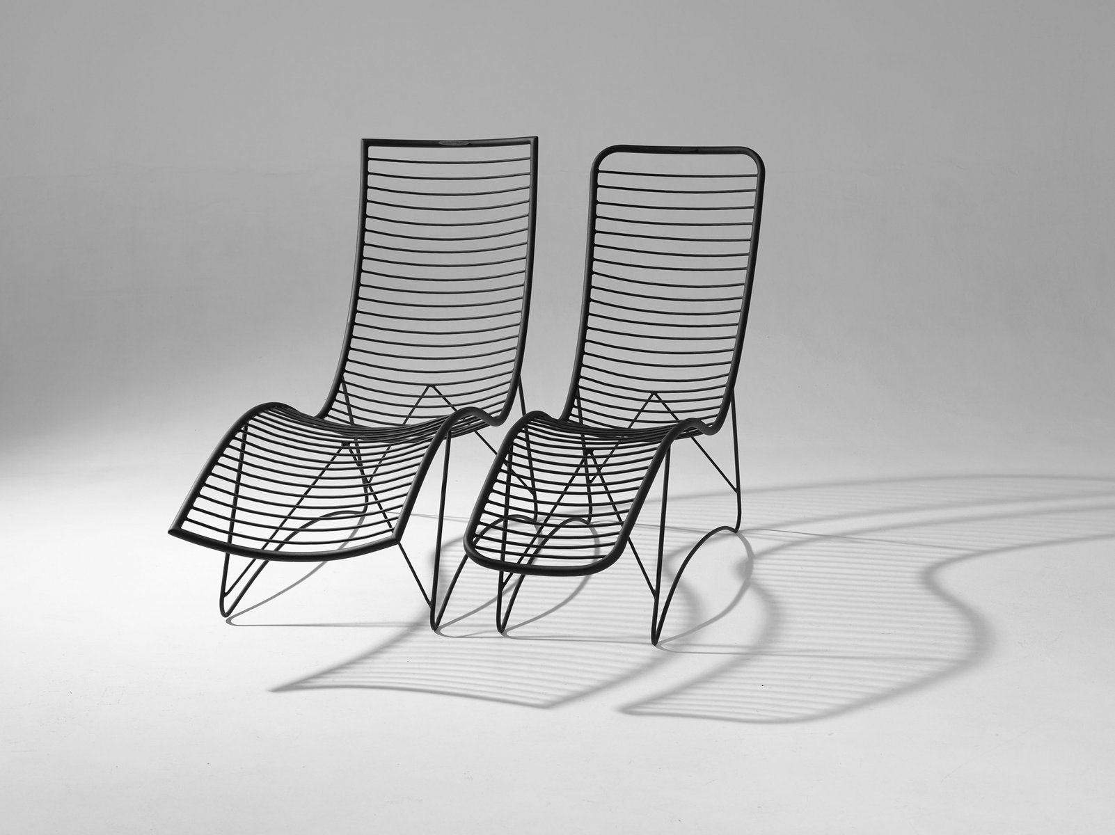 Die Stühle sind ideal für den Innen- und Außenbereich und sehen auf einer Terrasse, einem Patio oder in einem anderen Innenraum großartig aus. Eine der Oberflächen, die zur Auswahl stehen, ist Ferrugrain Black, das sich weich und wildlederartig anfühlt. Sie ist auch als hängende Variante erhältlich.