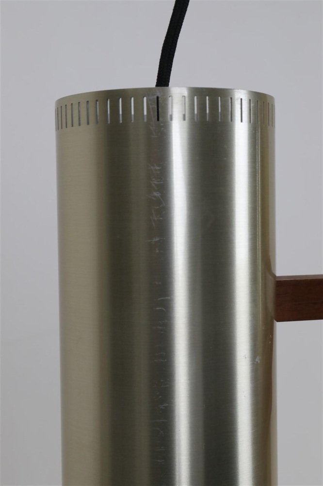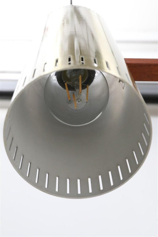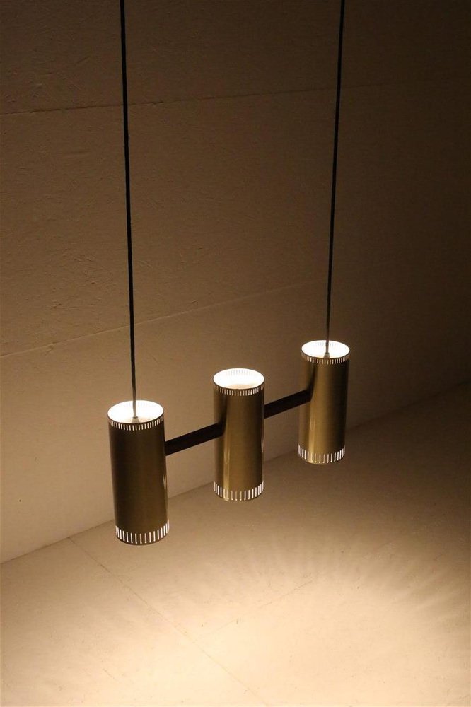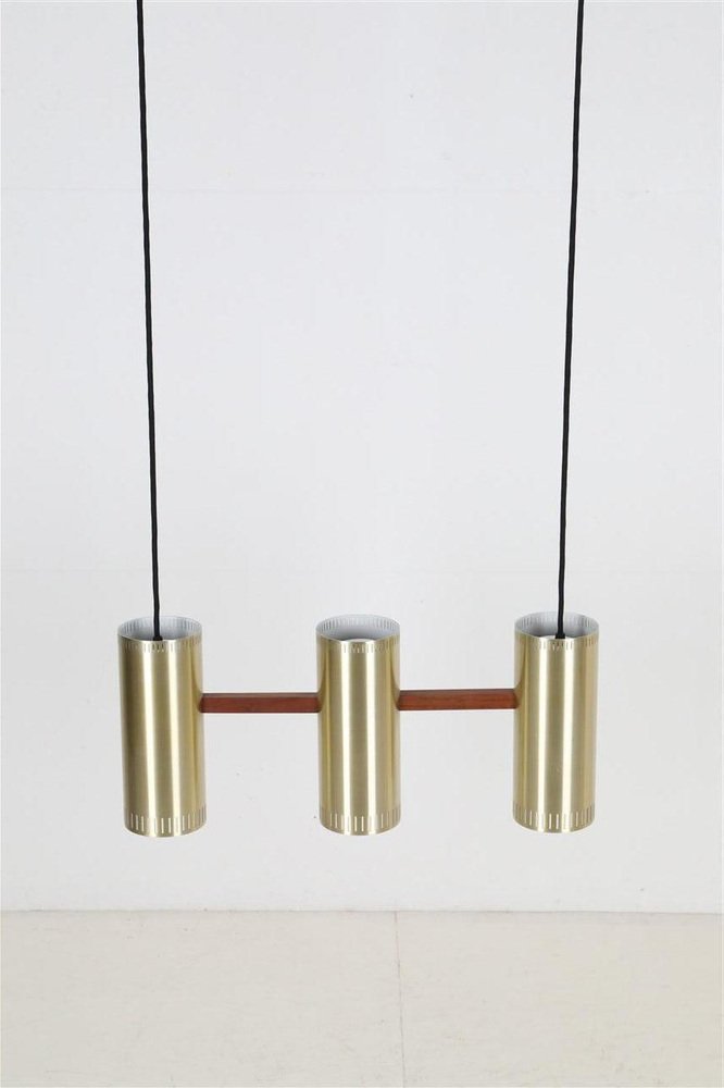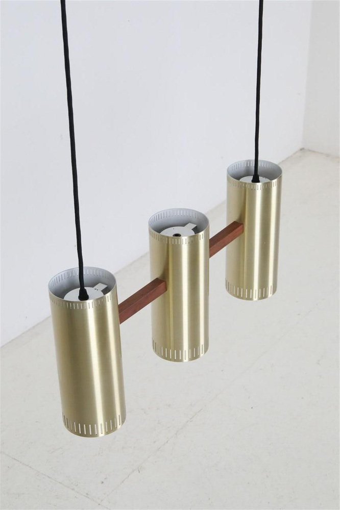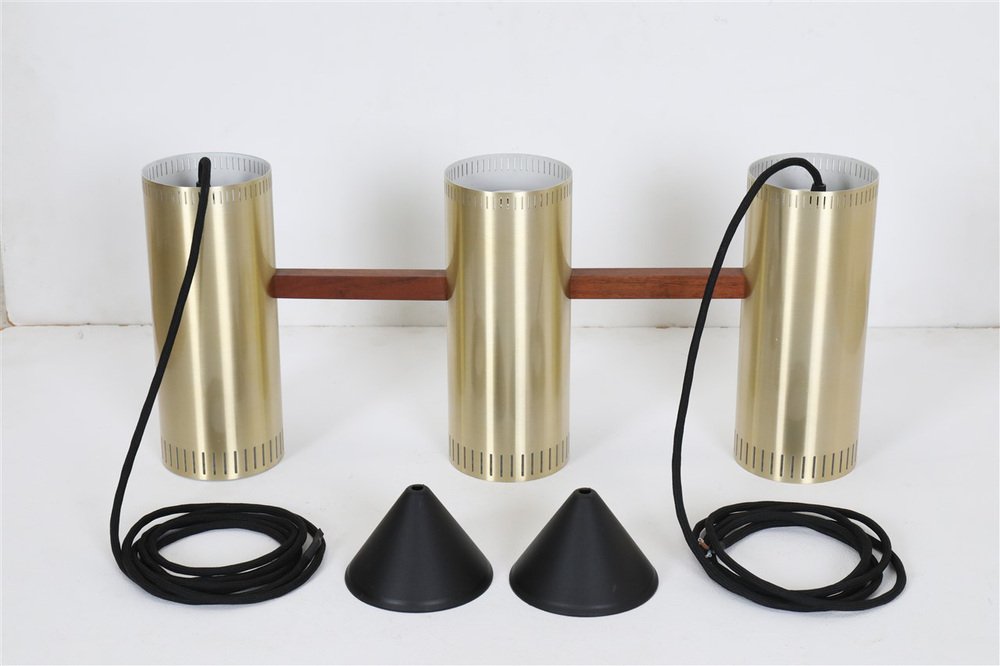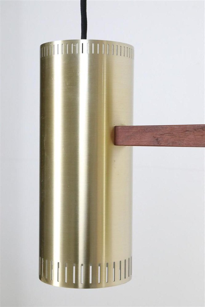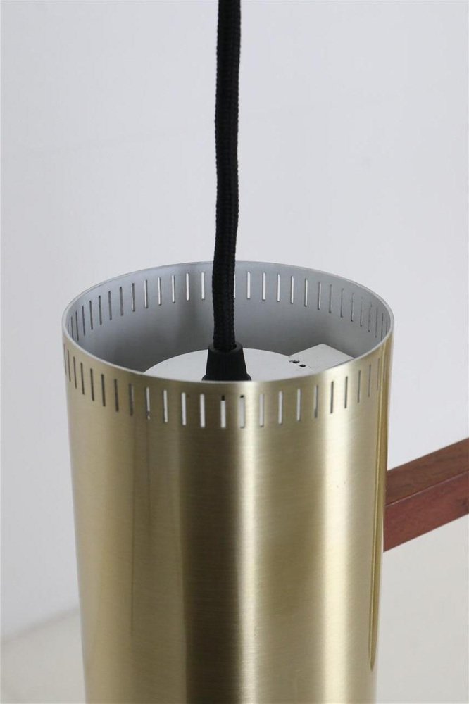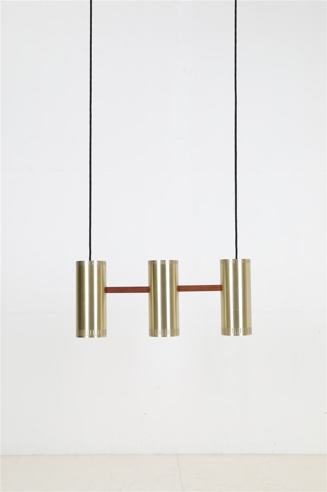 Fog & Mørup “Cylinder III”, Design: Jo Hammerborg, 1960s, Denmark. Very rare model. Materials: brass-colored anodized aluminum, teak. The light is suitable for use with classic and modern (LED) E27 bulbs (110-250V, compatible worldwide). Includes two 2.40m high-quality, soft textile cables, three energy-efficient 230V warm white LED bulbs, two ceiling roses, and strain reliefs for ceiling mounting. The light only needs to be connected to one of the cables. The second cable is not live and is for suspension only.