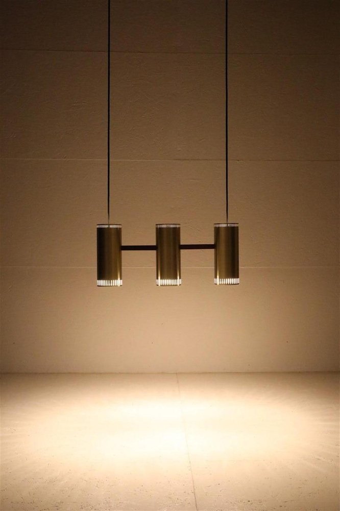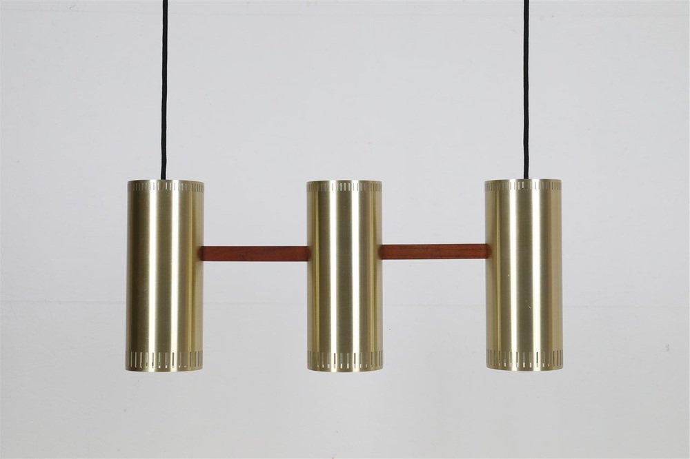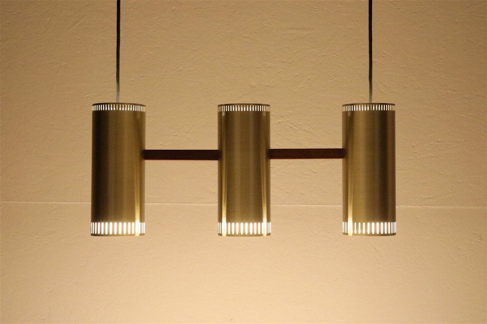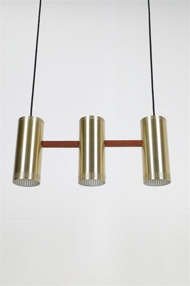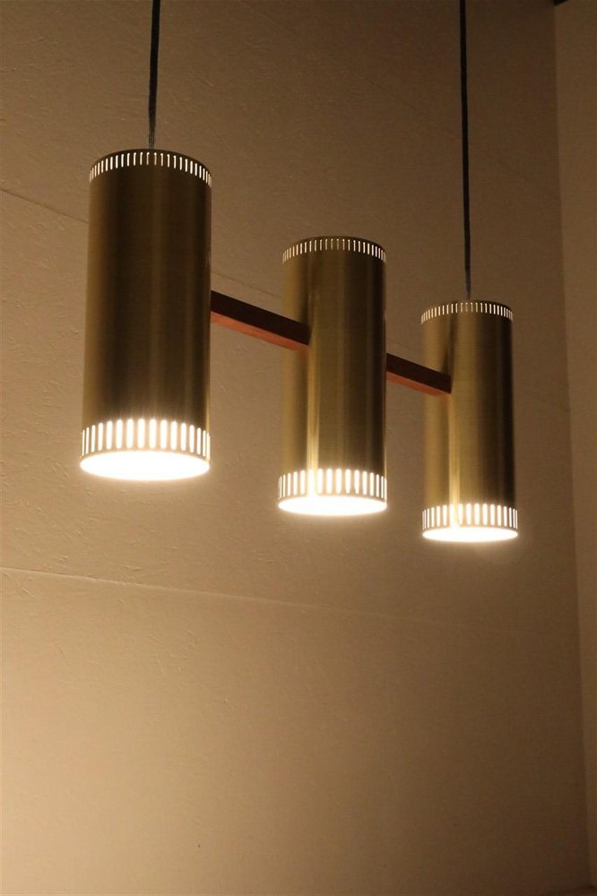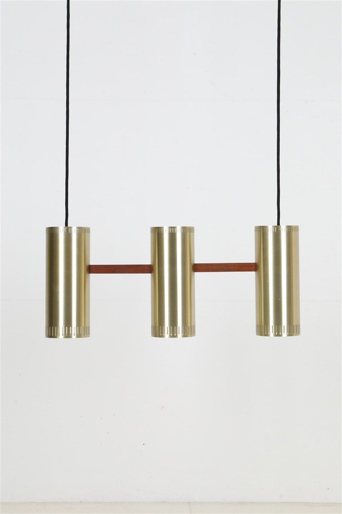 Fog & Mørup „Cylinder III“, Design: Jo Hammerborg, 1960er-Jahre, Dänemark. Sehr seltenes Modell. Materialien: messingfarben eloxiertes Aluminium, Teakholz. Die Leuchte eignet sich für den Gebrauch mit klassischen und modernen (LED) E27-Glühbirnen (110-250V, weltweit anwendbar.). Inklusive 2x 2,40m hochwertigem, weichem Textilkabel, 3x sparsame 230V LED-Glühbirne in warmweiß, 2x Baldachin und Zugentlaster zur Deckenmontage. Die Leuchte muss nur an einem der Kabel angeschlossen werden. Das zweite Kabel führt keinen Strom und dient nur der Aufhängung.